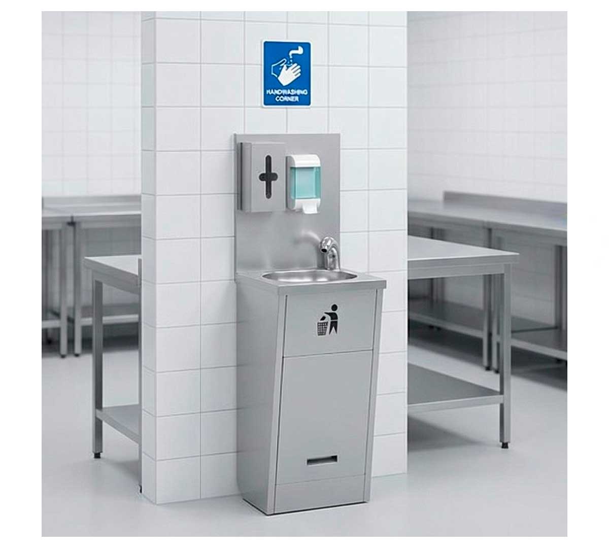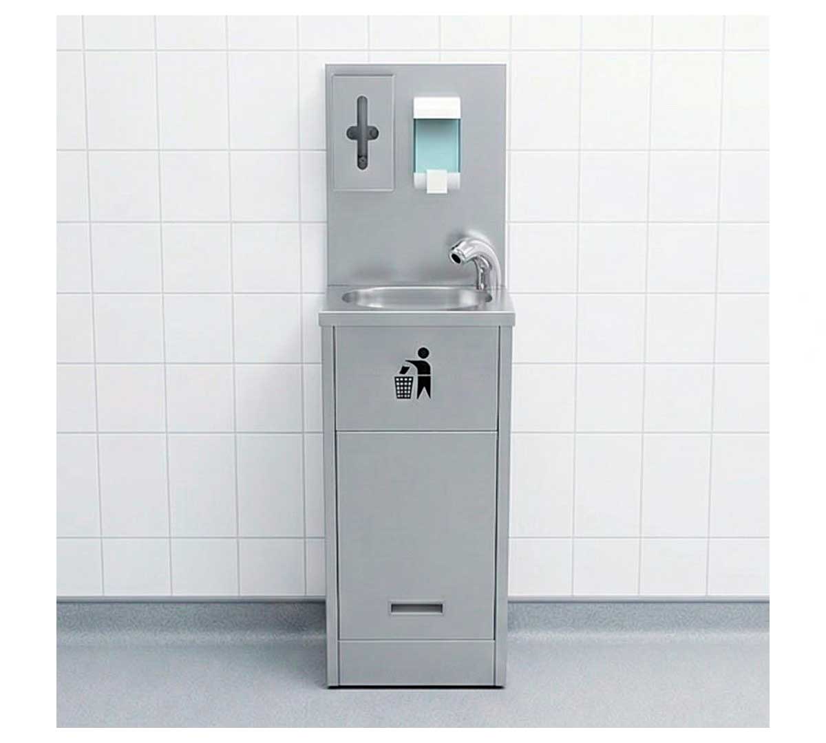 El modelo de lavamanos LGP-44P es un lavamanos completo que incluye una papelera, y un peto trasero con dosificador de jabón y dispensador de toallitas. Se activa de modo electrónico.