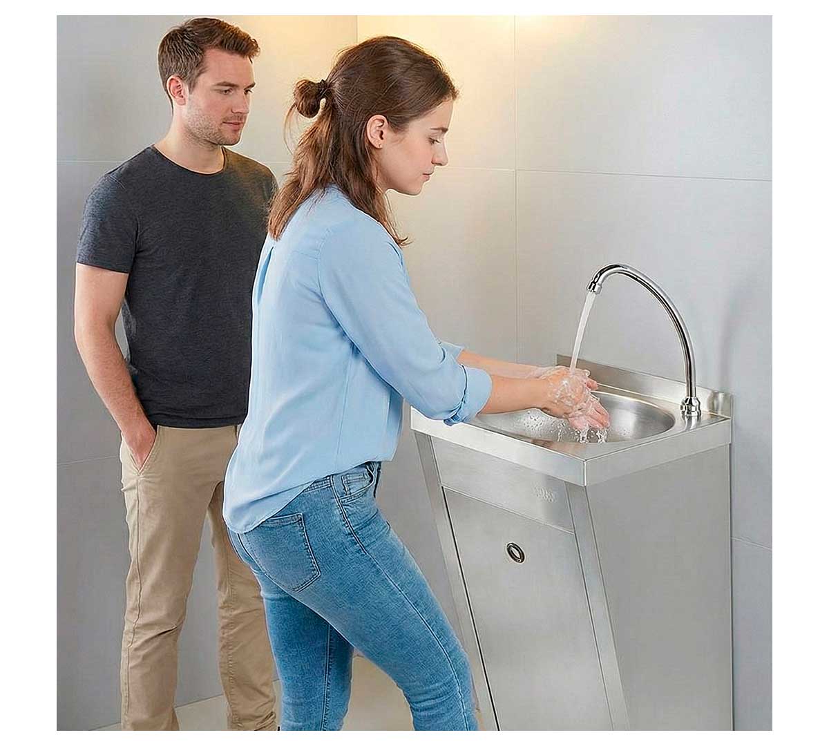 Lavamanos de pie construido en acero inox. Equipado con pulsador temporizador de fácil accionamiento y conexión estándar. Con regulador de temperatura para agua fría y caliente.