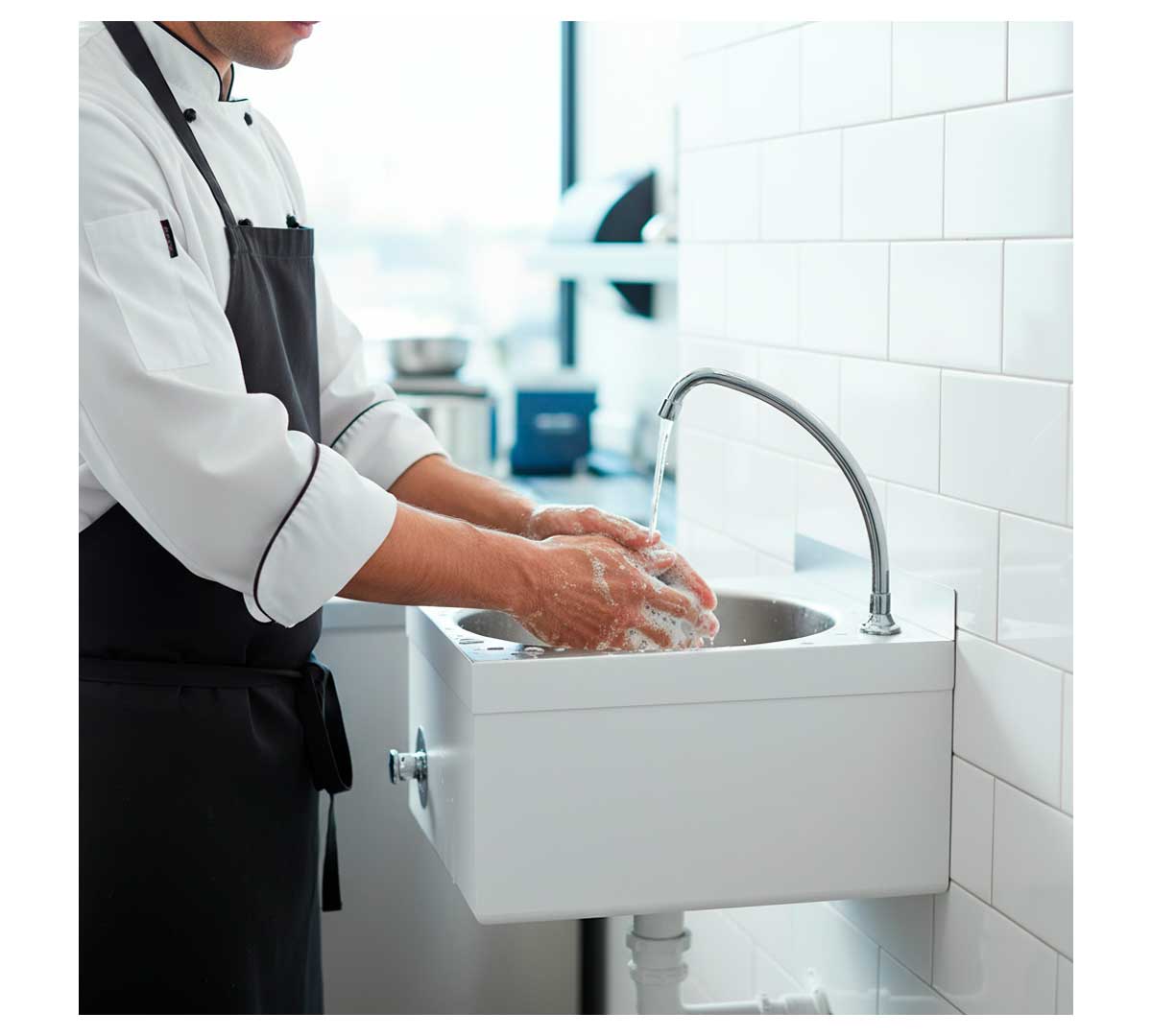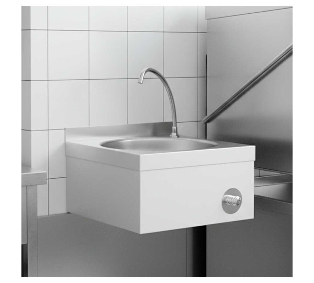 Lavamanos de sobremesa mural. Fabricado en acero inox, con pulsador temporizador de fácil accionamiento y conexión estándar. Dispone de regulador de temperatura para agua fría y caliente.