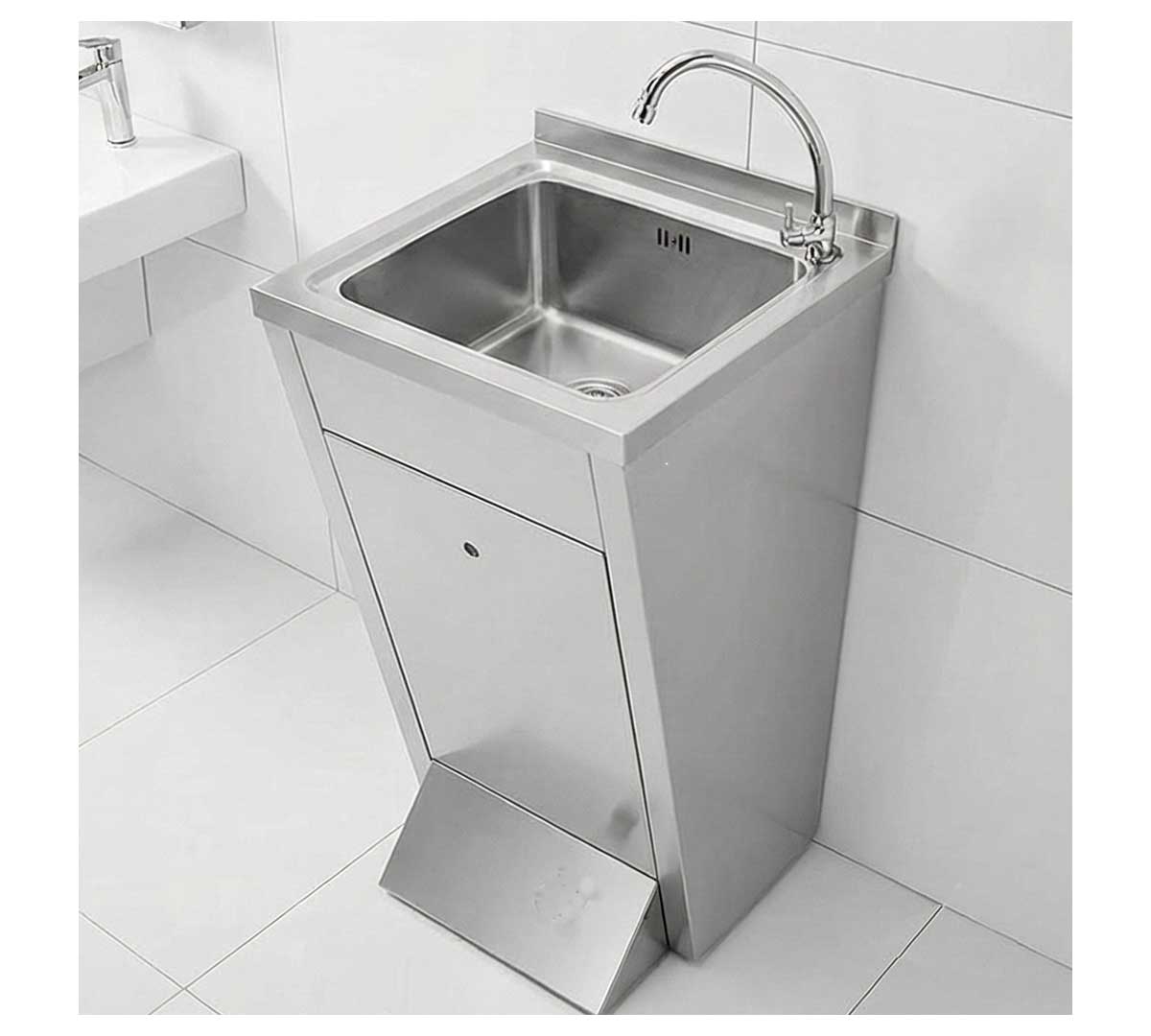 Lavamanos de pie con grifo electrónico, que se acciona mediante sensor para mayor ahorro de agua. Construido en acero inoxidable satinado. Con peto posterior de 30 mm. Dispone de cubeta con válvula de desagüe y puerta frontal registrable.