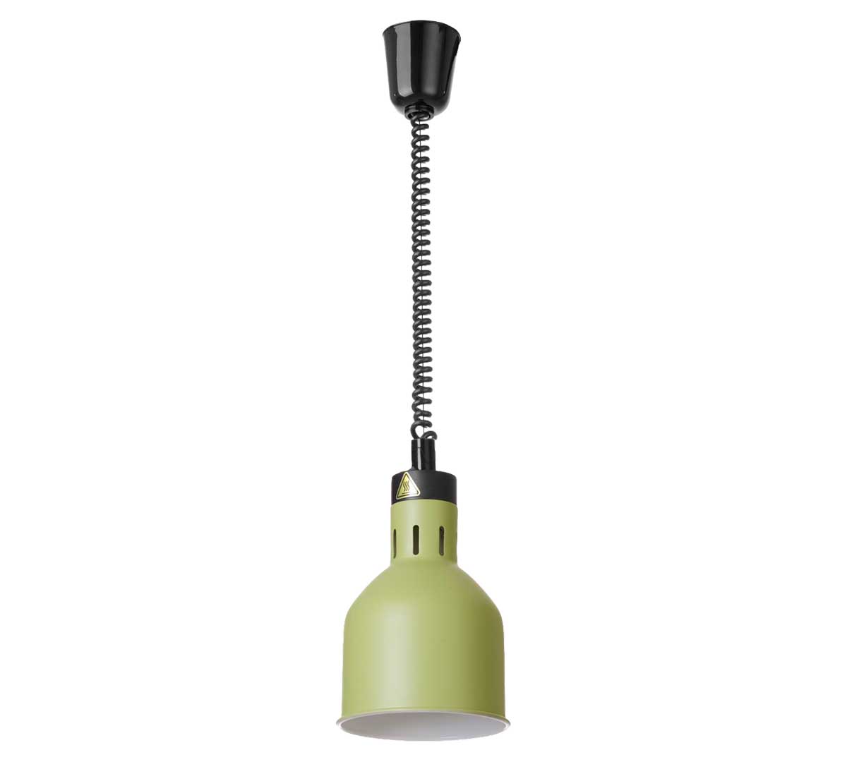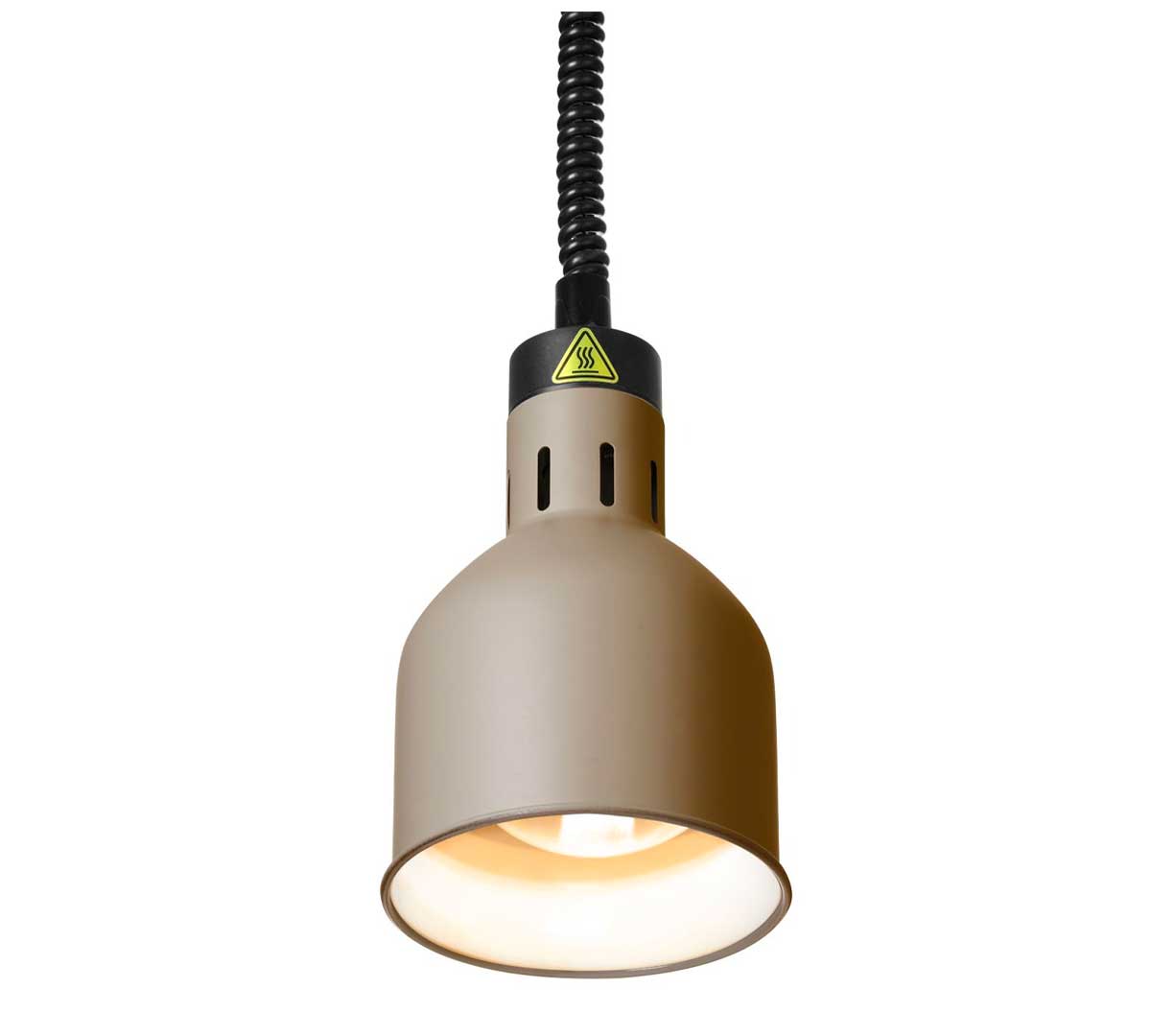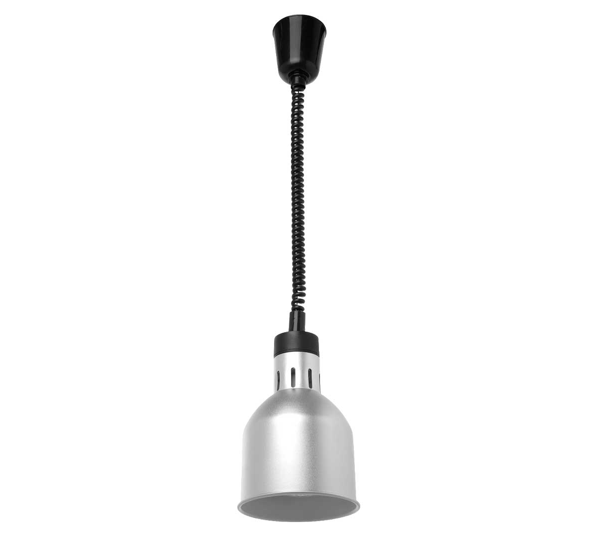 Lámpara de calentamiento por infrarrojos cilíndrica diseñada mantener la comida caliente. Se fija al techo. El cable es extensible de 0,7 a 1,5 m. Tiene interruptor de encendido y apagado. Está disponible en color plata, negro o cobre. La bombilla de luz blanca está incluida.