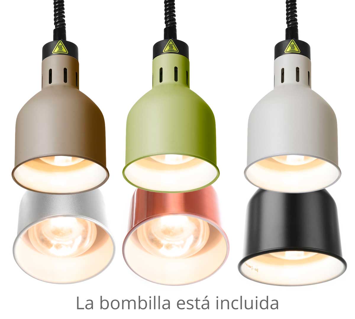Incluye una bombilla infrarroja incandescente E27 irrompible de máximo 250 W, adecuada para mantenimiento térmico de alimentos.