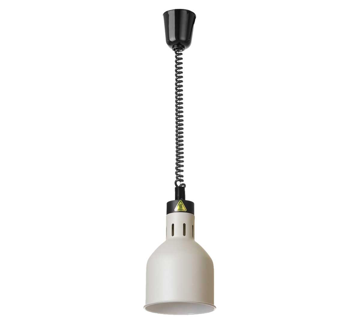 La Lámpara de Calentamiento con Cable Extensible Cilíndrica de Hendi está diseñada para colgarse en el techo y es regulable en altura para mantener los platos calientes.