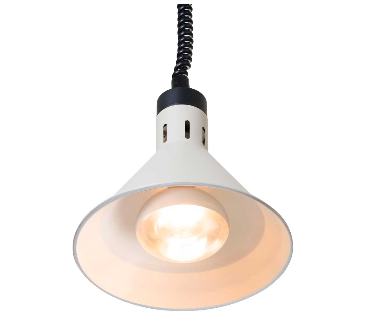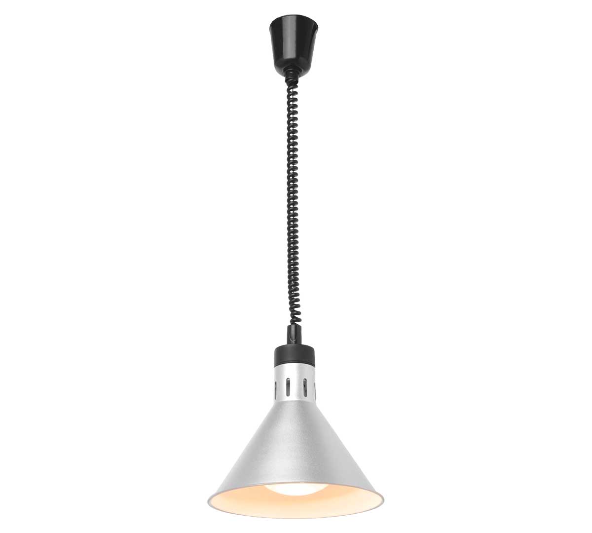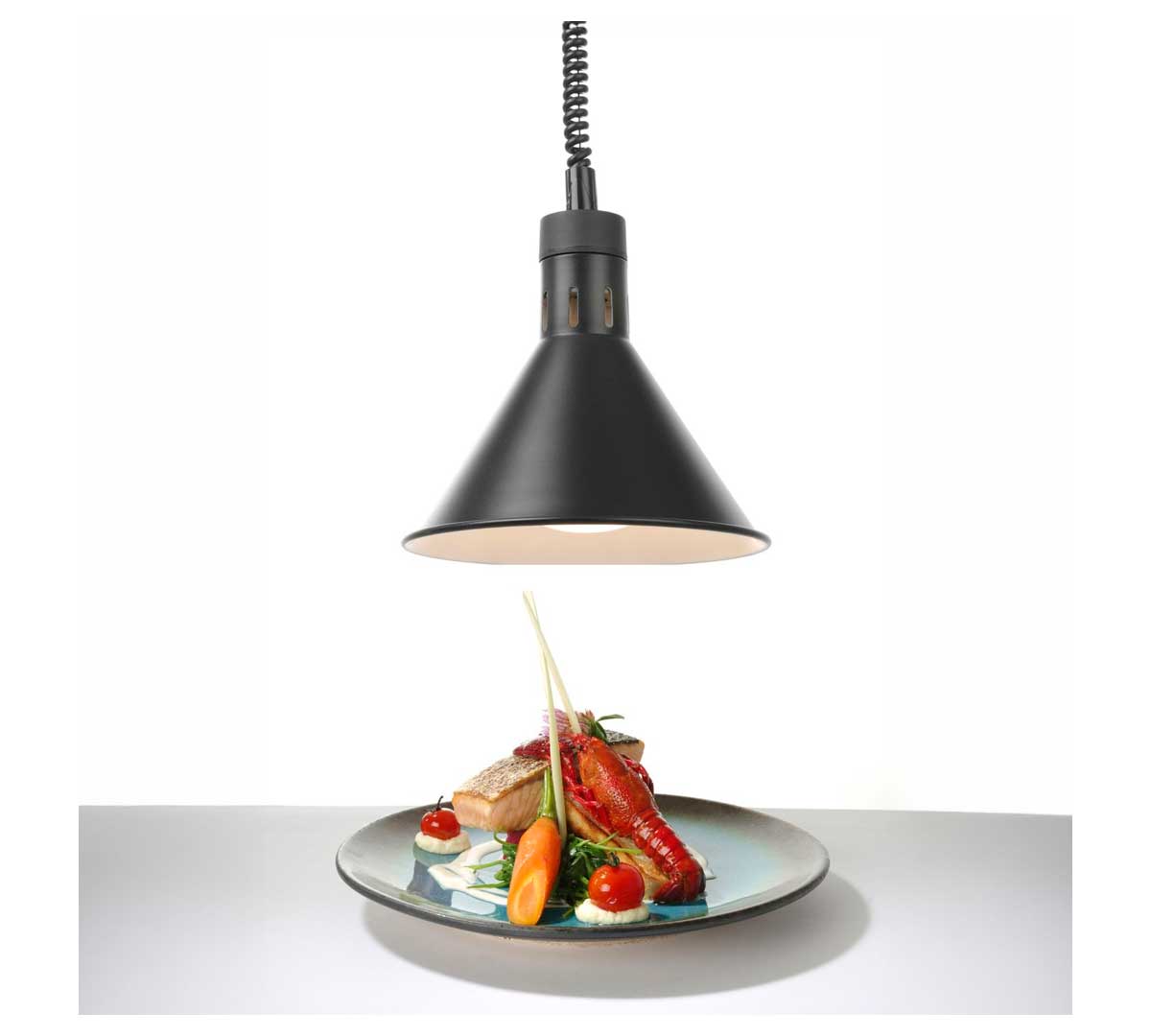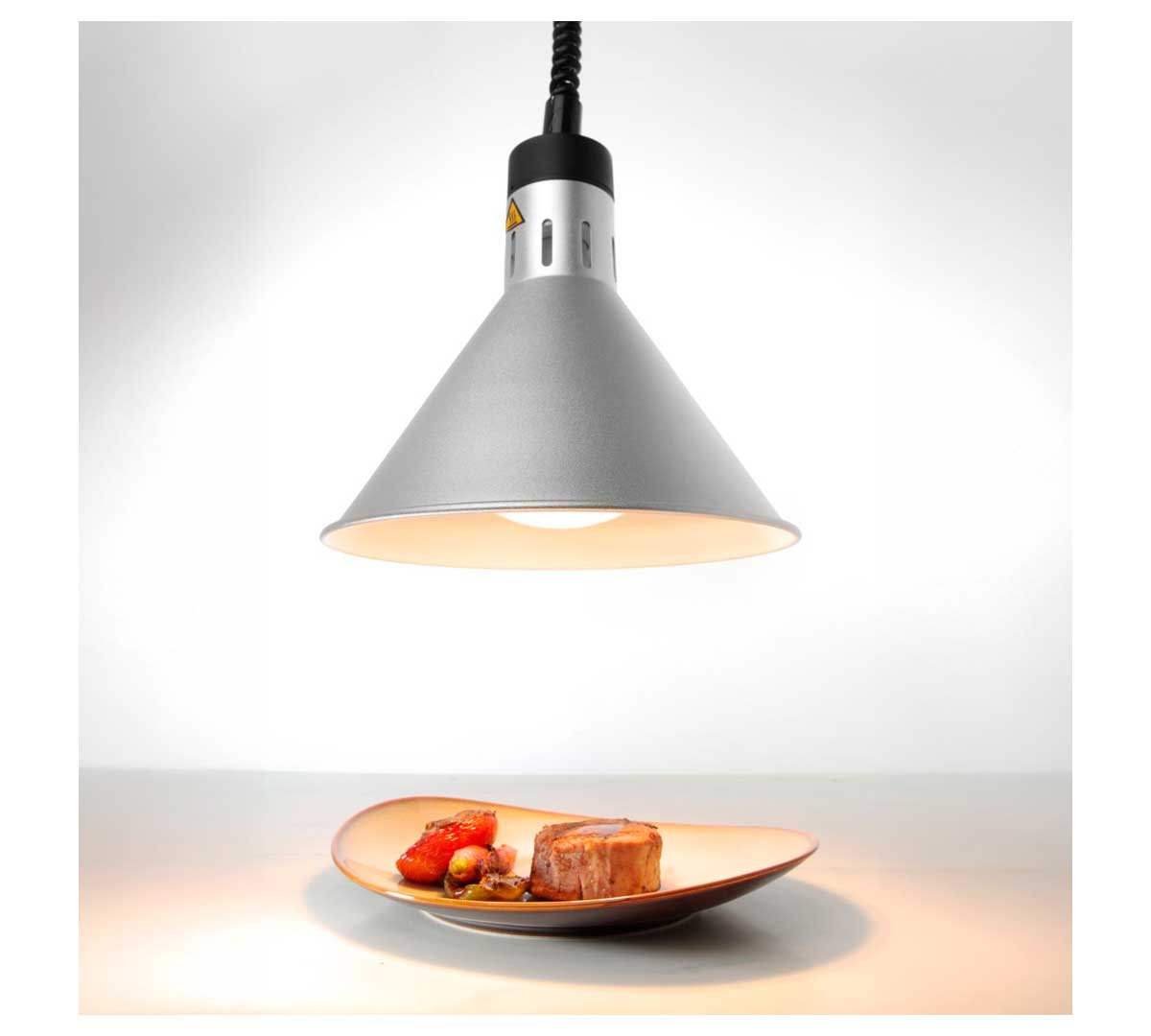 Lámpara de calentamiento por infrarrojos cónica diseñada mantener la comida caliente. Se fija al techo. El cable es extensible de 70 a 150 cm. Tiene interruptor de encendido y apagado. Está fabricada en aluminio. La bombilla de luz blanca está incluida.