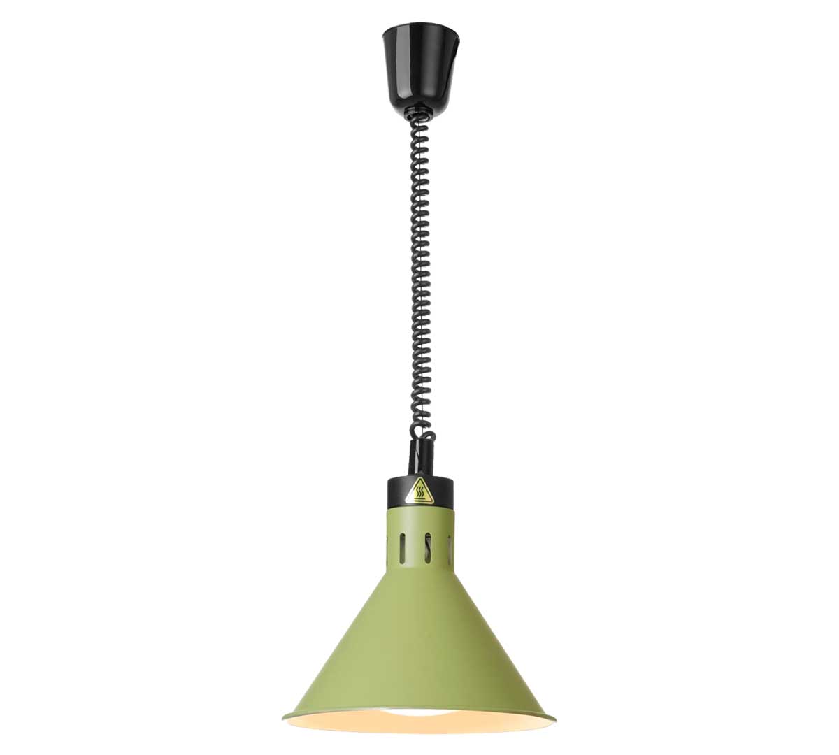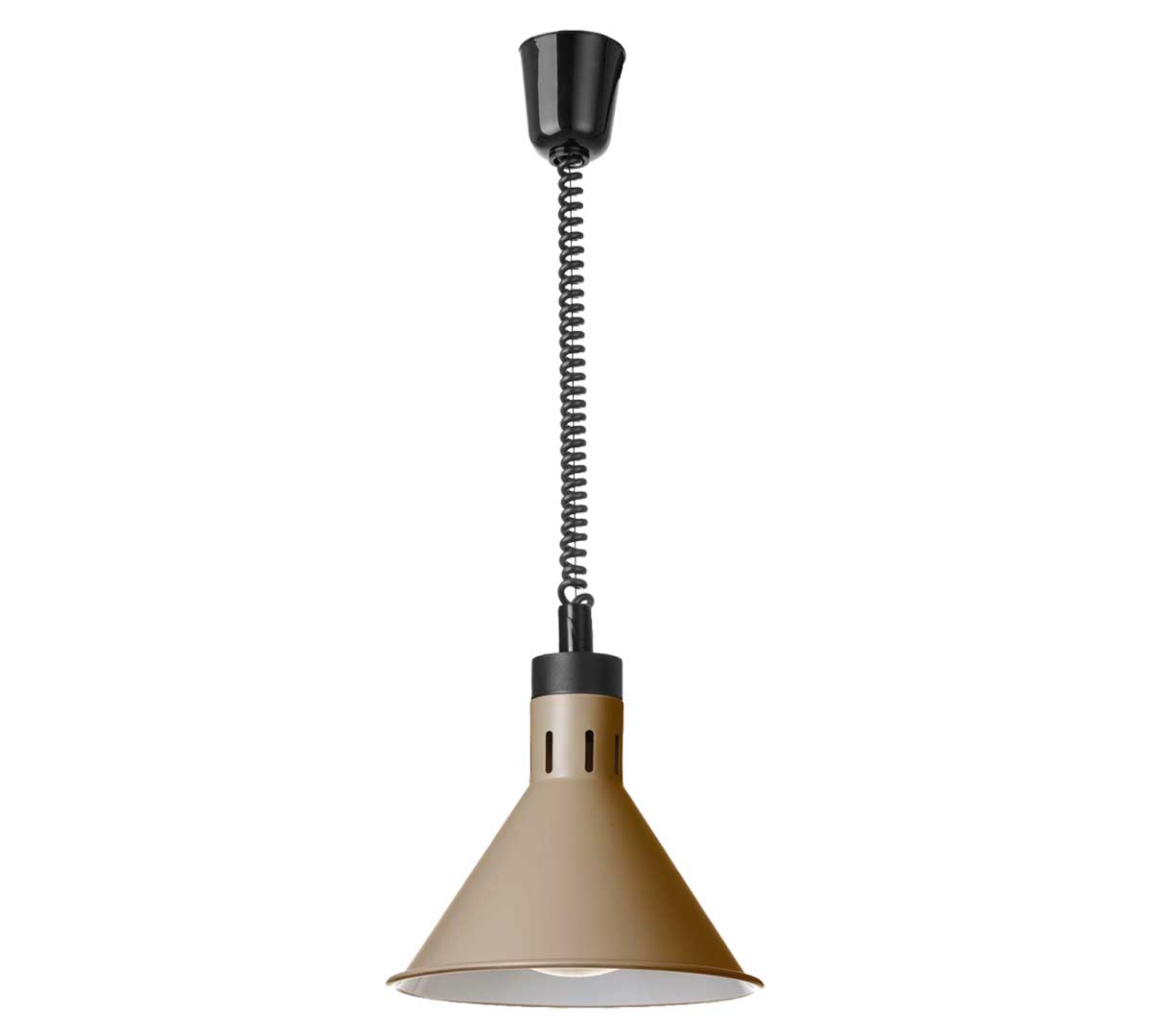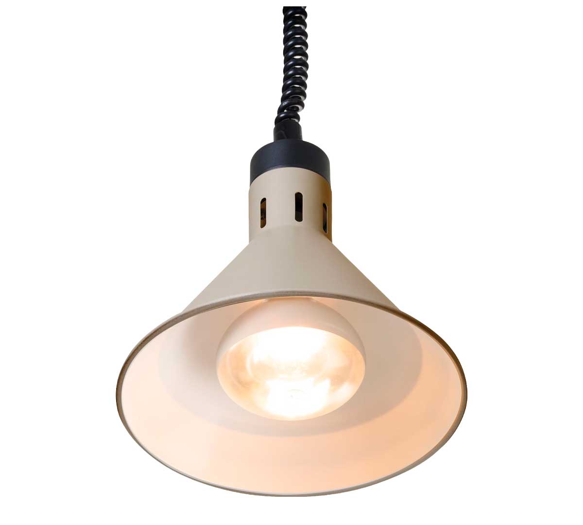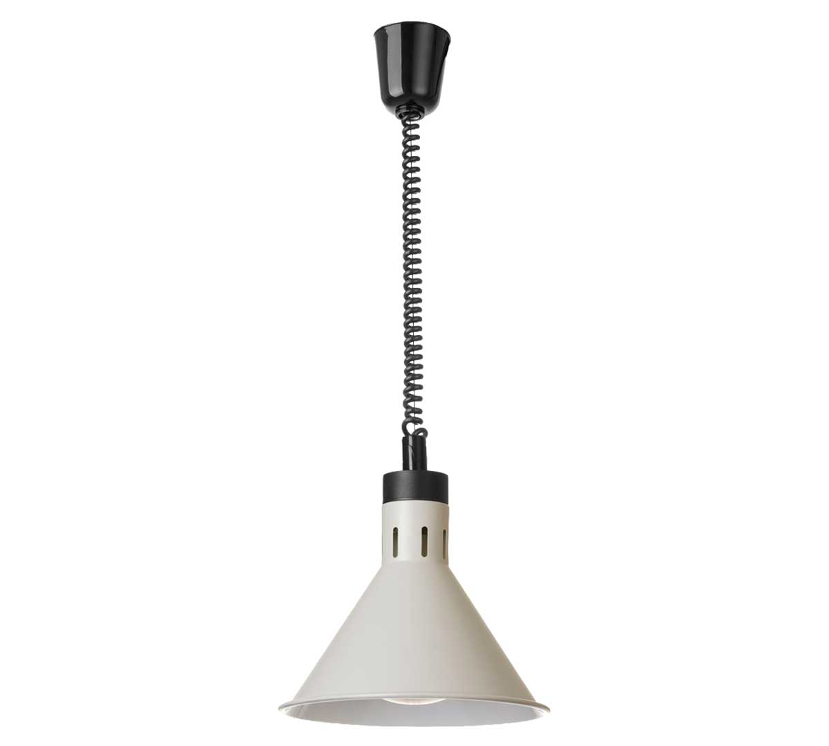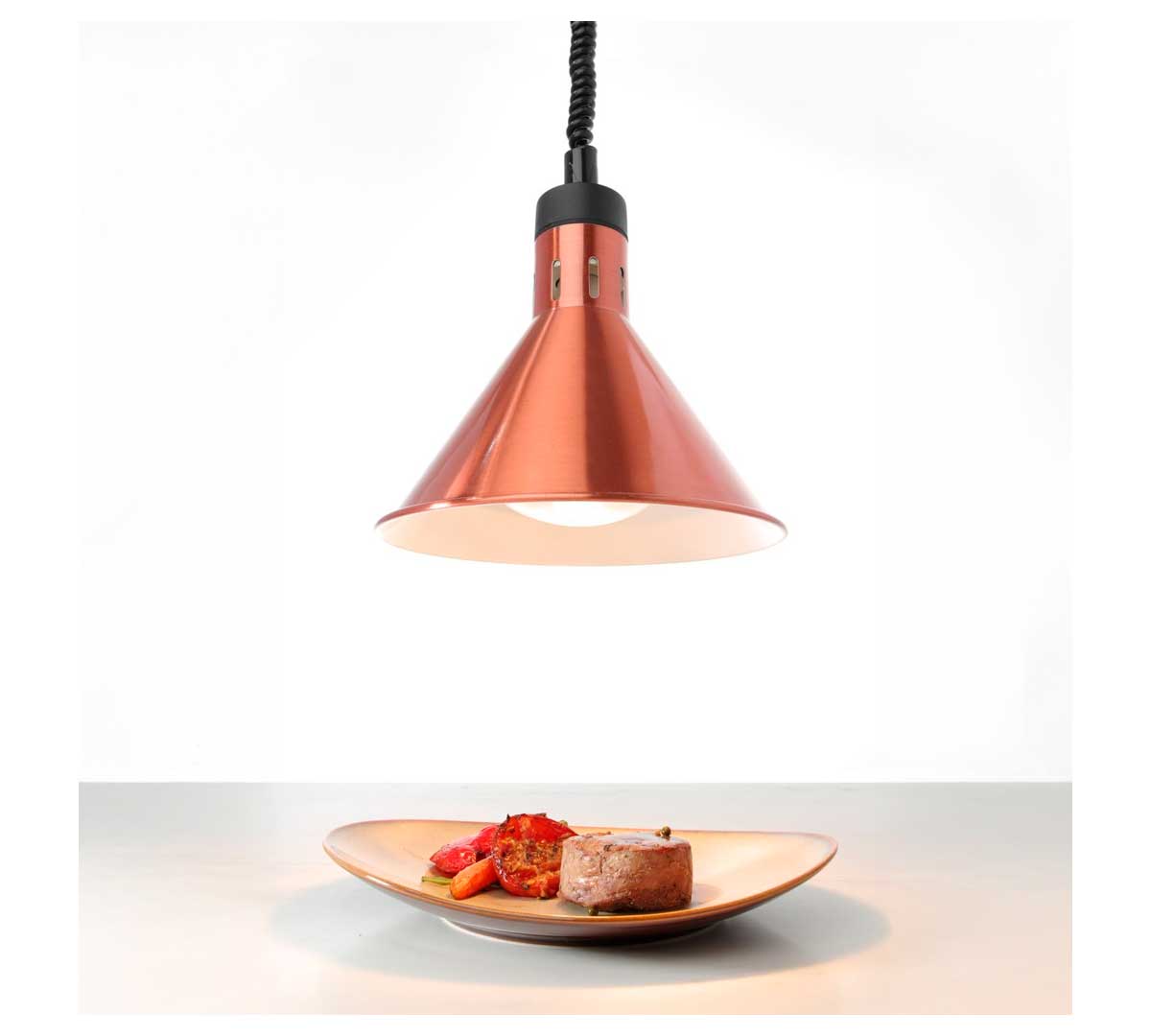 Lámpara de calentamiento por infrarrojos cónica diseñada mantener la comida caliente. Se fija al techo. El cable es extensible de 70 a 150 cm. Tiene interruptor de encendido y apagado. Está fabricada en aluminio. La bombilla de luz blanca está incluida.