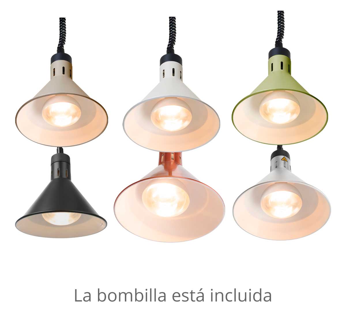 Incluye una bombilla infrarroja incandescente E27 irrompible de máximo 250 W, adecuada para mantenimiento térmico de alimentos.