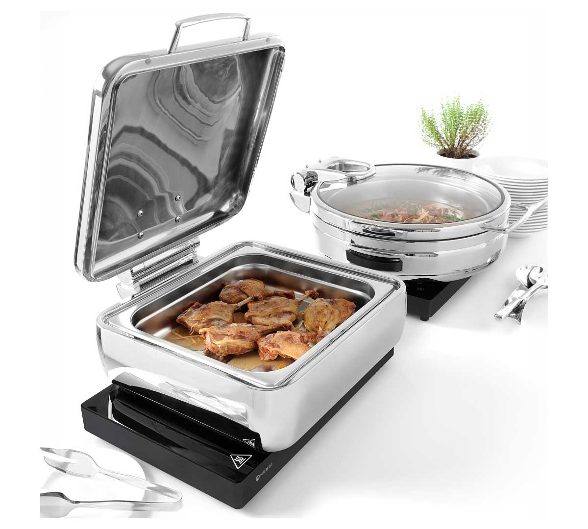 La Placa Caliente de Inducción Kitchen Line de Hendi tiene la estructura muy plana con bastidor de acero inoxidable con revestimiento en negro. Indicada para chafing dishes.
