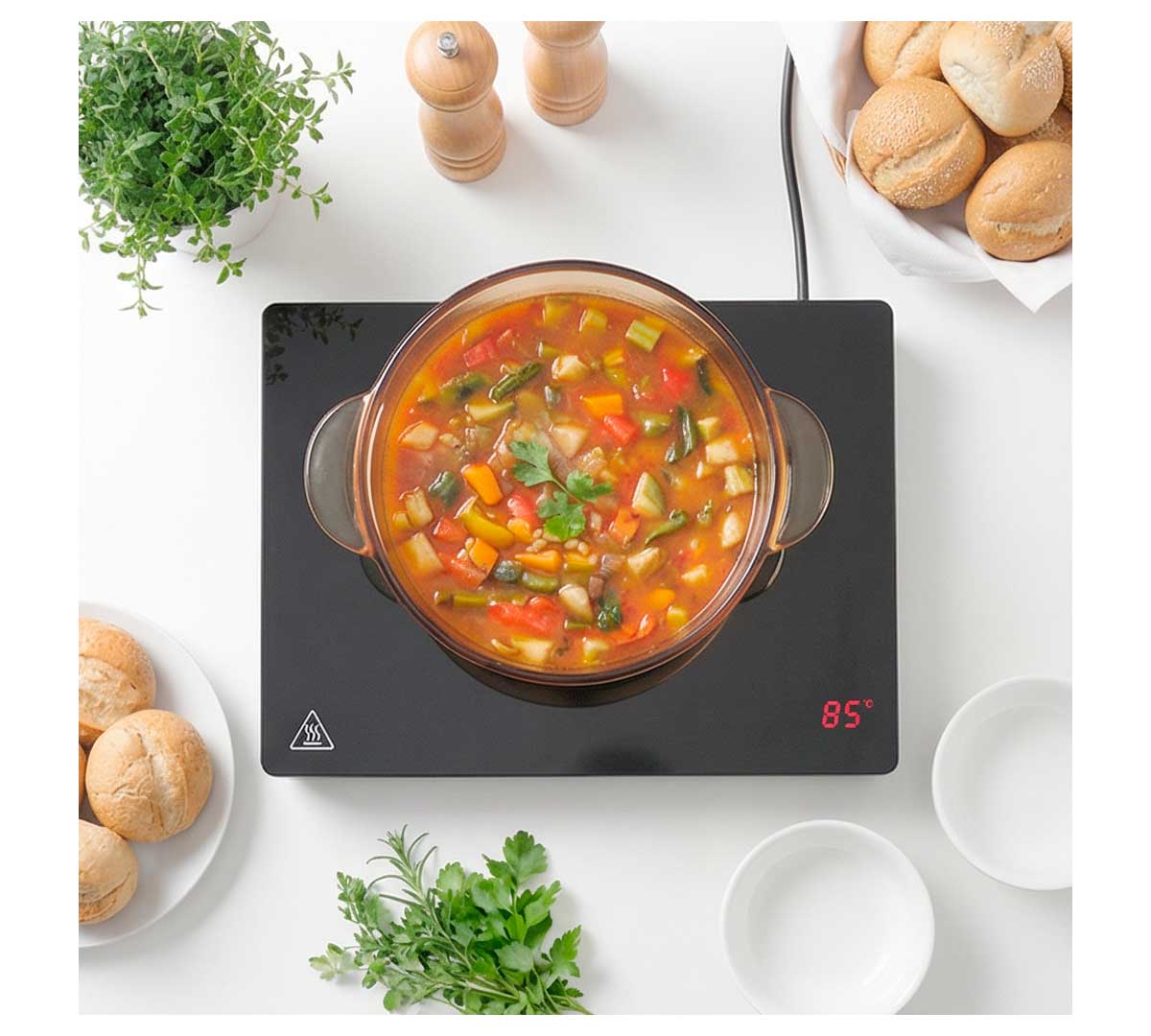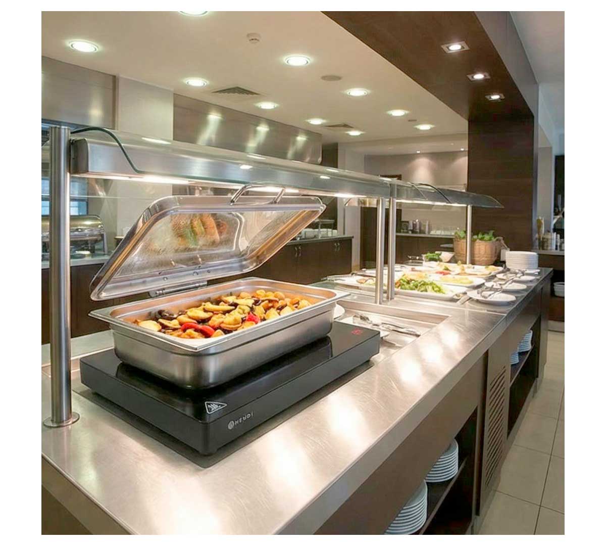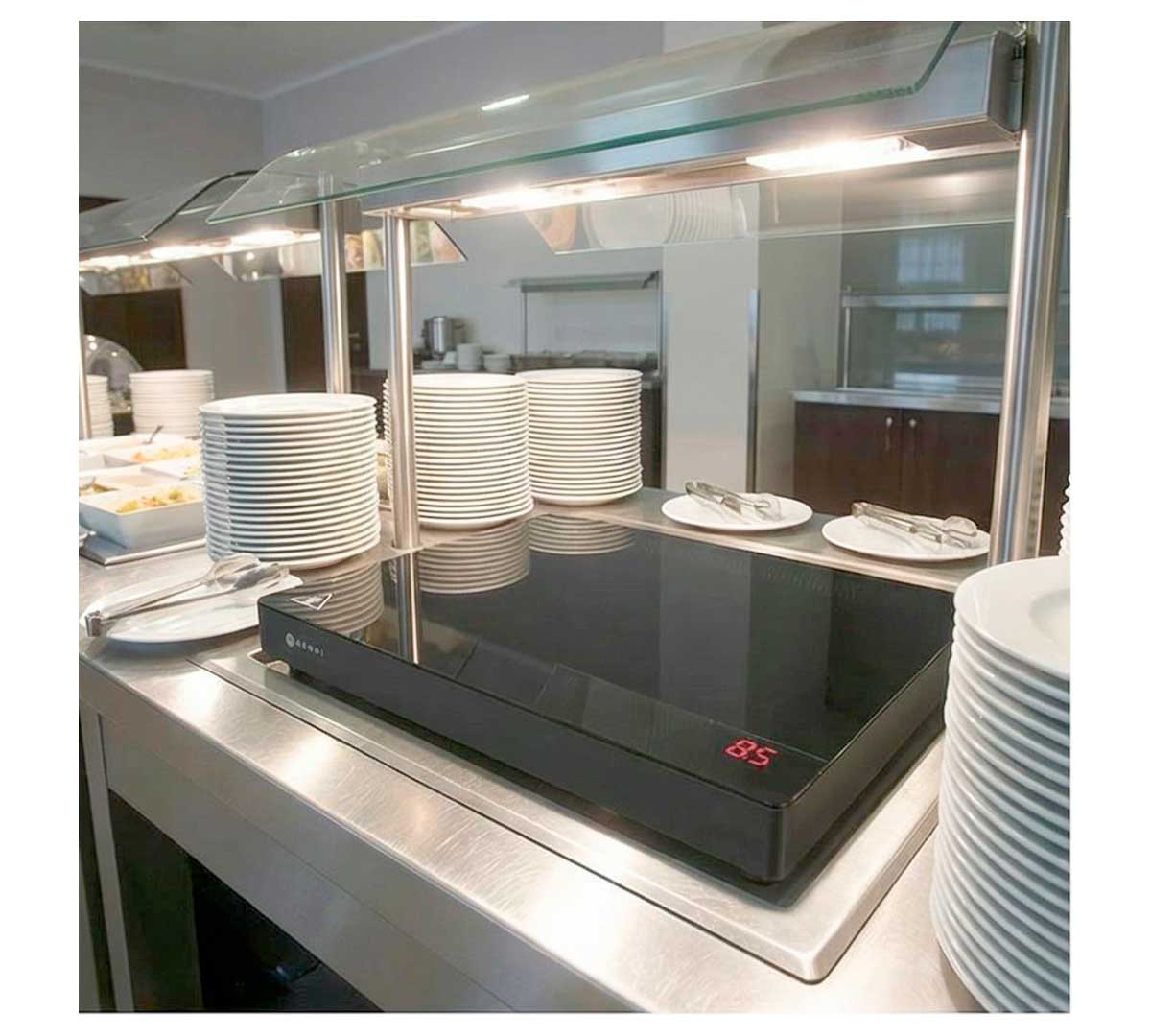 Placa de inducción que mantiene la comida caliente. Con superficie de vidrio cerámico con la pantalla digital integrada. Tiene potencia ajustable en 11 niveles. Permite un rango de temperatura de 40 a 100 ºC. Apta para recipientes con un diámetro de fondo de entre 12 y 26 cm. También se puede utilizar con una bandeja gastronorm hasta GN 1/2.