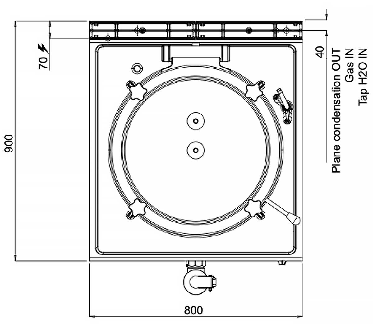 Marmita de gran capacidad en acero inoxidable. Calentamiento directo a gas. Con sistema de encendido eléctrico,. Tiene grifos de agua fría y caliente. Permite la descarga fácil y la regulación precisa de la temperatura.
