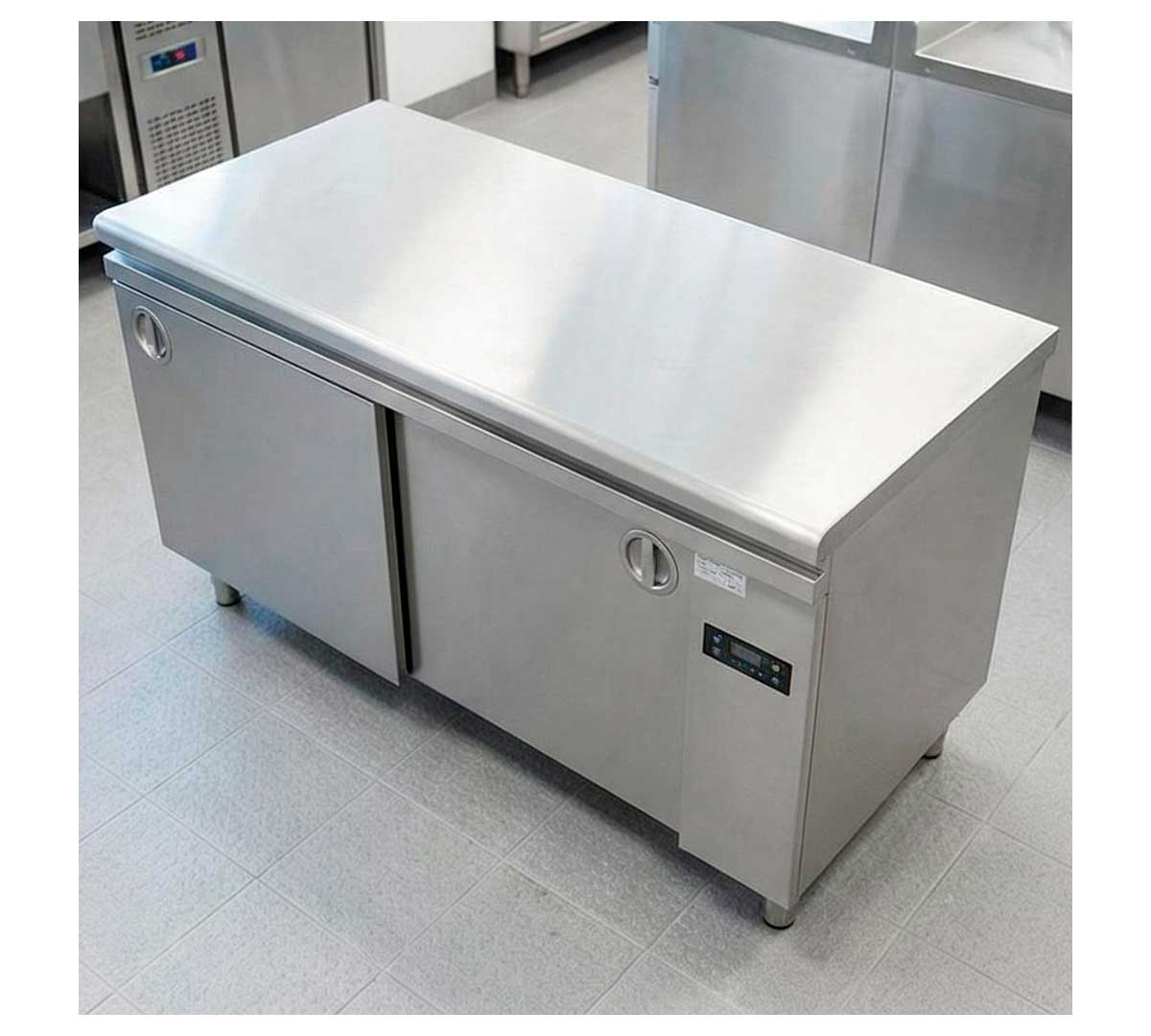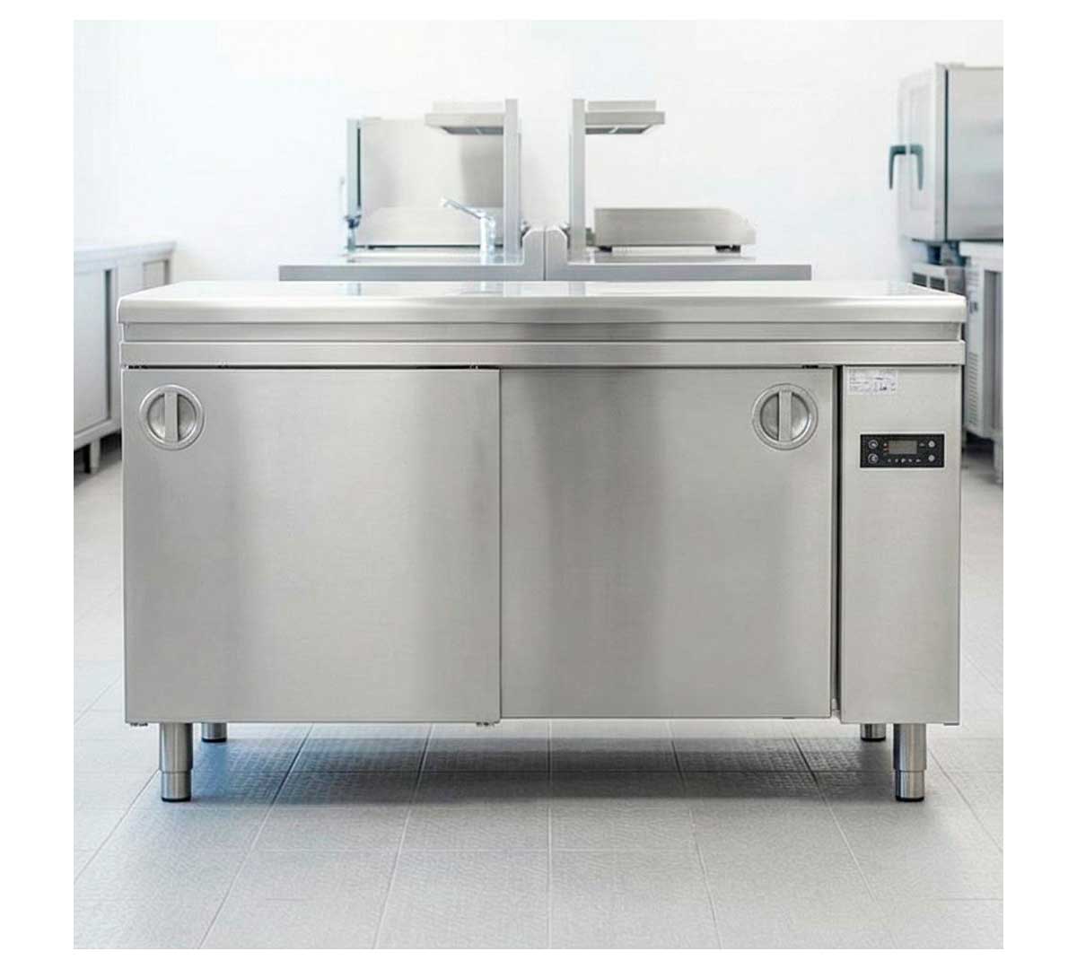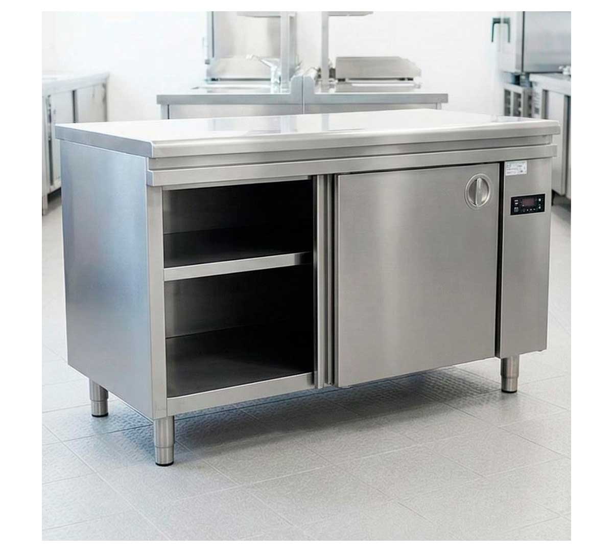 Mesa caliente central fabricada en acero inoxidable. Está equipada con patas ajustables y termostato digital. Tiene 2 puertas correderas. El ventilador es por tiro forzado. Tiene un fondo de 60 cm.