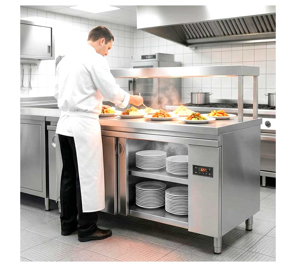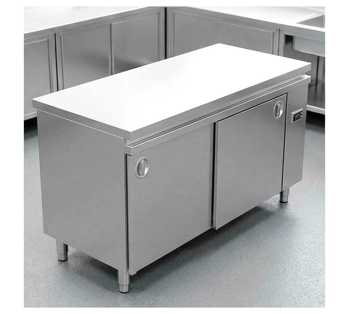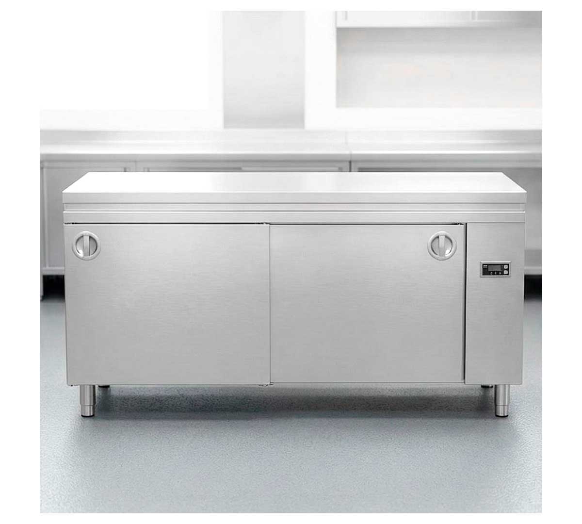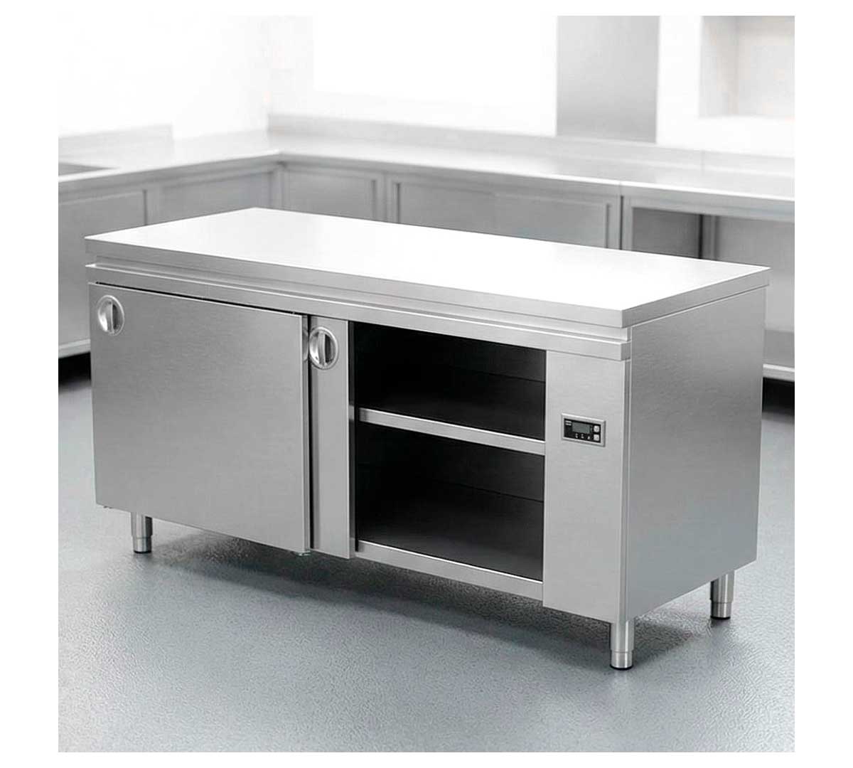 Mesa caliente central fabricada en acero inoxidable. Está equipada con patas ajustables y termostato digital. Tiene 2 puertas correderas. El ventilador es por tiro forzado. Tiene un fondo de 70 cm.