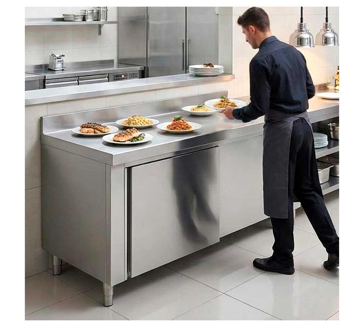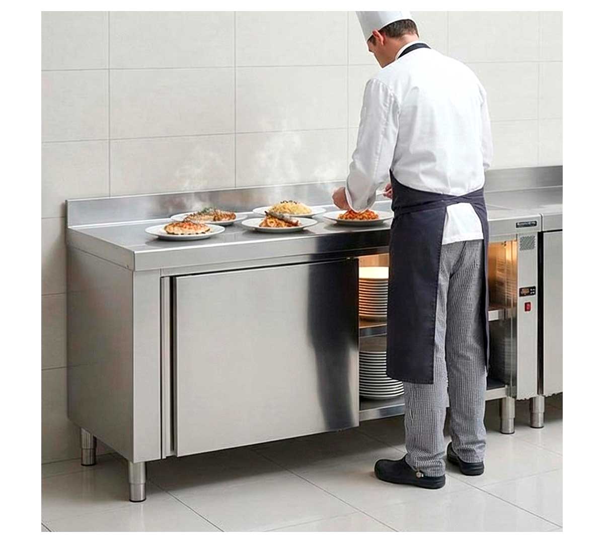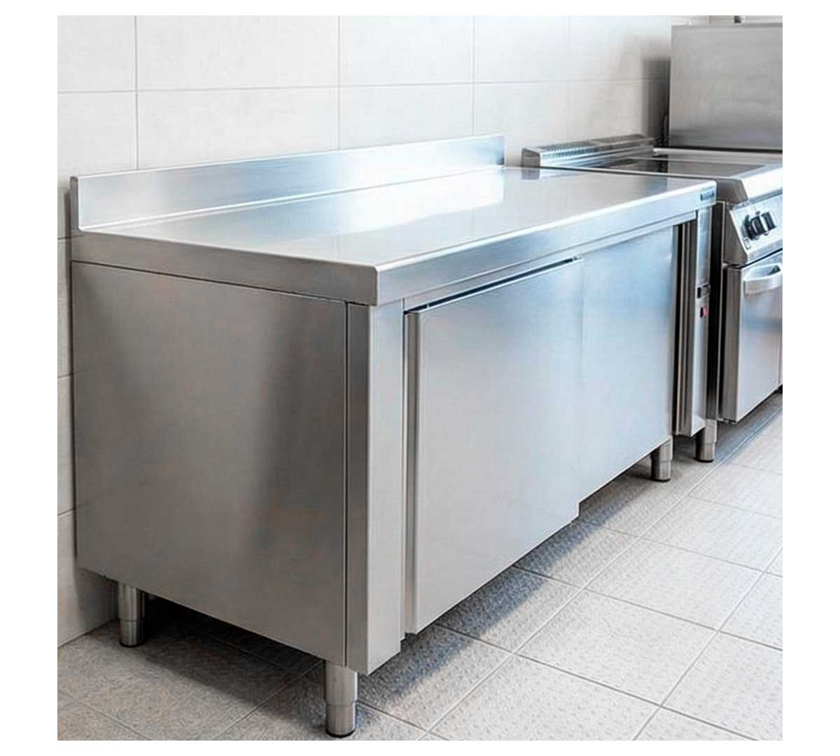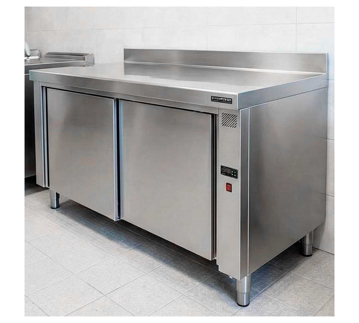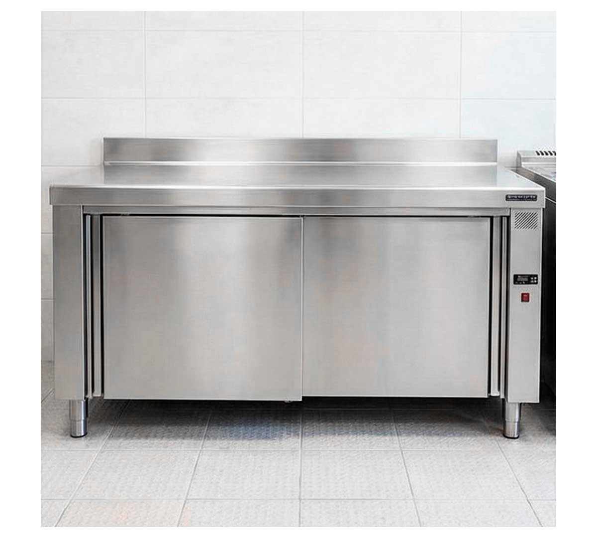 Mesa caliente mural con 2 puertas correderas. Está fabricada en acero inoxidable. Diseñada para el mantenimiento en caliente de los platos antes del servicio. Equipada con panel de mandos con interruptor luminosos y termostato digital. Tiene un fondo de 70 cm y peto posterior de 10,5 cm.