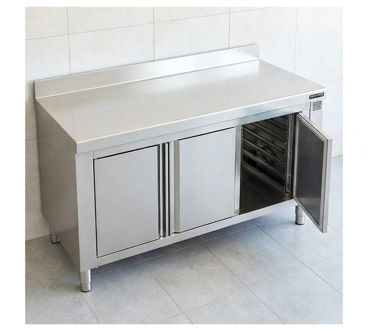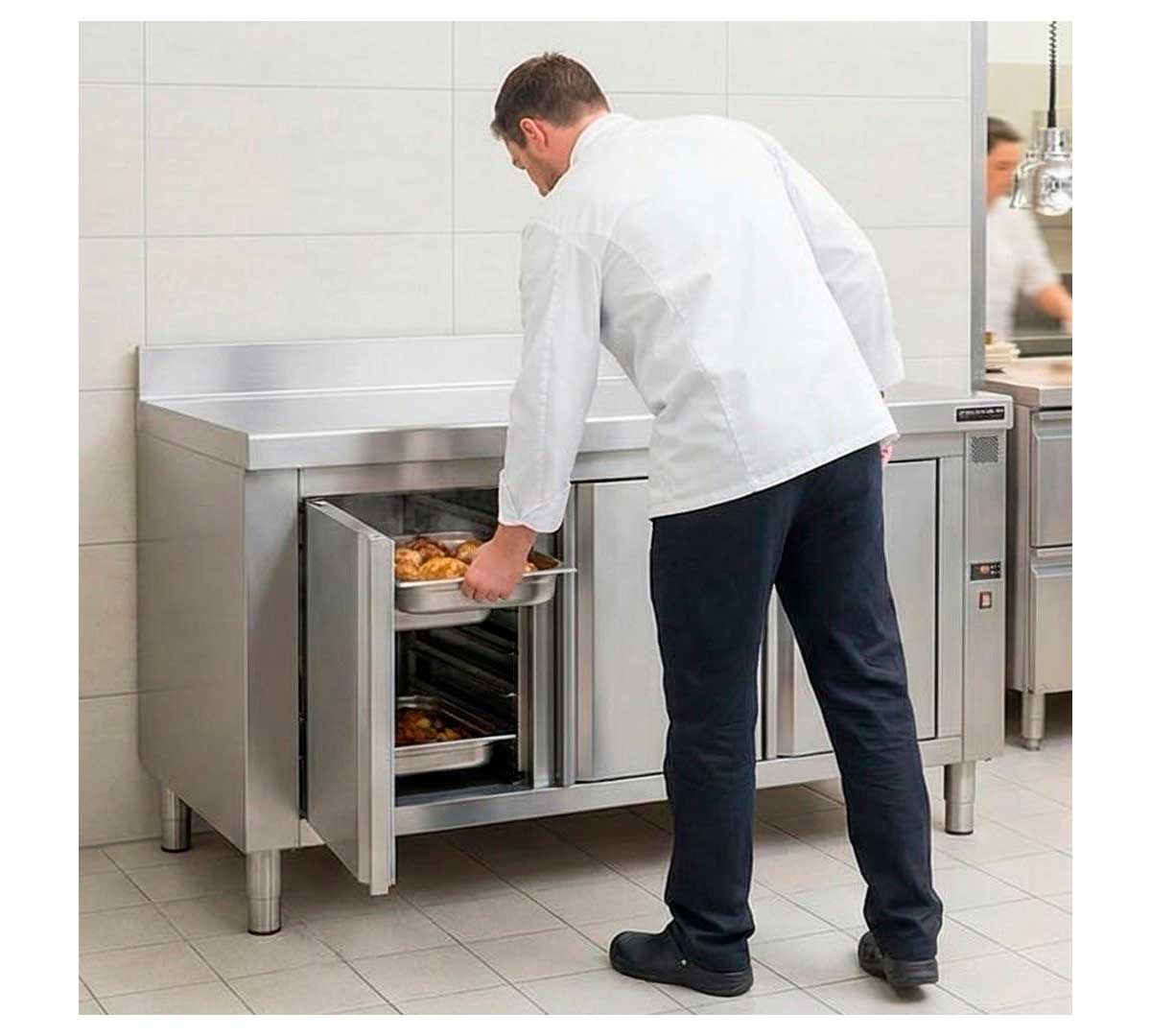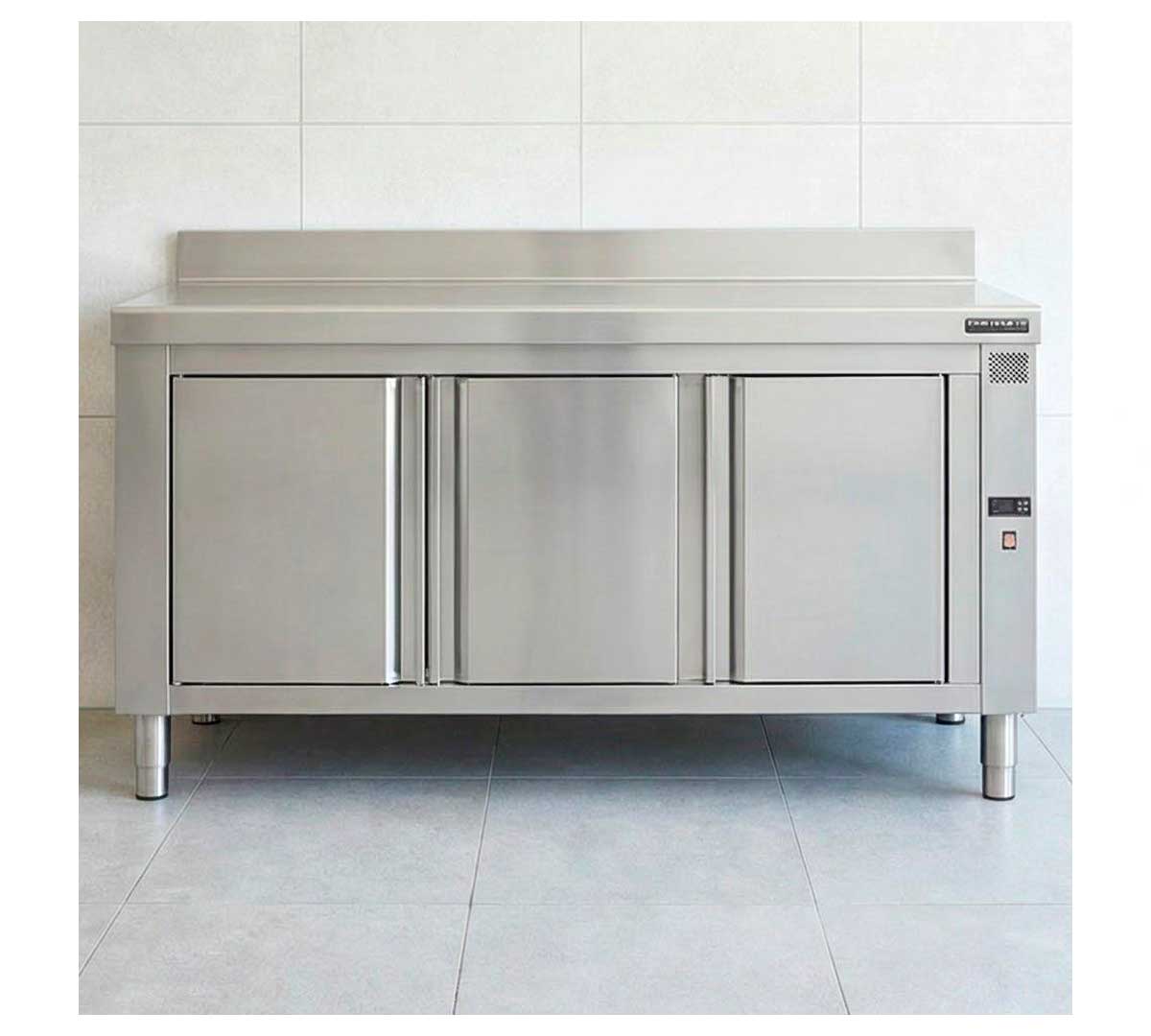 Mesa caliente mural con guías. Ideal para el almacenamiento y conservación en caliente de alimentos preparados en recipientes GN 1/1. Tiene reserva con calor seco. Equipada con termostato digital de 0 a 90 ºC. Con peto posterior de 10,5 cm.