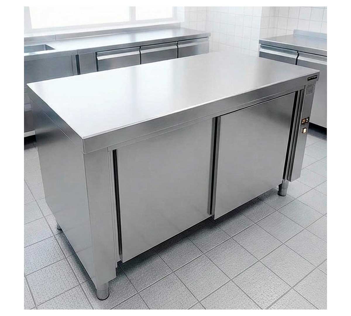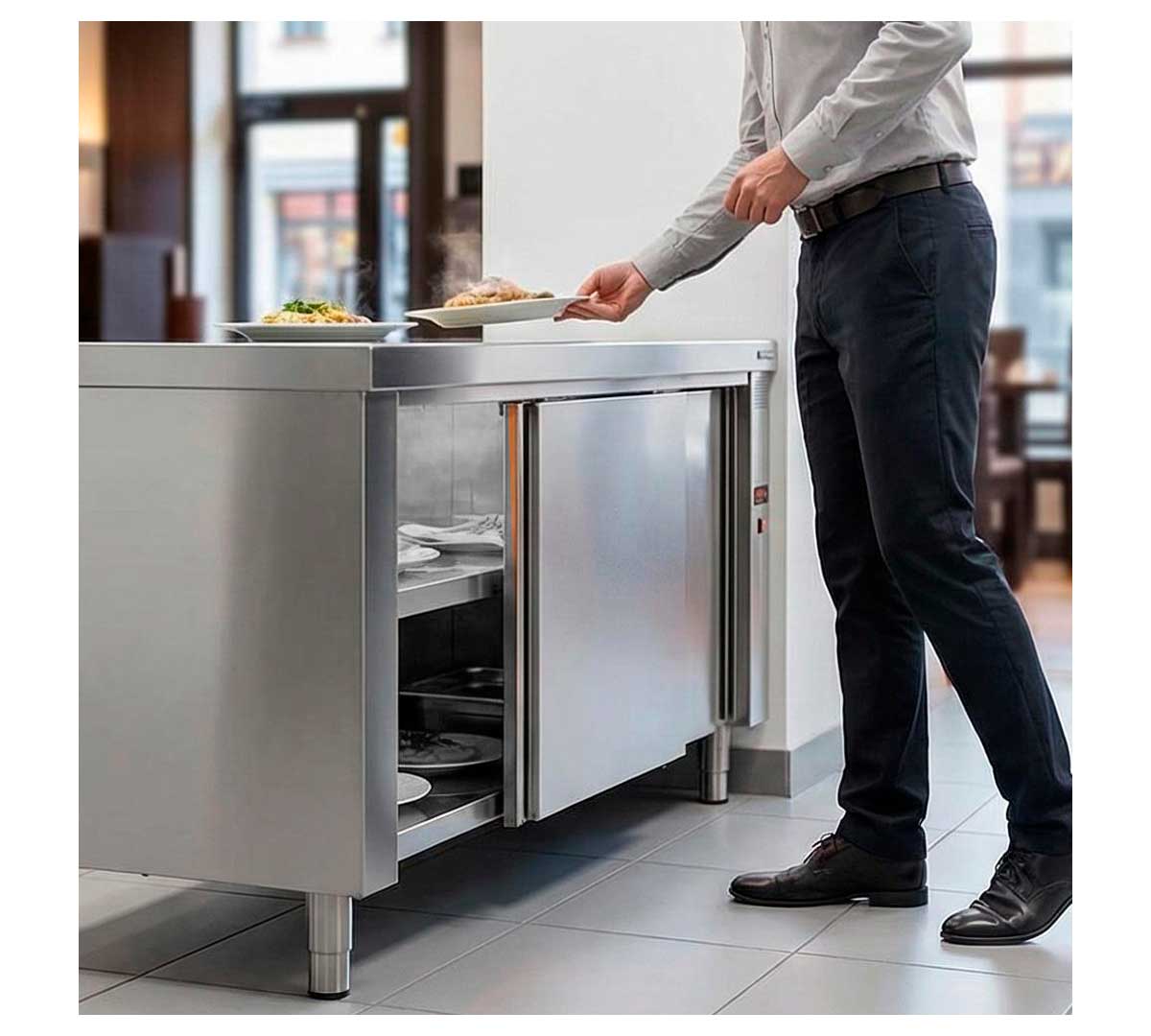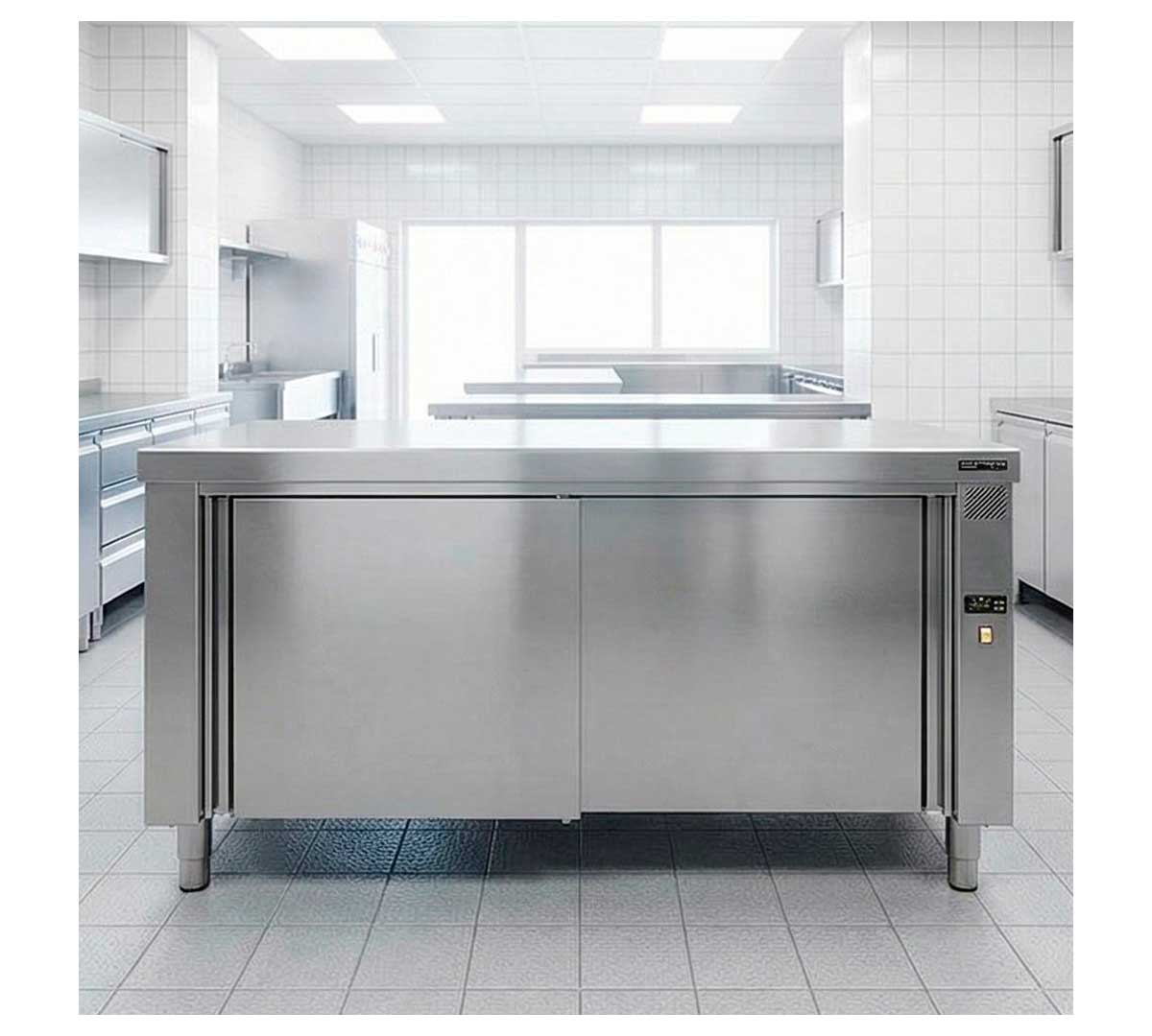 Mesa caliente pasante con 2 puertas correderas a ambos lados. Diseñada para el mantenimiento en caliente de los platos antes del servicio. Está fabricada en acero inoxidable. Equipada con panel de mandos con interruptor luminosos y termostato digital. Tiene un fondo de 70 cm.