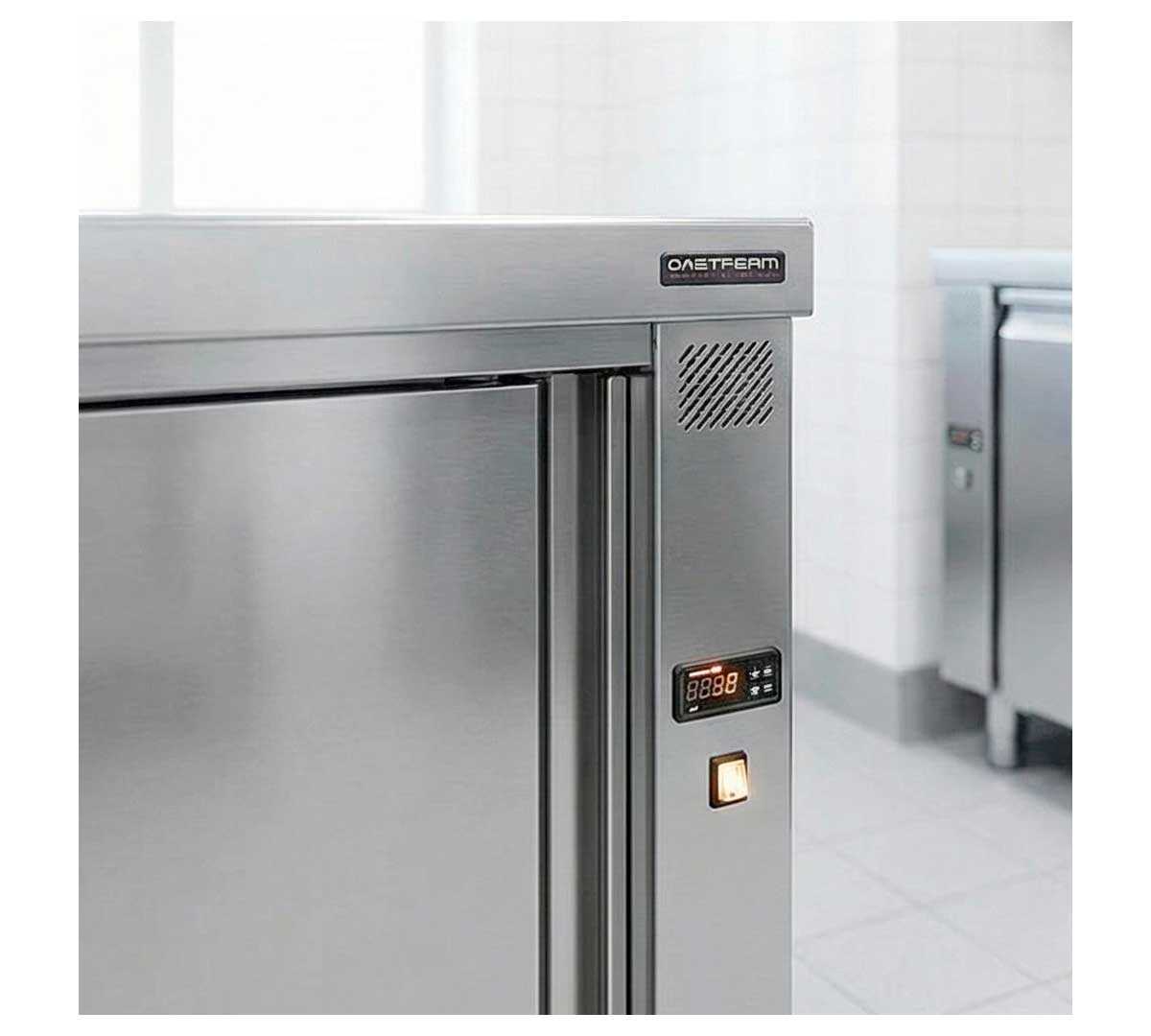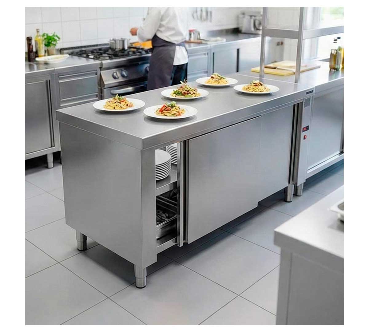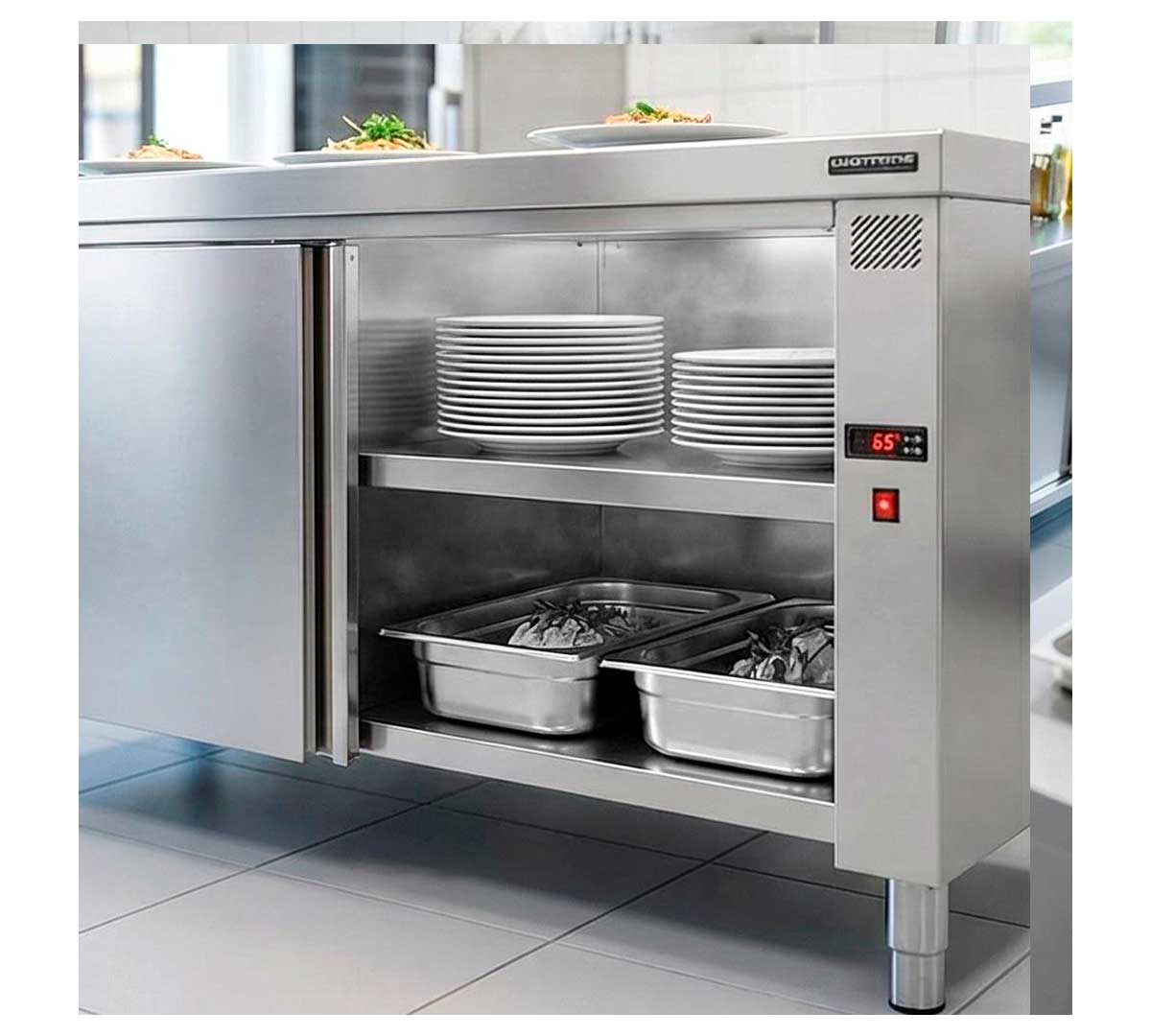 Mesa caliente pasante con 2 puertas correderas a ambos lados. Diseñada para el mantenimiento en caliente de los platos antes del servicio. Está fabricada en acero inoxidable. Equipada con panel de mandos con interruptor luminosos y termostato digital. Tiene un fondo de 70 cm.