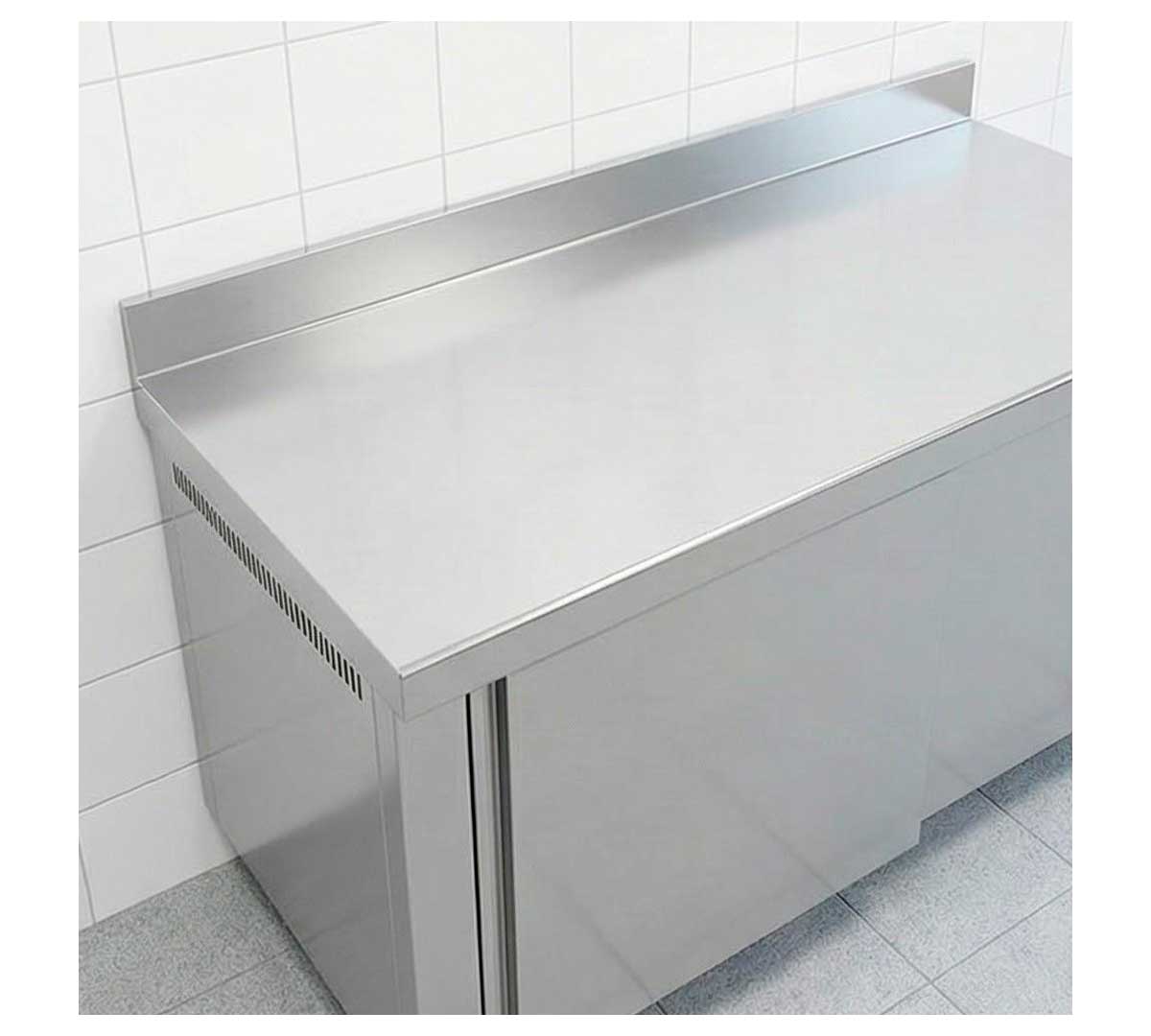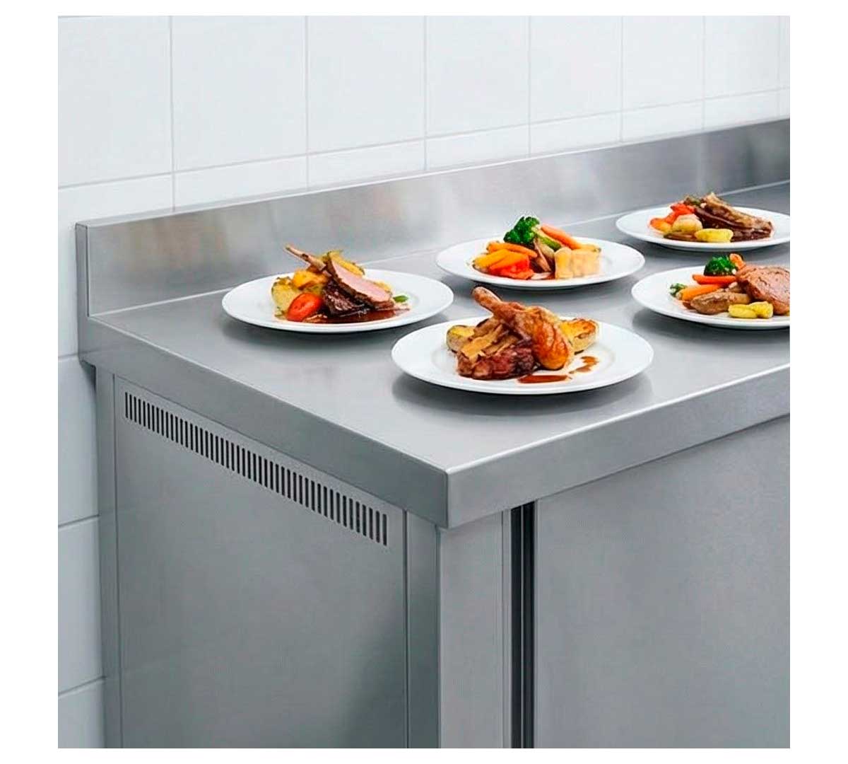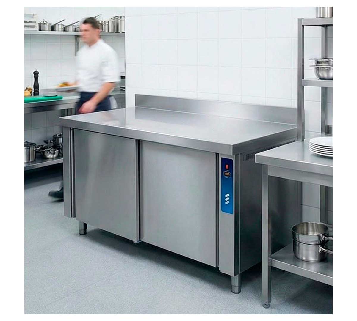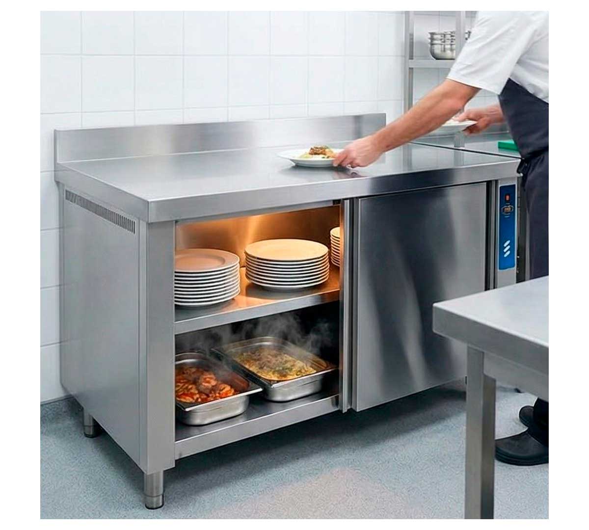 Mesa caliente mural con estante intermedio. La calefacción interior es por aire forzado. Ideal para mantener la cadena de calor de los alimentos, sin alterar sus propiedades y sabores. Tiene 2 puertas correderas. Con peto trasero de 10 cm.