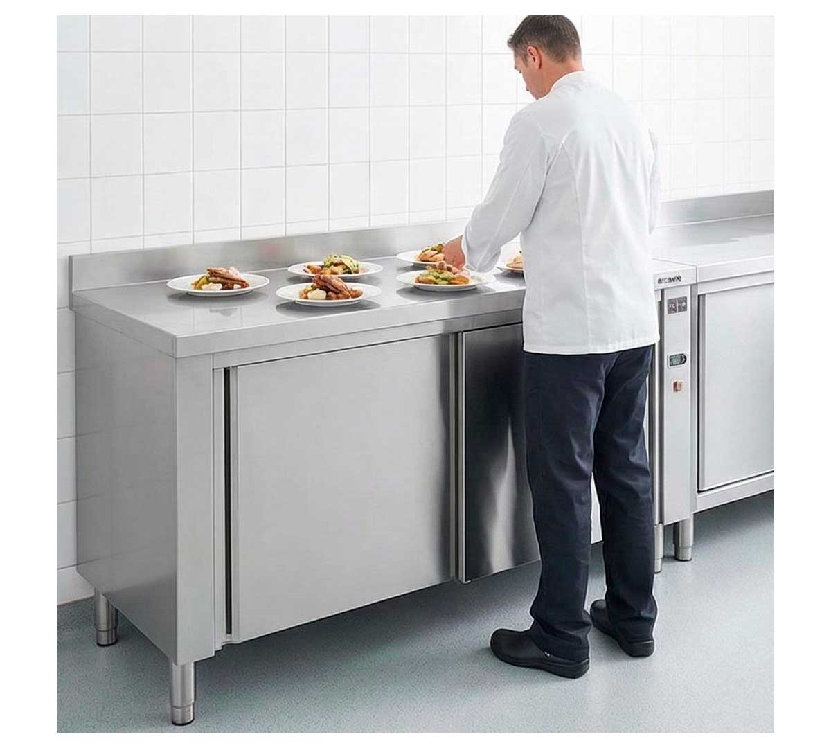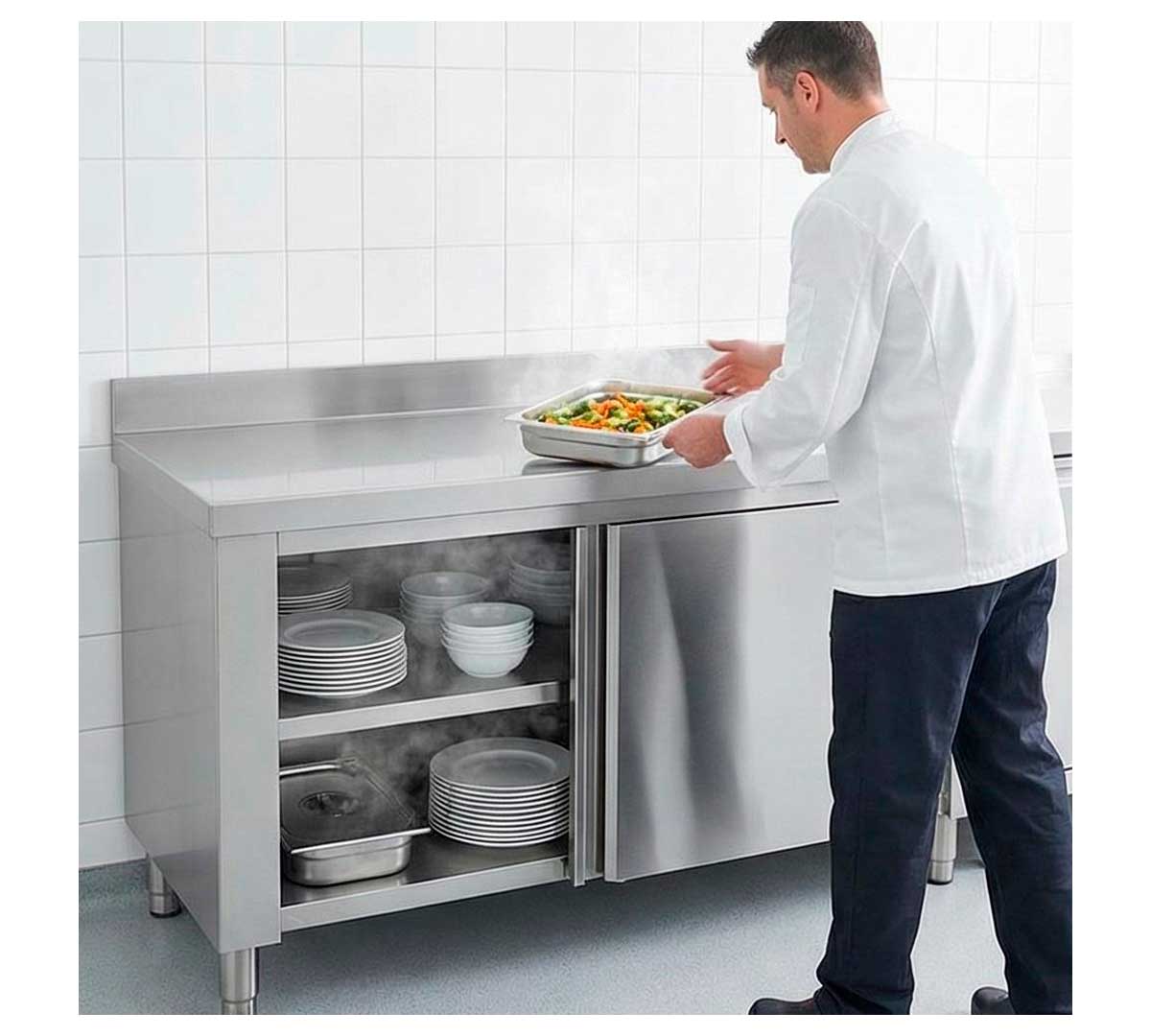 Mesa caliente mural con 2 puertas correderas y peto trasero de 10 cm. Equipada con panel de control con termómetro y termostato digital regulable. Máxima eficiencia energética gracias al aislamiento integral por doble pared y fibra de vidrio. Tiene un fondo de 70 cm.