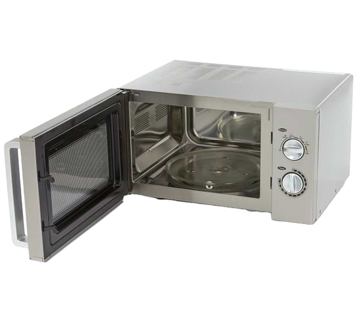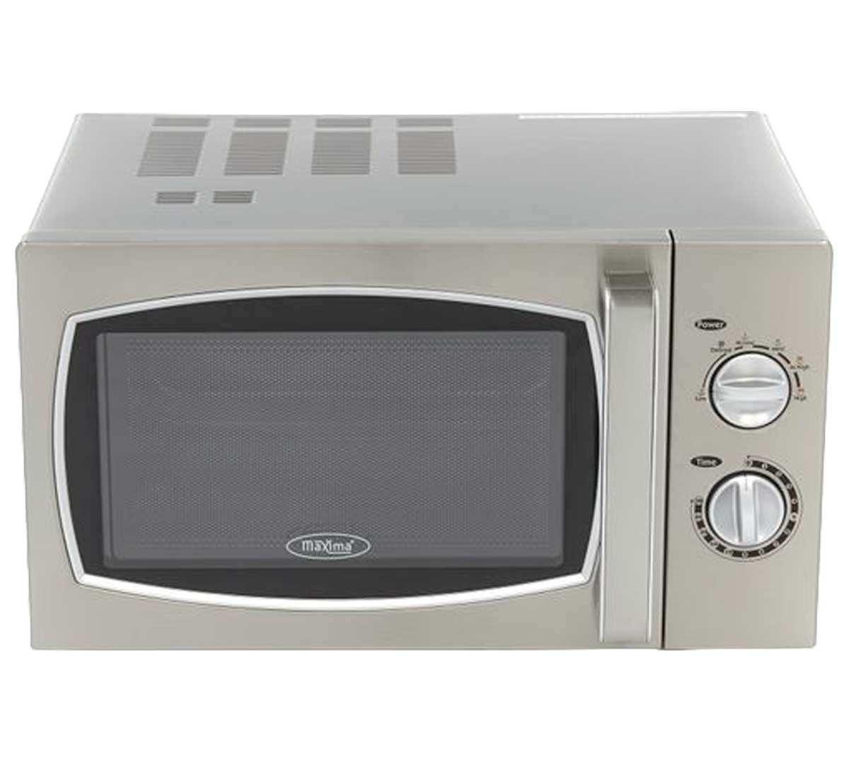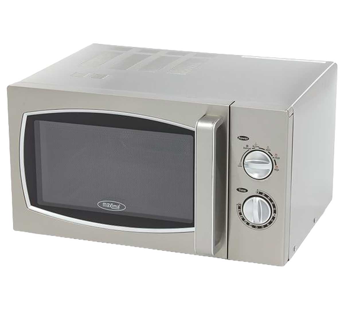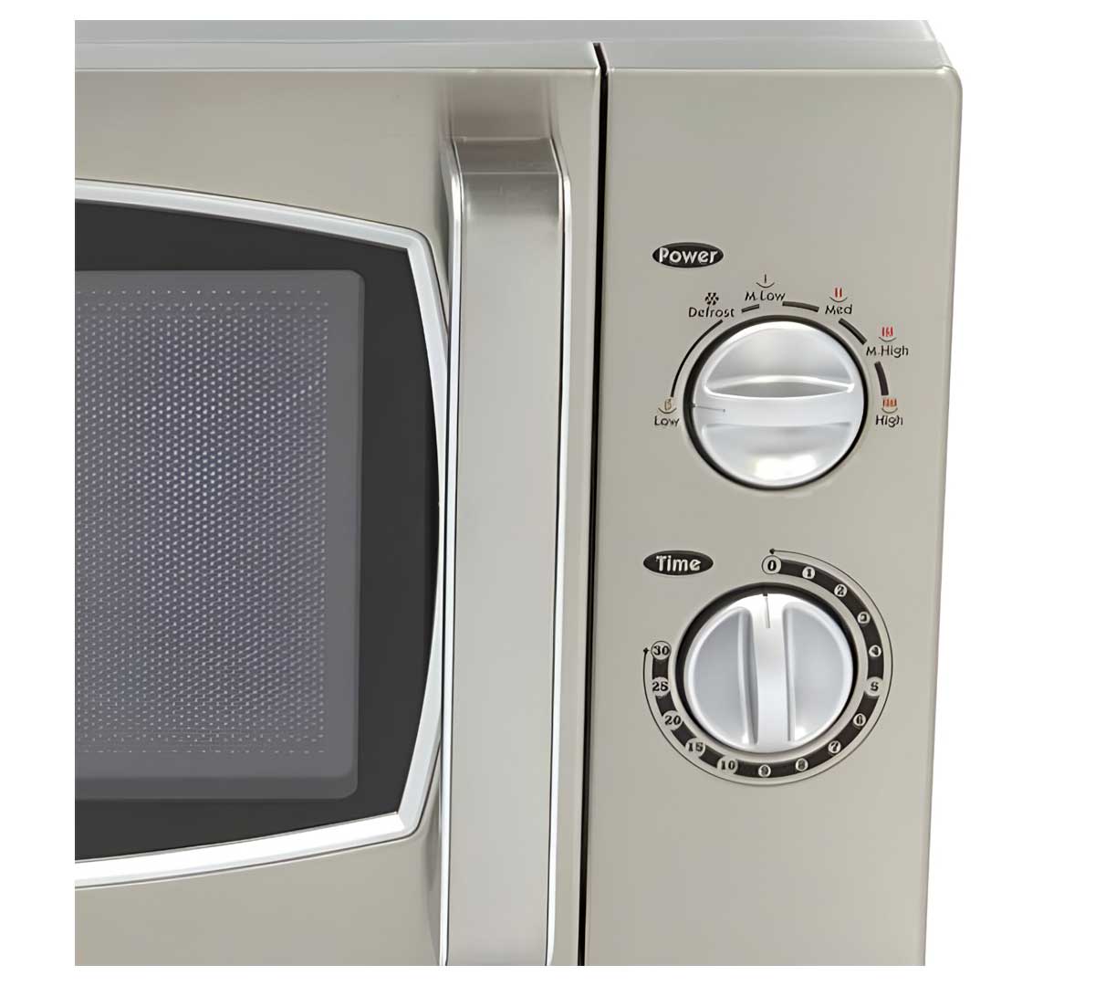 El microondas Maxima 25L tiene un mecanismo de control manual con un temporizador analógico hasta 30 minutos y seis niveles de potencia. La potencia varía desde un 20% en nivel bajo hasta un 100% en nivel alto, permitiéndote ajustar el calentamiento según el alimento.