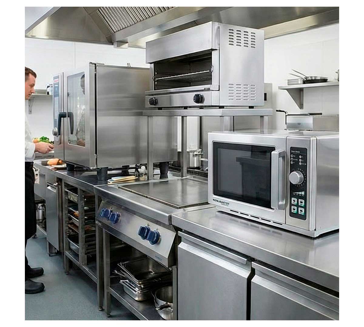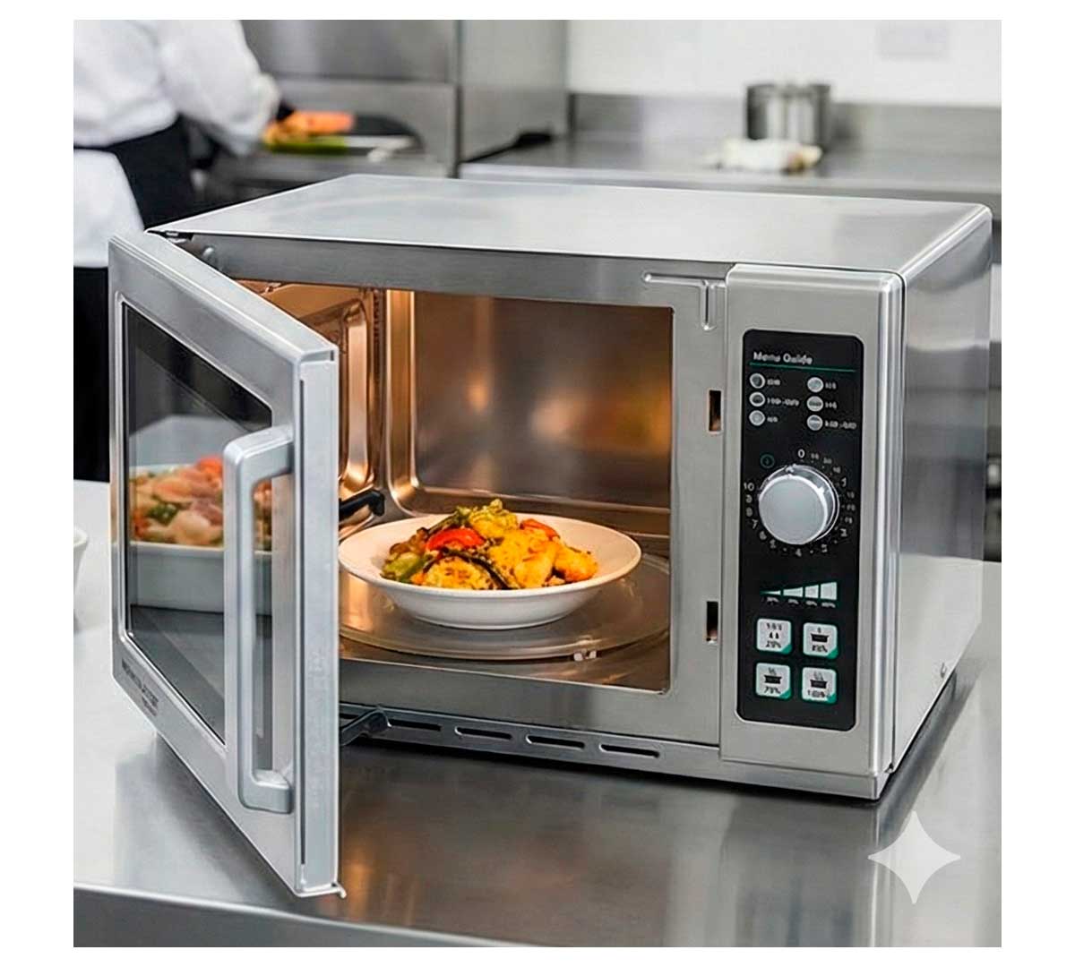 Microondas profesional sin plato giratorio y control mecánico. Tiene un acabado interior y exterior en acero inoxidable. Equipado con iluminación interior y puertas que permiten la visión interior. Con temporizador.