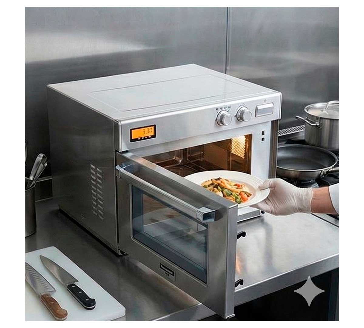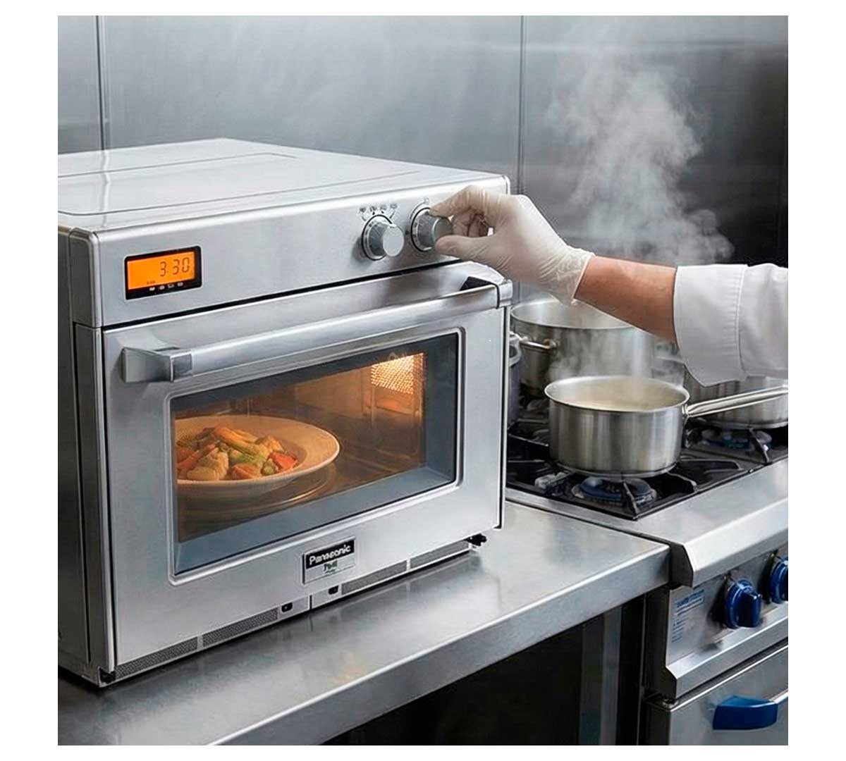 Este modelo de microondas pertenece a la gama Gourmet de Panasonic. Está diseñado para establecimientos que quieren servir grandes cantidades en el menor tiempo posible.