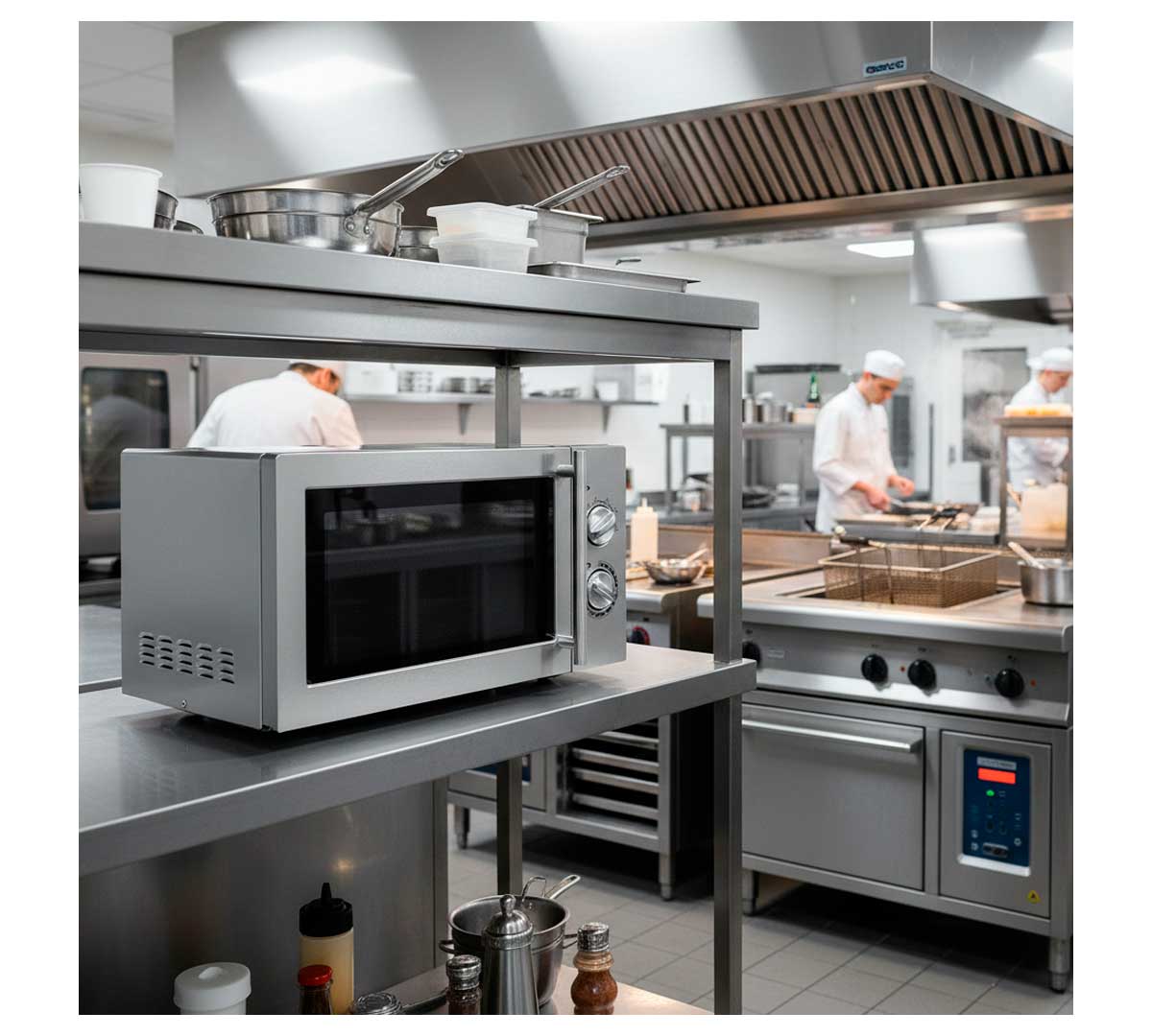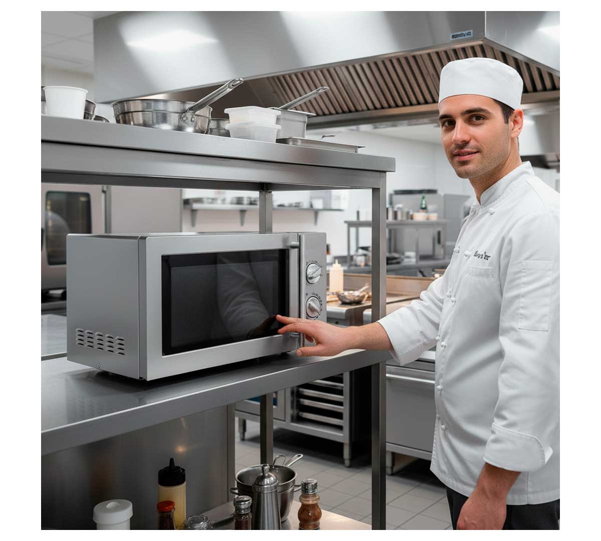 Microondas profesional fabricado en acero inoxidable. De control manual y capacidad de 24 litros. Incluye plato giratorio.