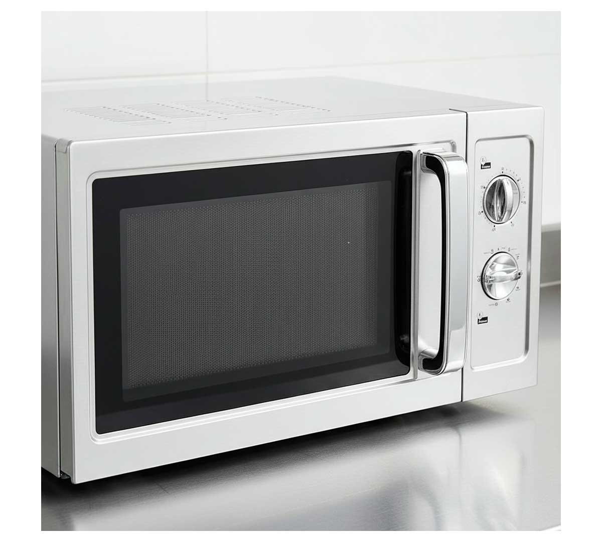 Horno Microondas de plato giratorio con grill y un magnetrón. Tiene una capacidad de 23 litros. Dispone de mando manual mecánico.