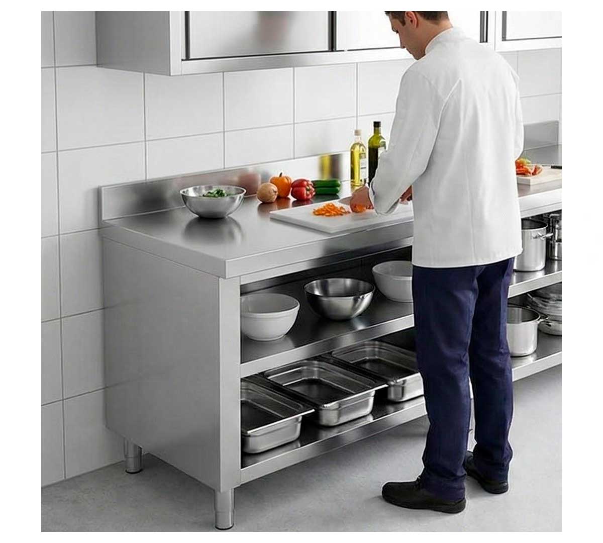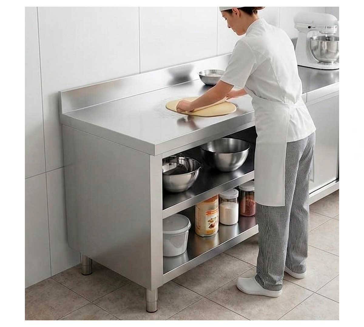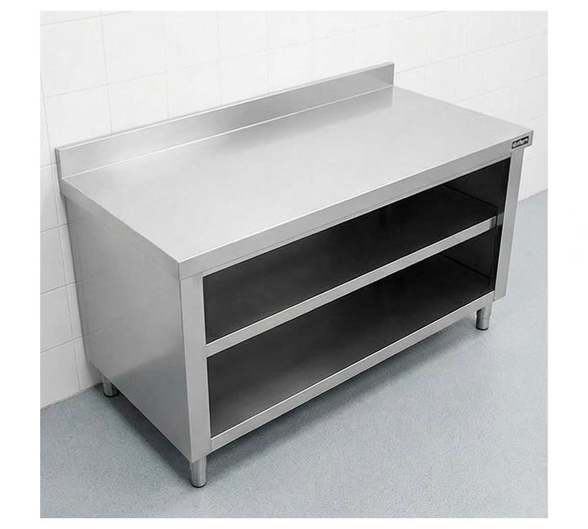 Mueble con encimera mural con peto posterior de 10,5 cm y fabricada en acero inoxidable. Las patas de 15 cm para elevar la altura del mueble desde los 85 hasta los 90 cm.