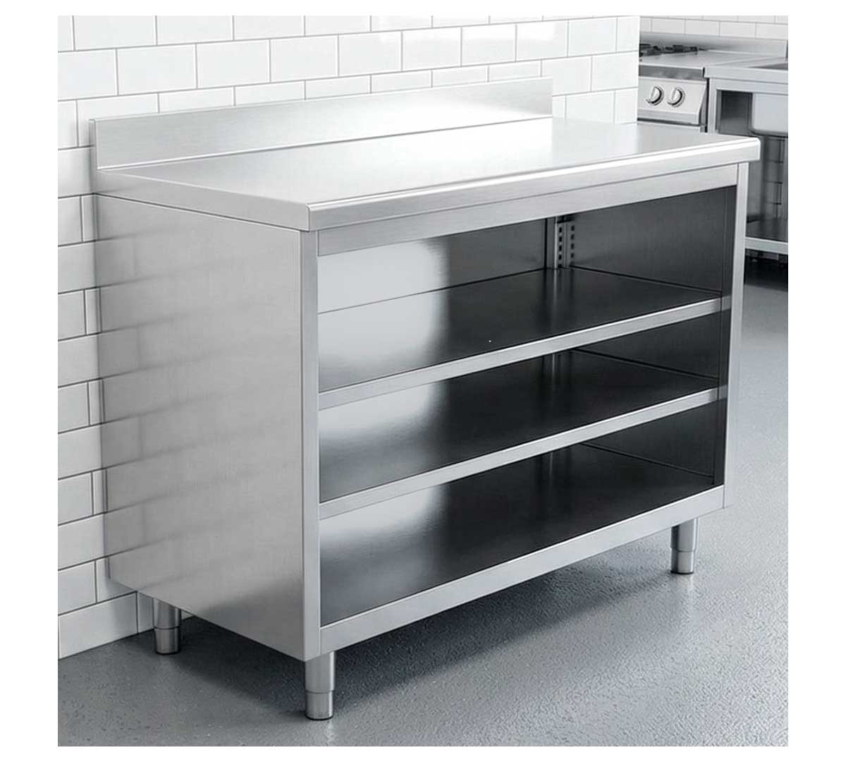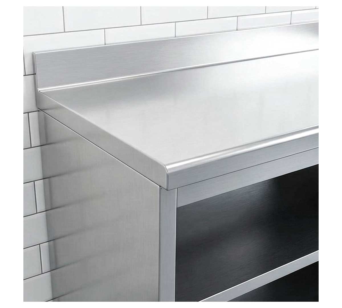 Mueble estantería con fondo de 60 cm y fabricada en acero inoxidable. Con encimera mural con peto trasero de 10 cm totalmente soldado y con cantos redondeados. Incluye 2 estantes.