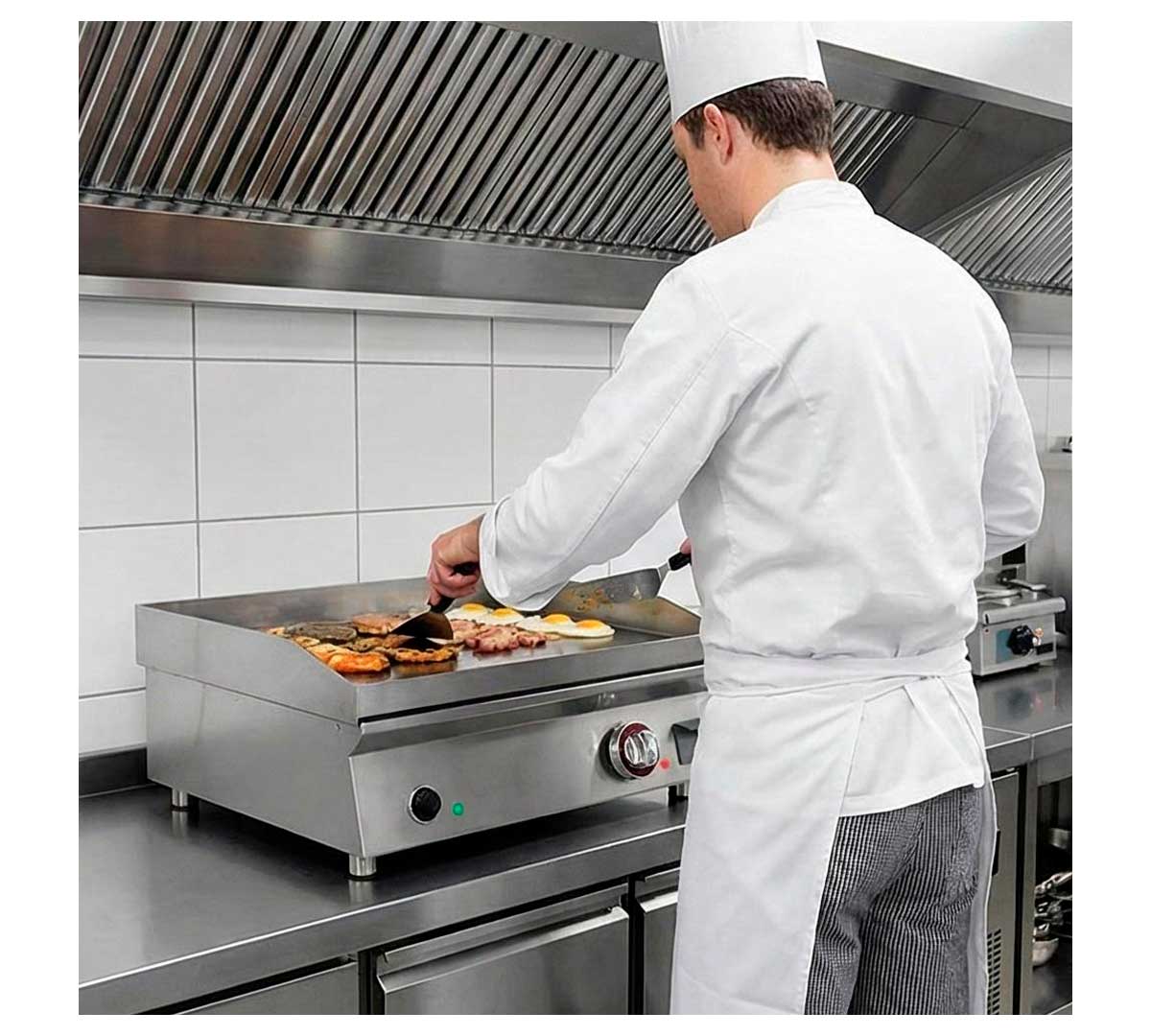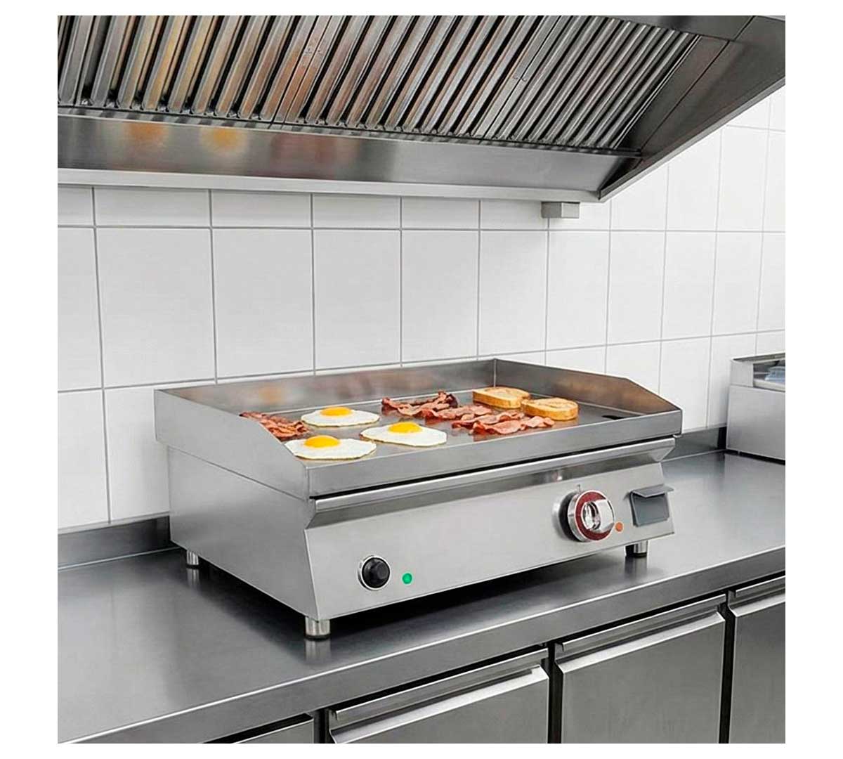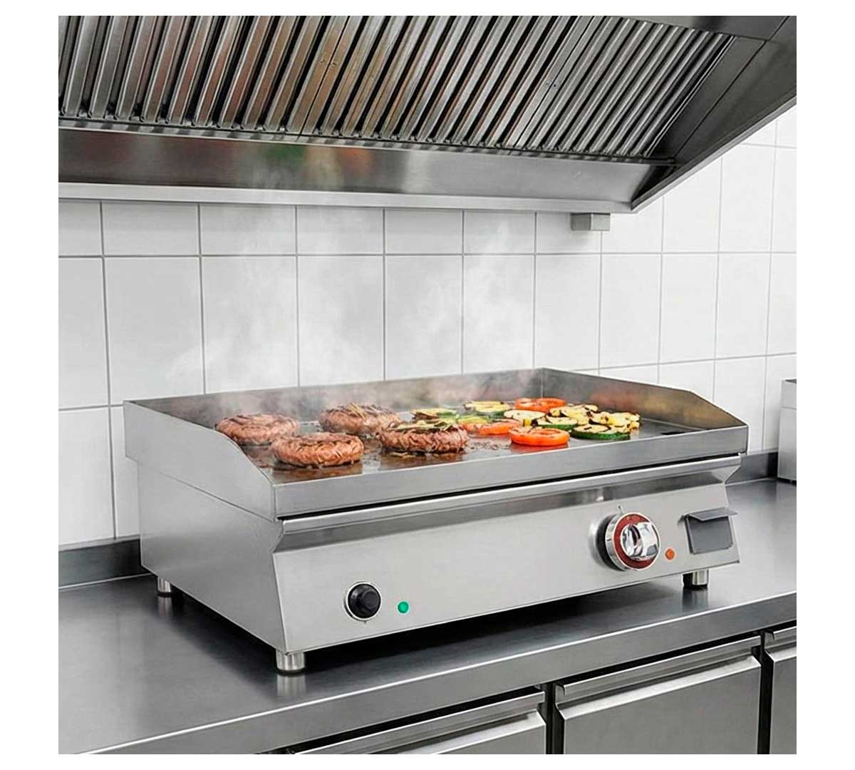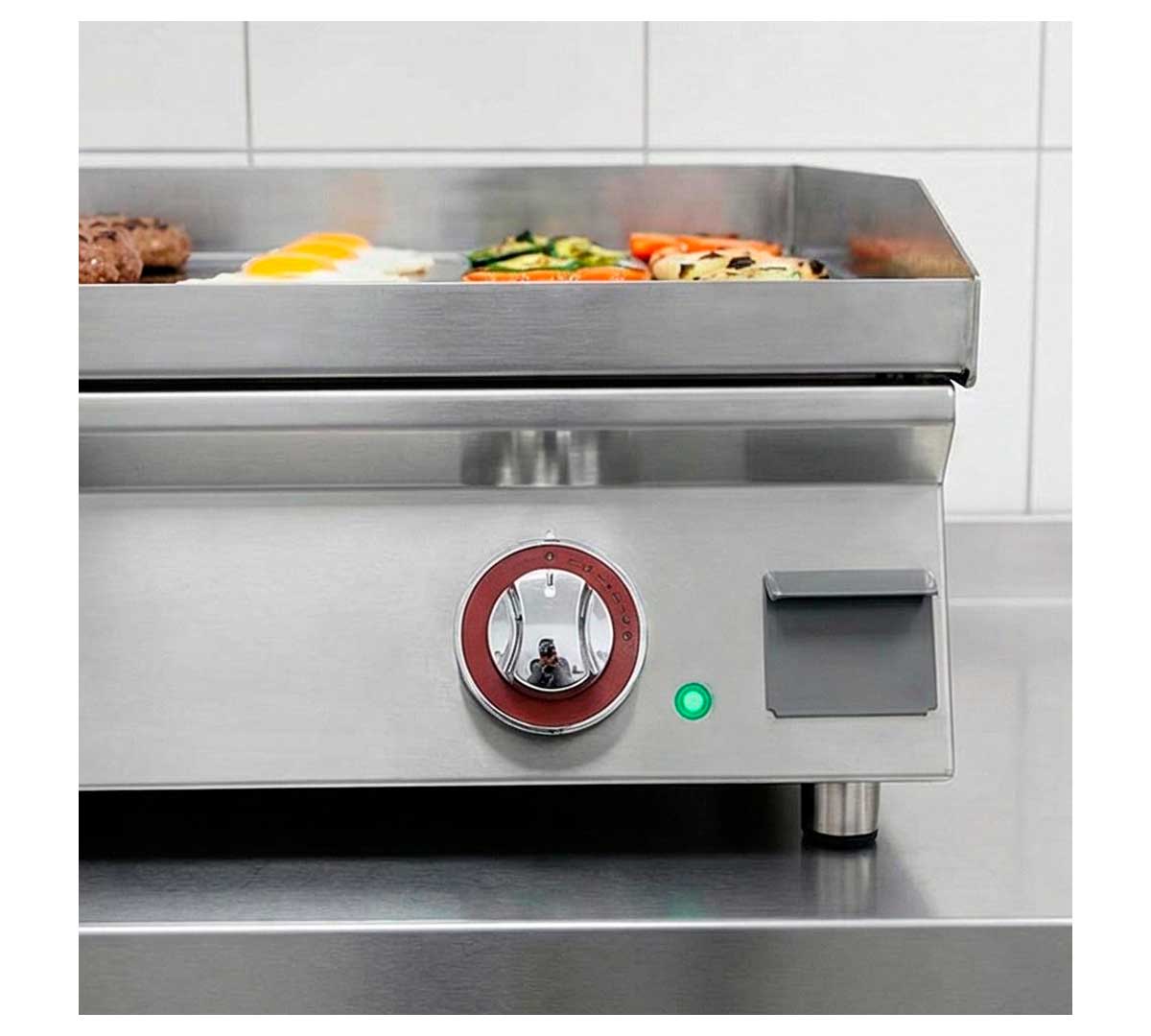 Plancha de cocina eléctrica con resistencias de acero inoxidable con recubrimiento incoloy. La placa es lisa, está fabricada en acero rectificado y tiene un espesor de 15 mm. Equipada con termostato de trabajo regulable de 40 a 300 ºC.
