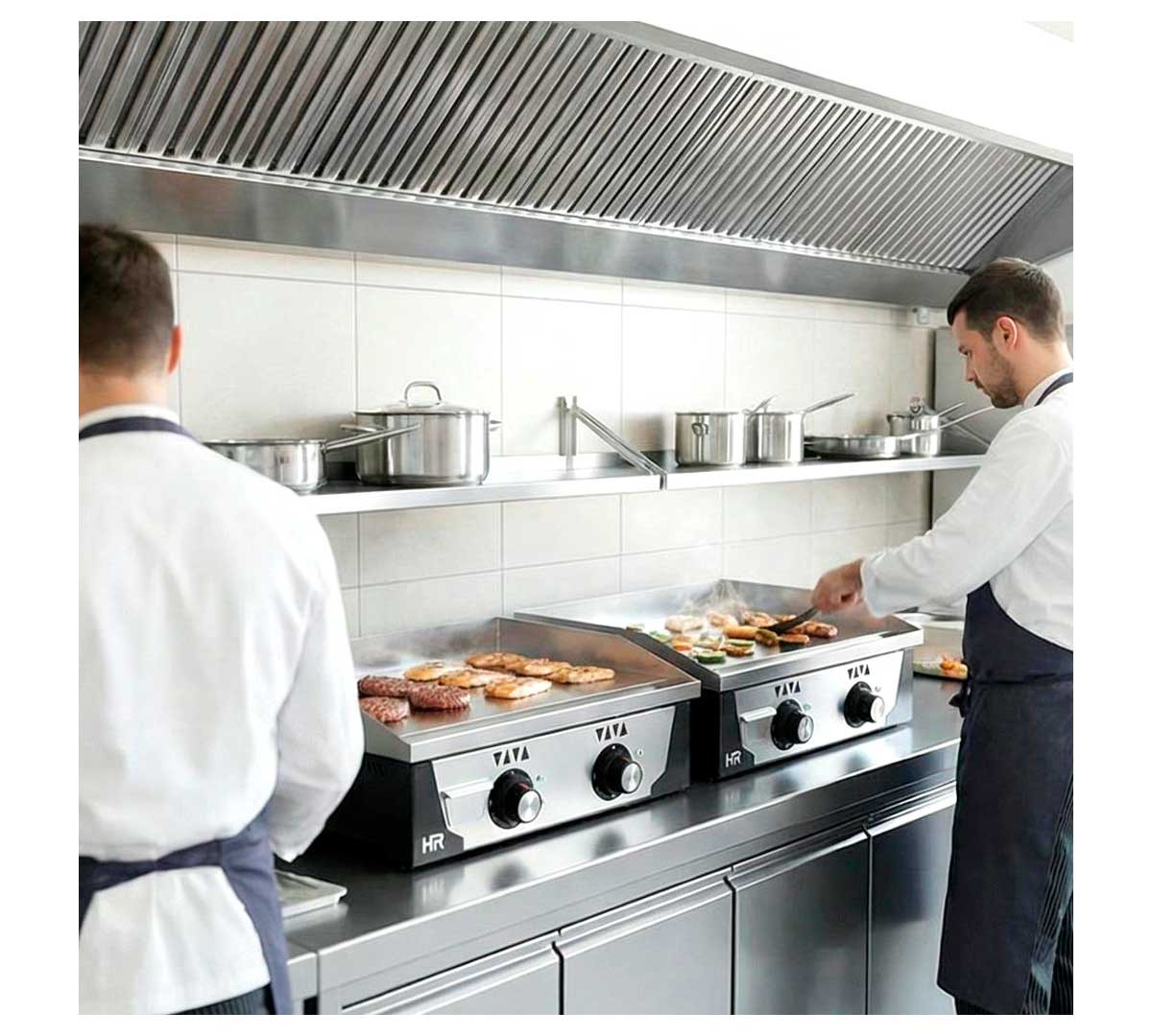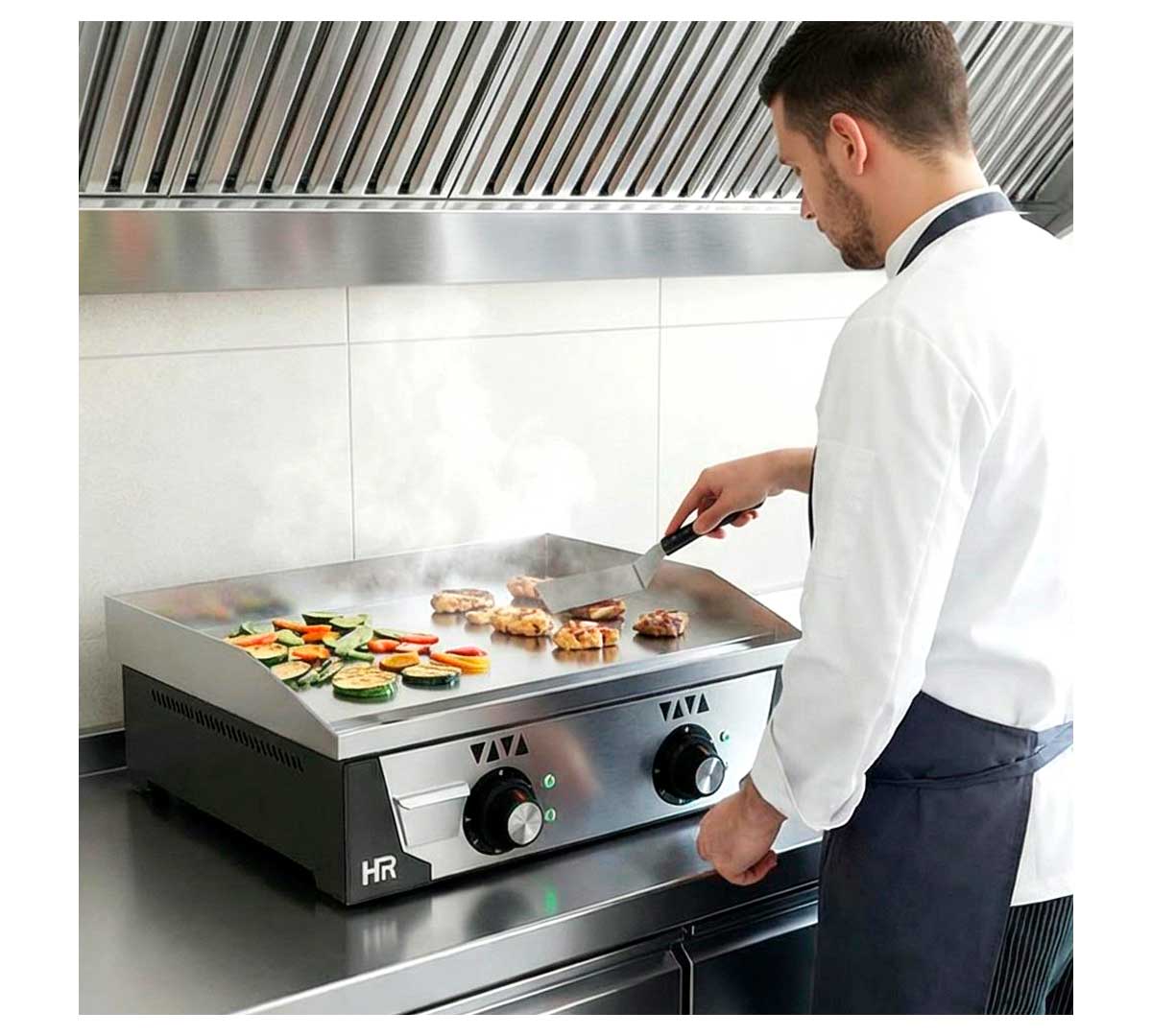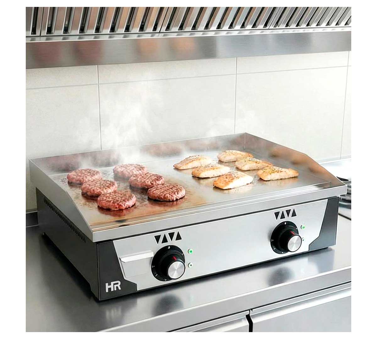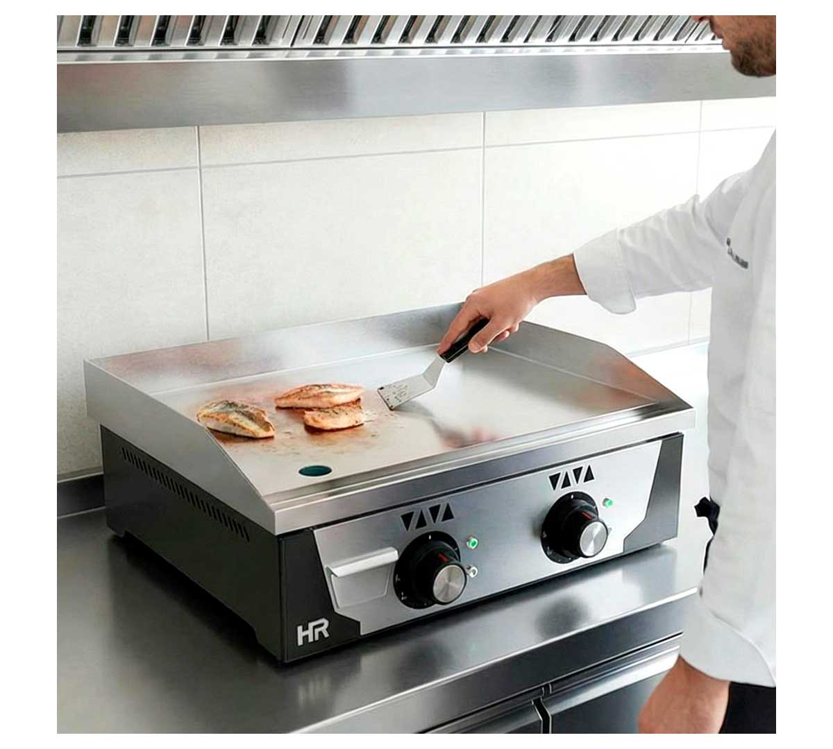 Plancha de cocina eléctrica con patas regulables. Las resistencias son de acero inoxidable. La placa es de cromo, tiene un espesor de 15 mm y la superficie es lisa. Tiene dos zonas independientes de calor regulables de 30 a 300 ºC.