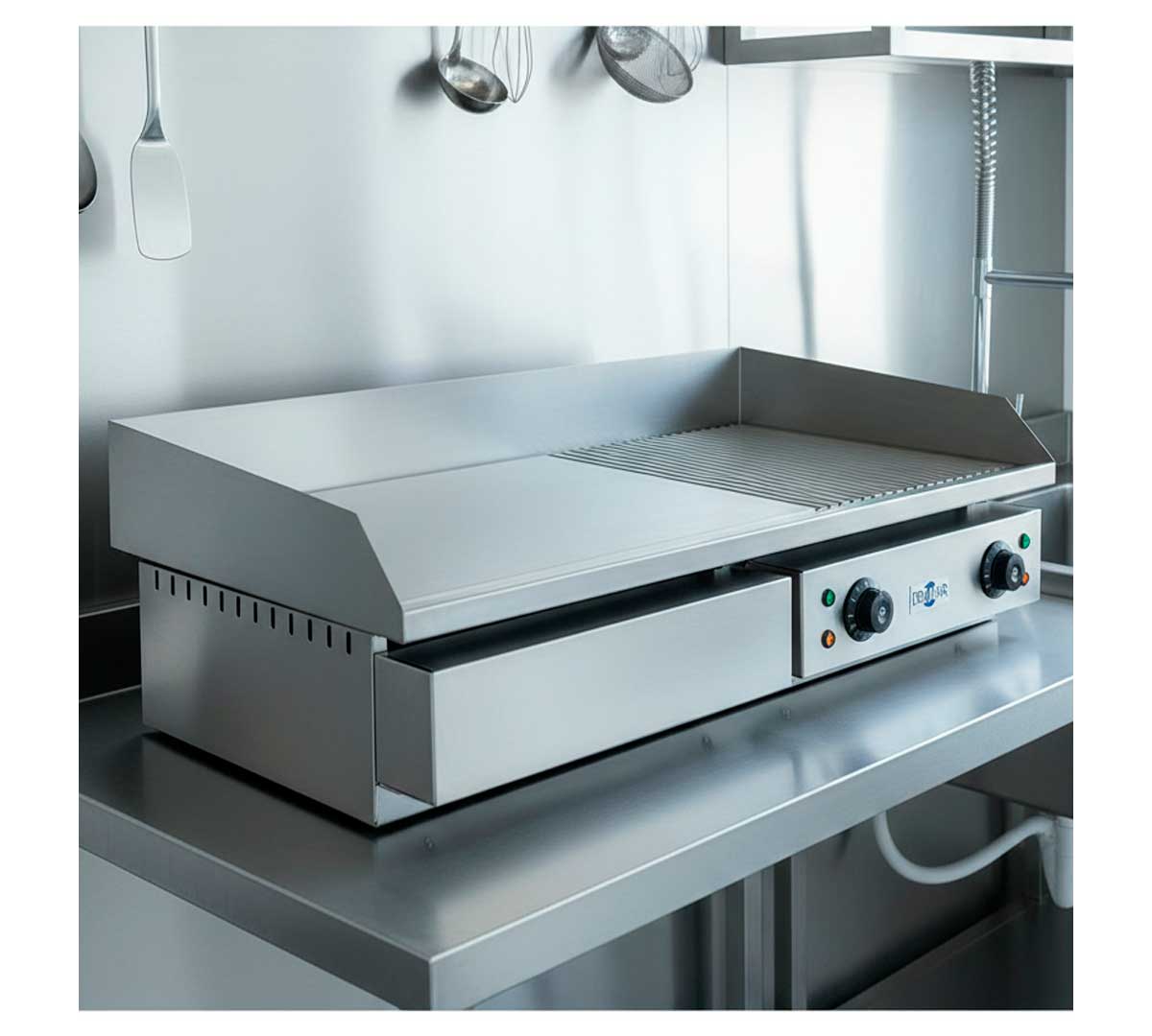 Plancha eléctrica diseñada para un uso moderado. La placa de cocción es mixta, está fabricada en acero rectificado y tiene un espesor de 8 mm. Equipada con 2 termostatos para graduar la temperatura hasta los 300 ºC.
