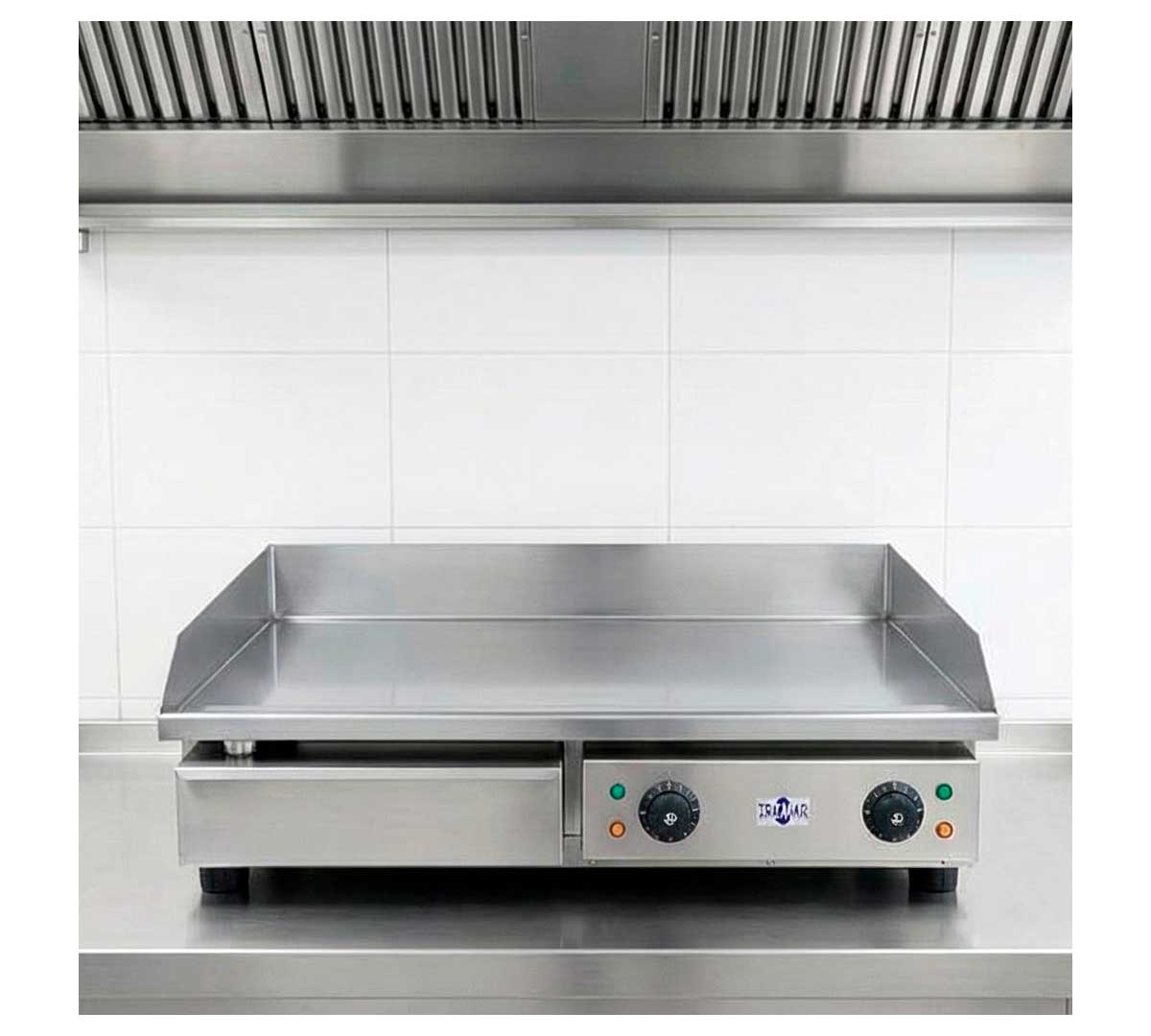 La Plancha Eléctrica Cromo Duro Placa Lisa PLE-CD de Irimar es eléctrica y está diseñada para un uso moderado. Con termostato para graduar la temperatura hasta los 300 ºC. La placa es lisa, de acero con baño de cromo duro y con un espesor de 10 mm.