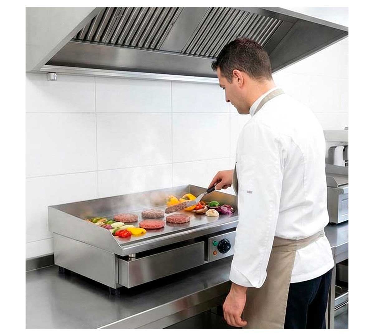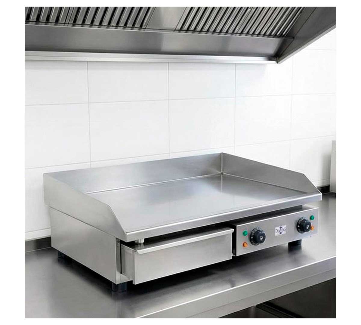 Plancha eléctrica diseñada para un uso moderado. La placa de cocción es lisa, está fabricada en acero con baño de cromo duro y tiene un espesor de 10 mm. Tiene patas de goma antideslizantes. Está equipada con termostato para graduar la temperatura hasta los 300 ºC.