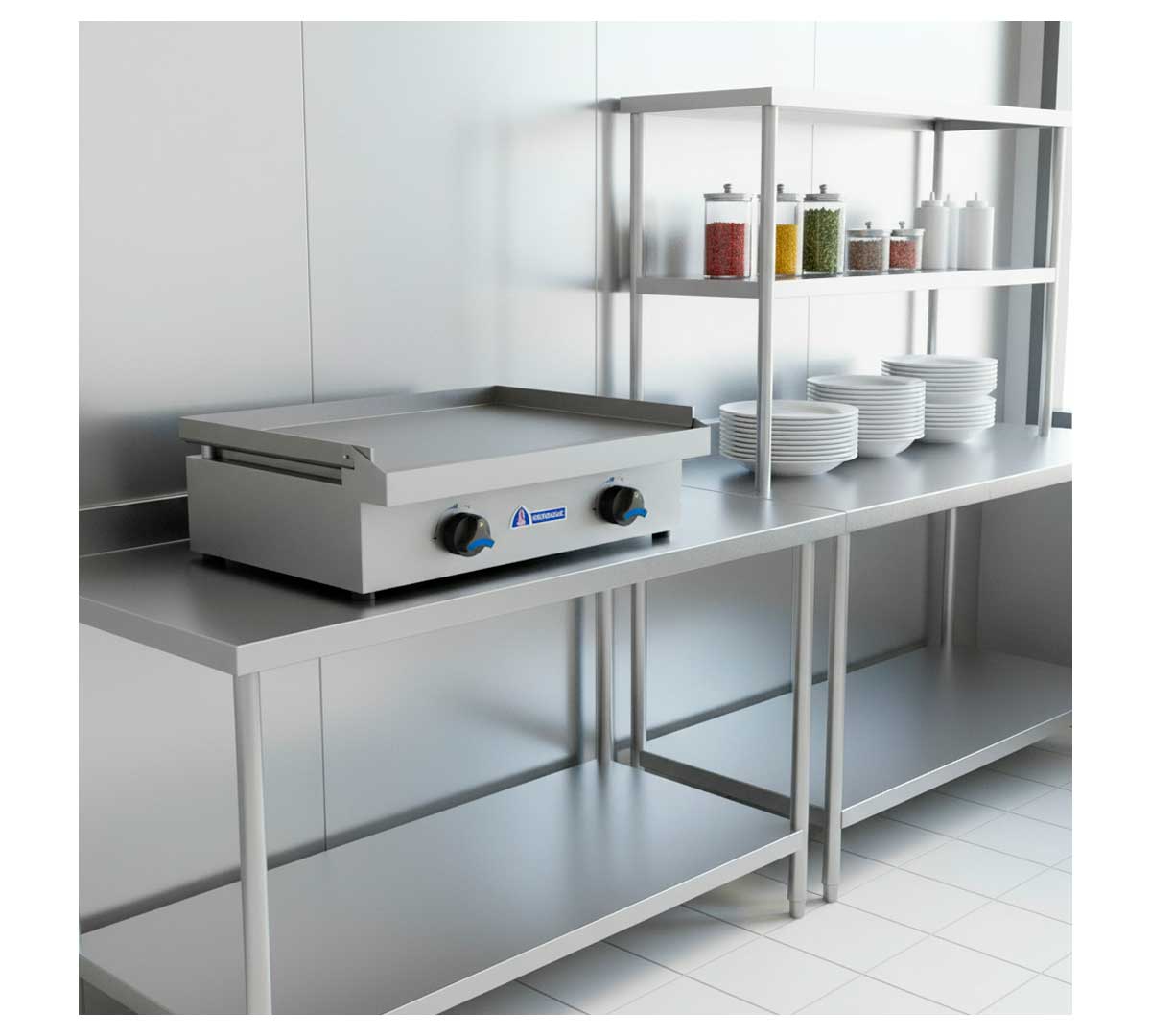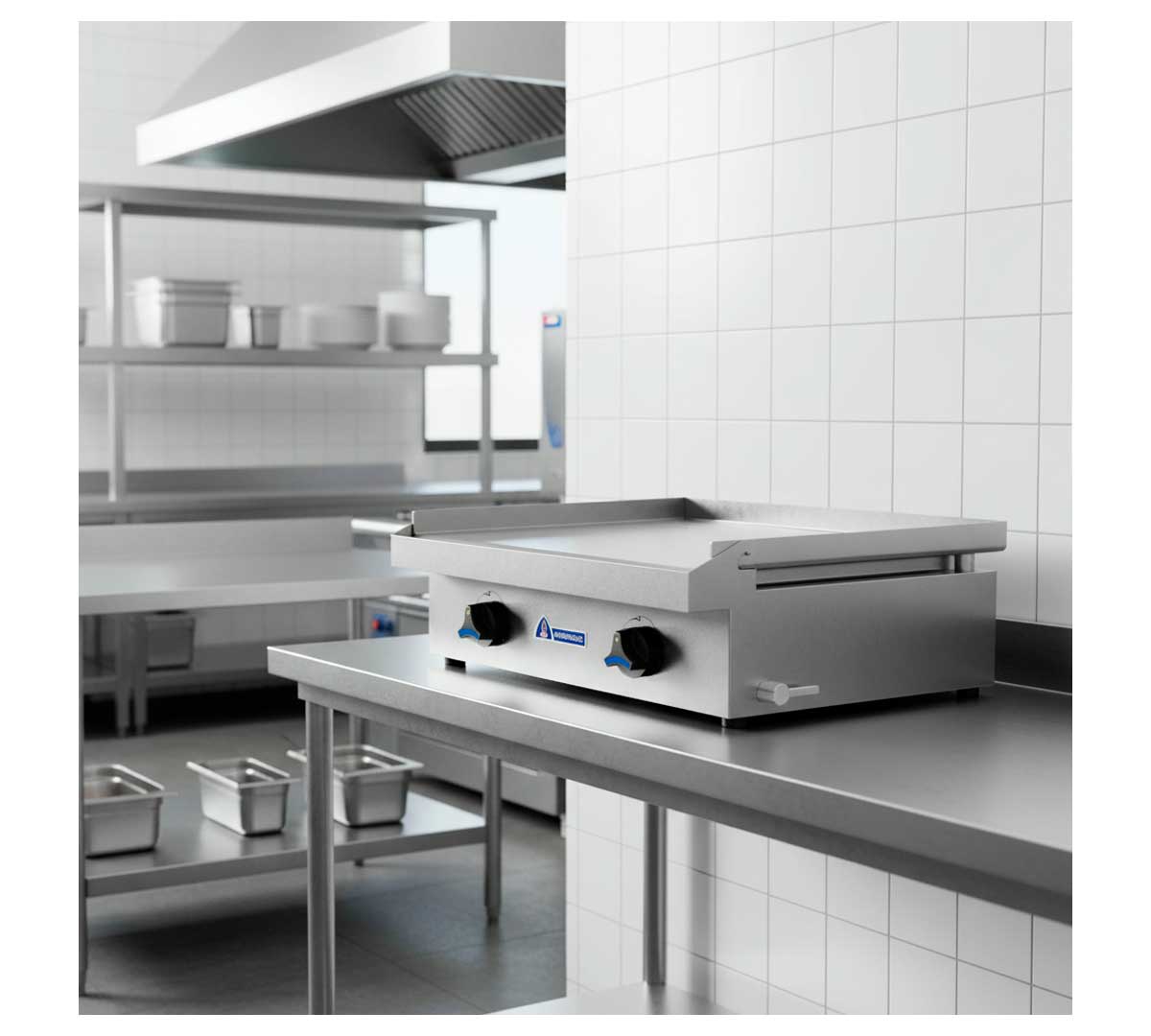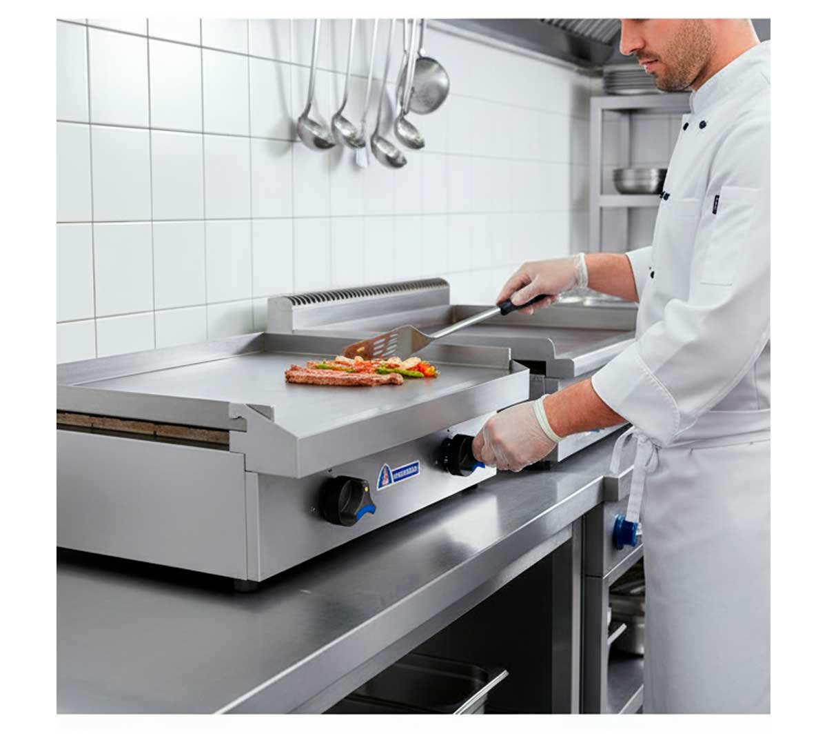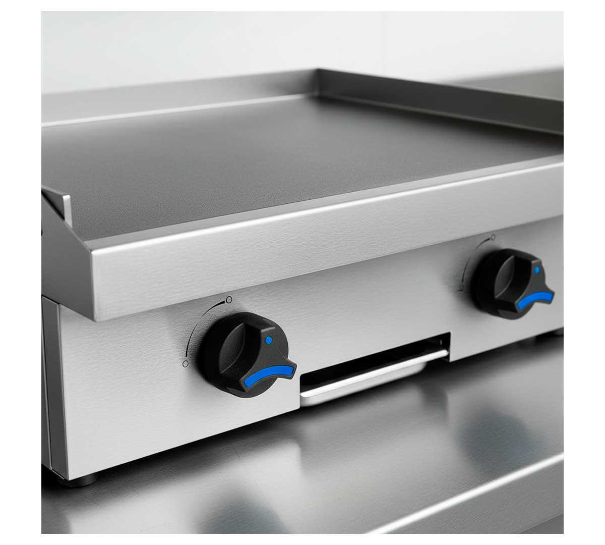 Plancha a gas fabricada en acero inoxidable. Está equipada con patas regulables, válvula termopar y recoge grasas frontal. La placa es lisa, está fabricada en hierro decapado y tiene un espesor de 8 mm. Está disponible a gas butano/propano o a gas natural.