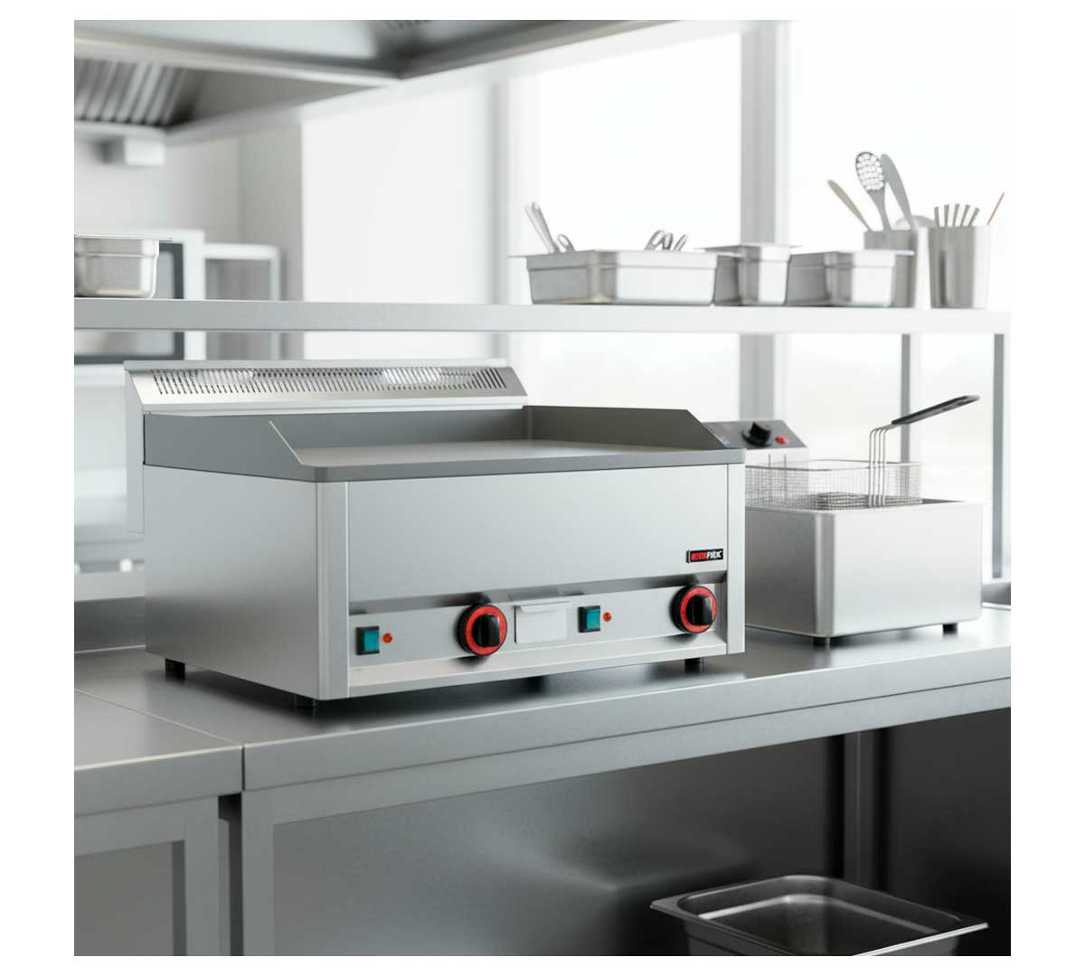 Plancha de cocina eléctrica. La placa es lisa, está fabricada en acero fundido y tiene los cantos redondeados para una mayor higiene. Las resistencias son blindadas. Incluye una rasqueta.