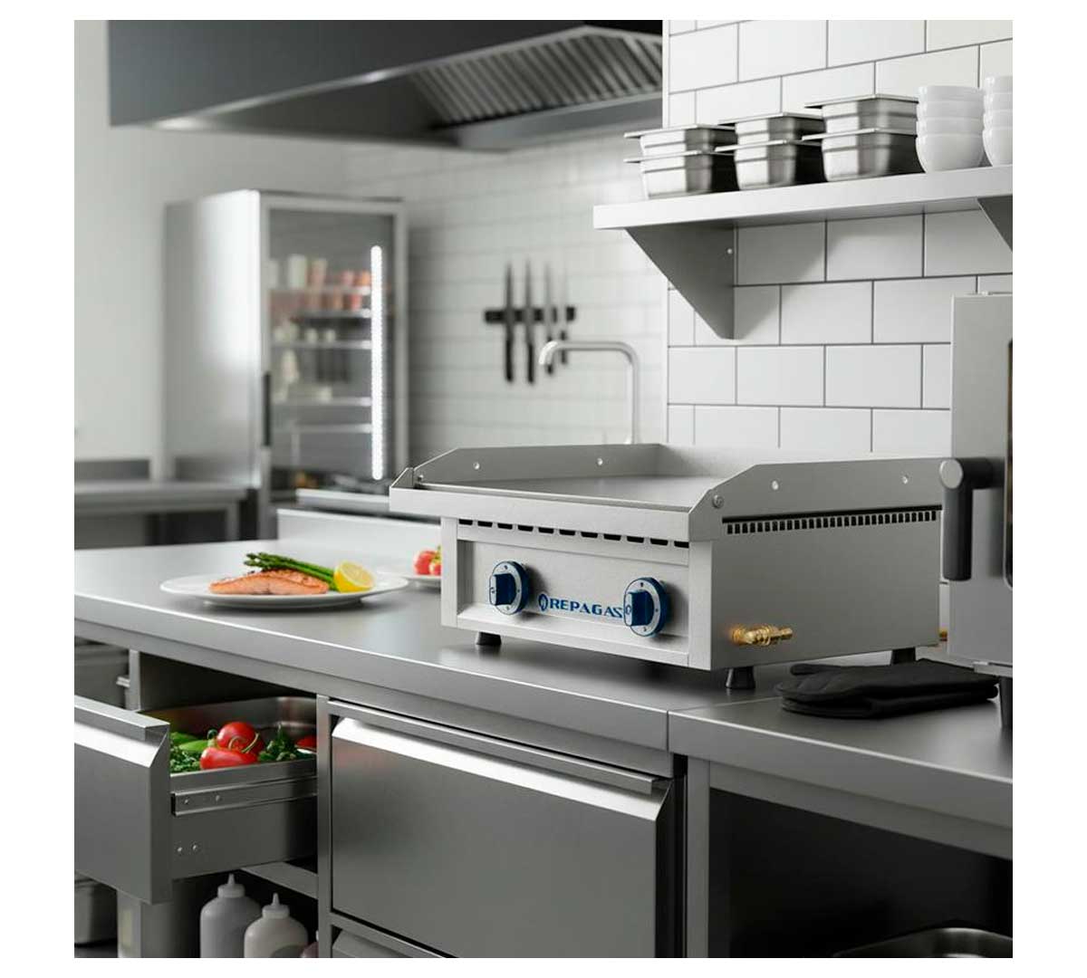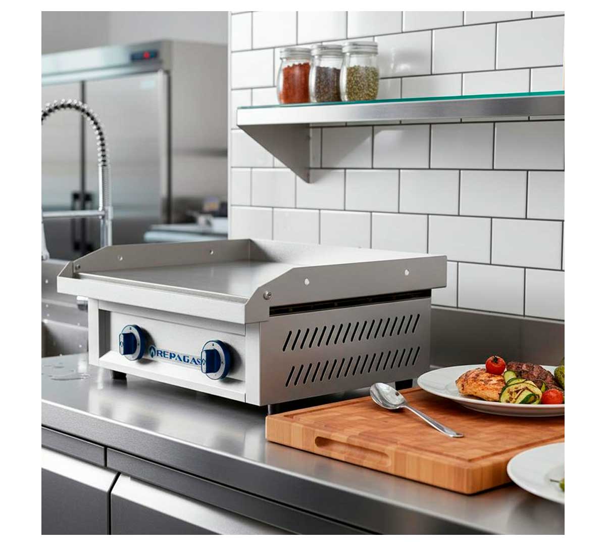 La Plancha Snack Line Serie 440 Placa Lisa de Acero PG-LR a Gas de Repagas está diseñada para garantizar la uniformidad y máxima temperatura de trabajo en todos sus puntos. La placa es lisa, está fabricada en acero rectificado y tiene un espesor de 12 mm.