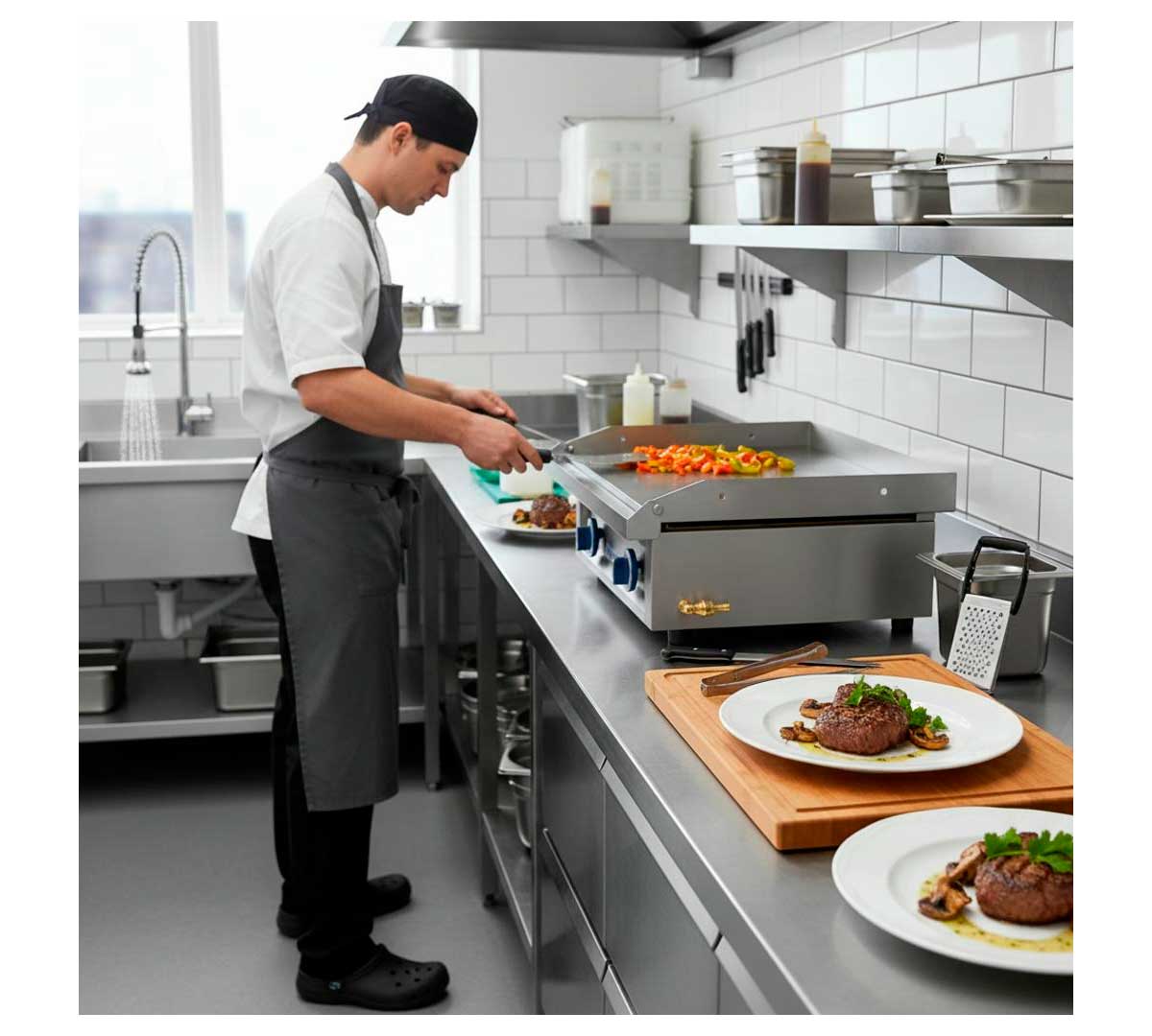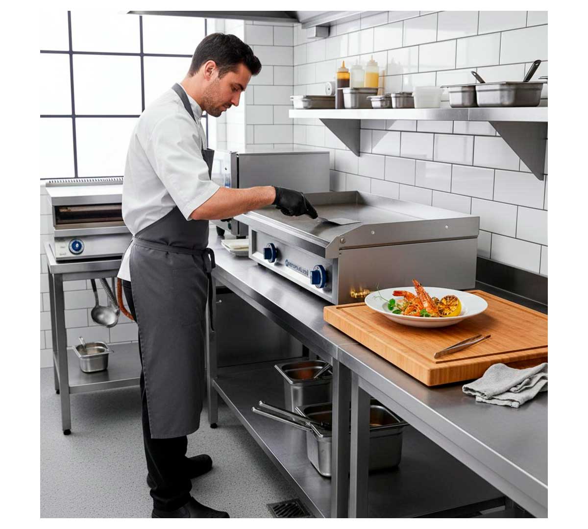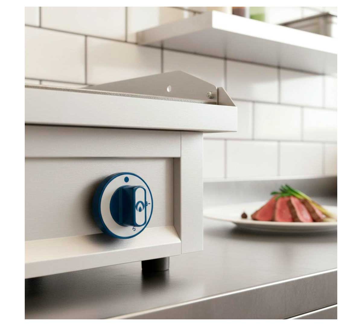 Plancha de cocina a gas con patas regulables y mangos de poliamida. La placa es lisa, está fabricada en acero pulido y rectificado y tiene un espesor de 12 mm. Equipada con termopar y quemador tubular bajo la placa fabricado en acero inoxidable.