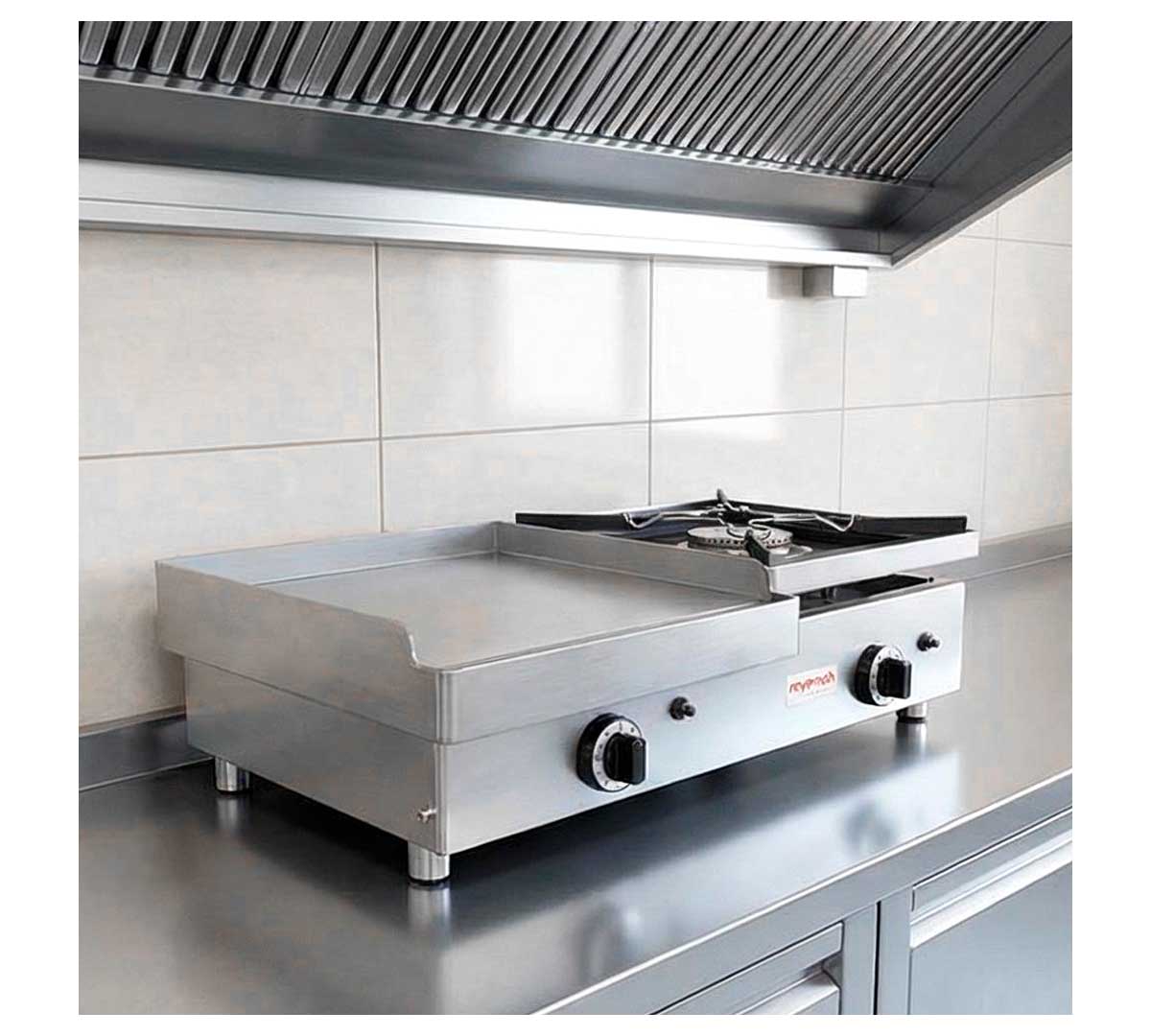 La Plancha a Gas de Acero Laminado con Fuego de Savemah tiene quemadores de gran poder calorífico con termopar de seguridad. La placa es de acero laminado, con la superficie lisa y tiene un espesor de 6 mm. El fogón tiene un gran poder calorífico con una potencia de 5,7 kW.