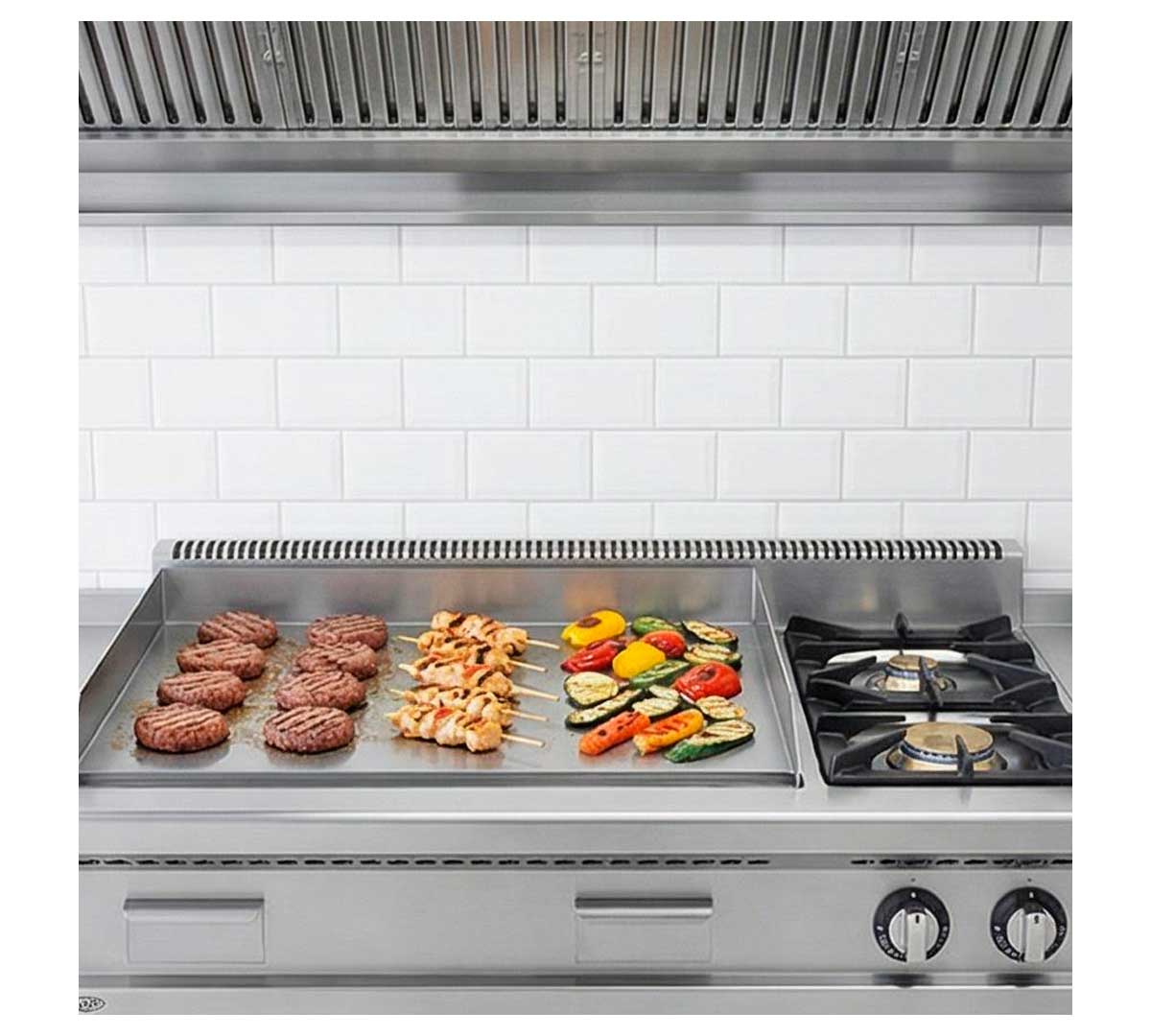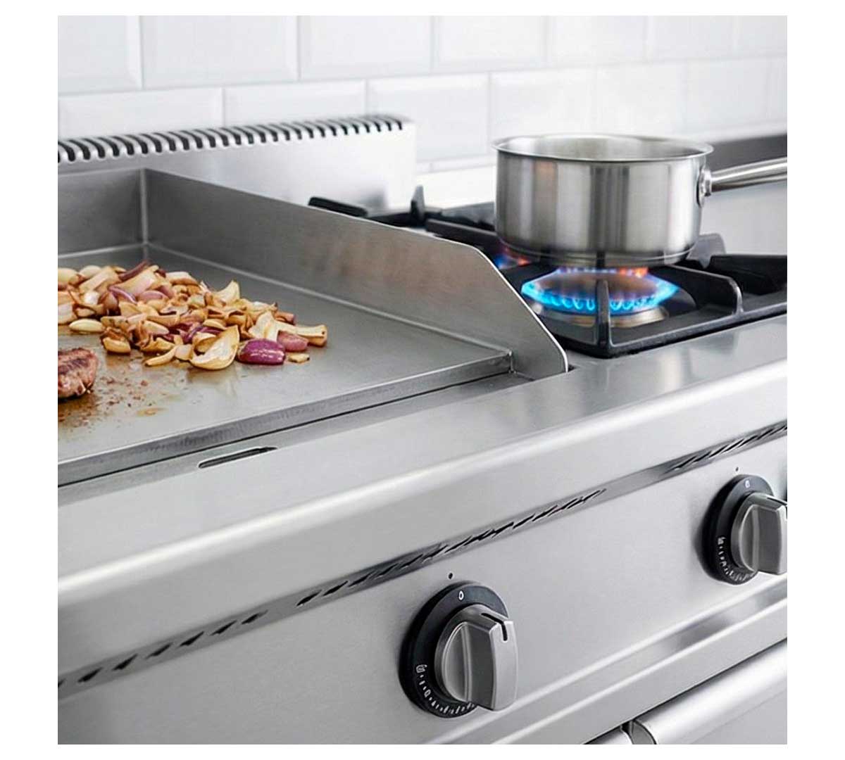 Plancha de cocina a gas con un fogón de gran poder calorífico con una potencia de 5,7 kW. La placa es de acero laminado, con la superficie lisa y tiene un espesor de 6 mm. Se suministra con inyectores para gas butano. También se incluyen los inyectores para cambio a gas natural.