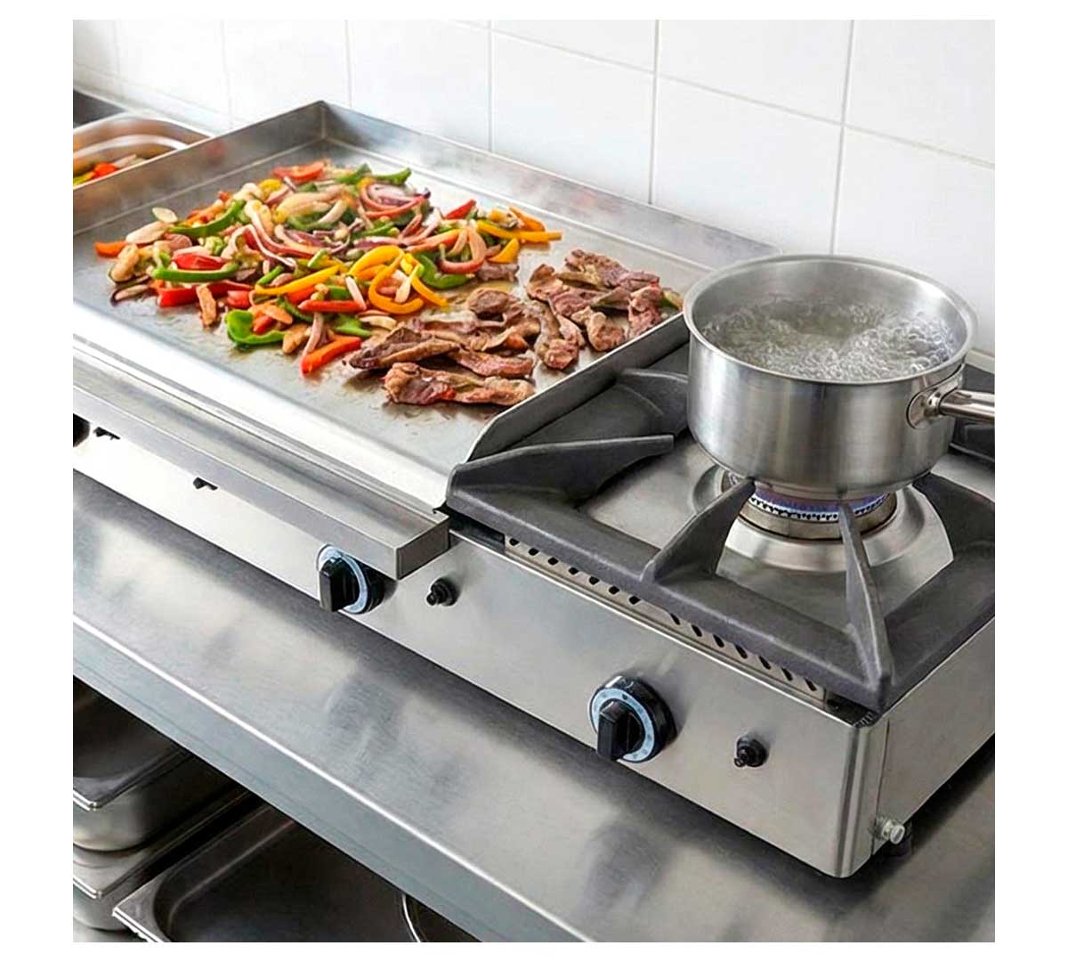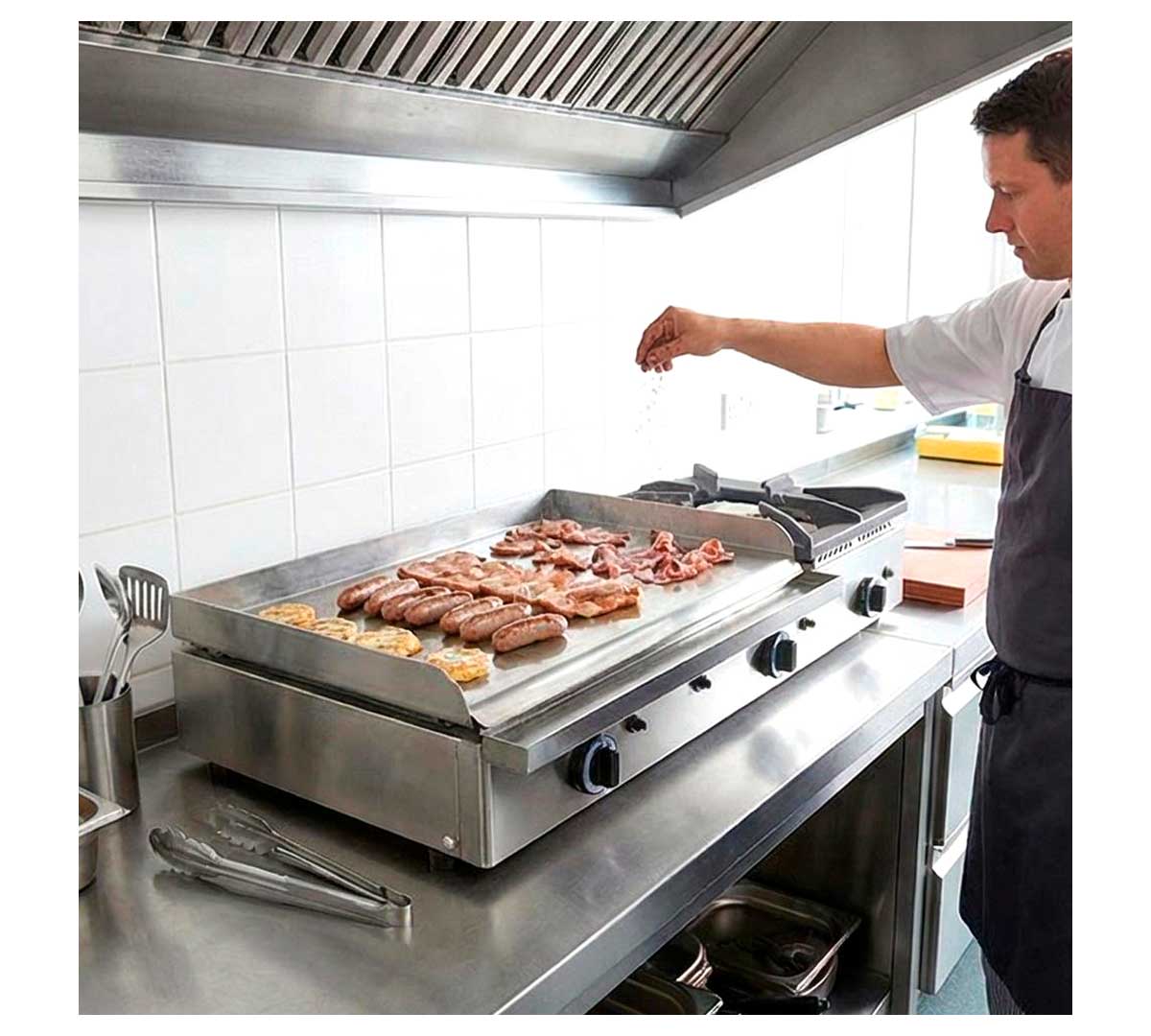 Plancha de cocina a gas con un fogón de gran poder calorífico con una potencia de 5,7 kW. La placa es de cromo duro, con la superficie lisa y tiene un espesor de 10 mm. Se suministra con inyectores para gas butano. También se incluyen los inyectores para cambio a gas natural.
