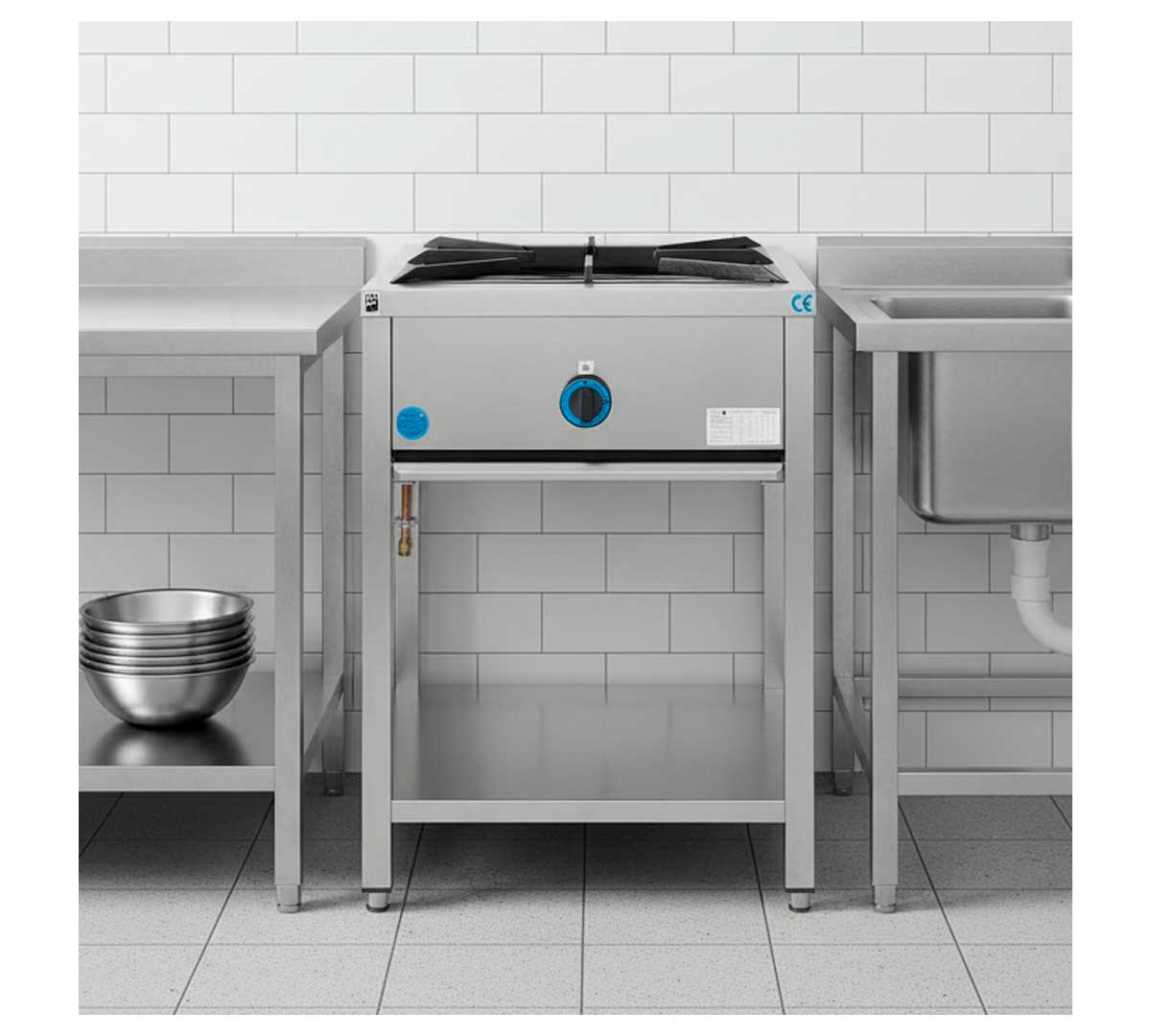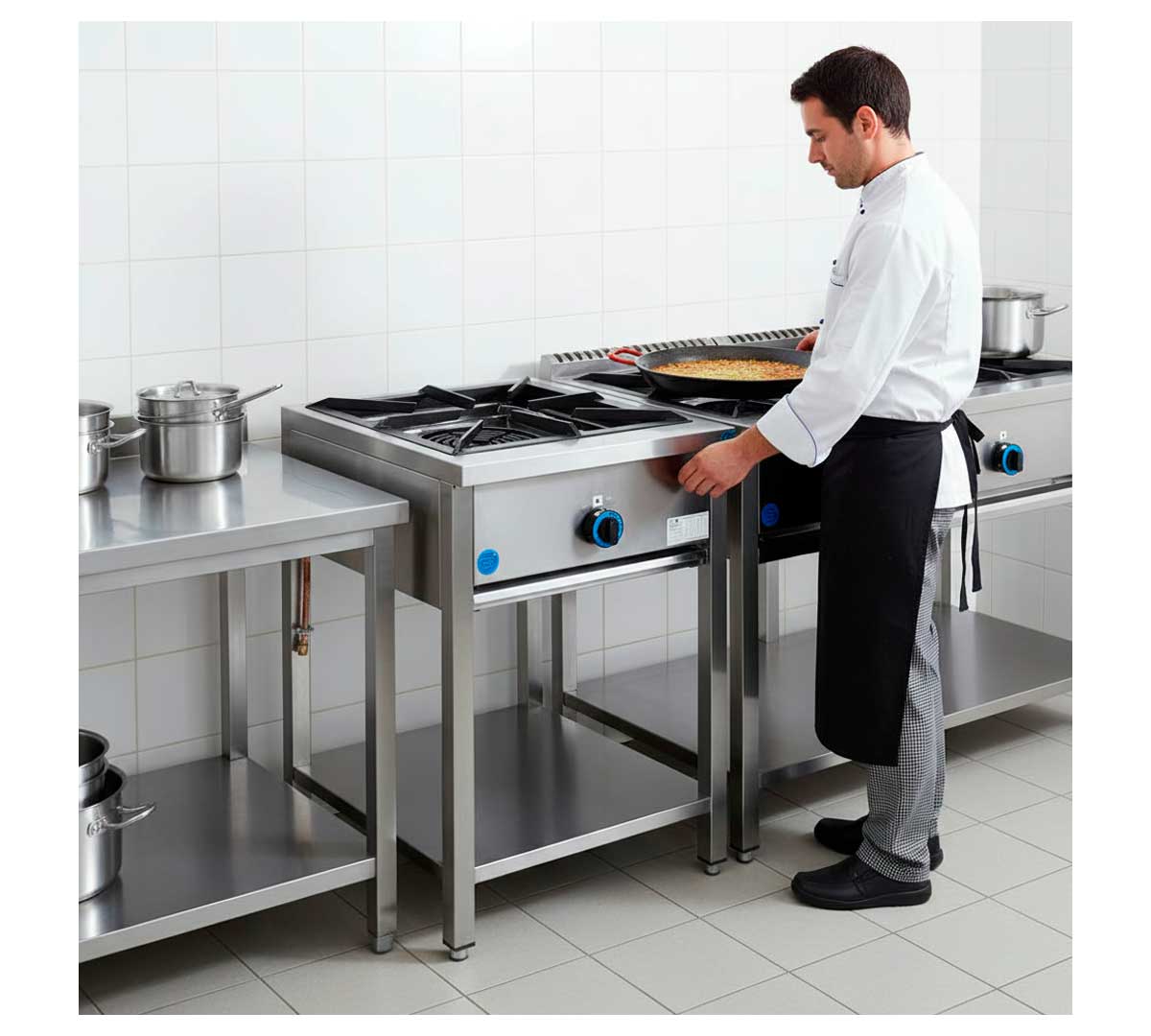 Quemador paellero integrado en mueble de acero cerrado. Modelo a gas y recomendado para interior con válvula de seguridad con termopar. Versatilidad gracias a su posibilidad de uso tanto con gas natural o butano/propano. Quemador paellero Ntgas HQ04 incluido.
