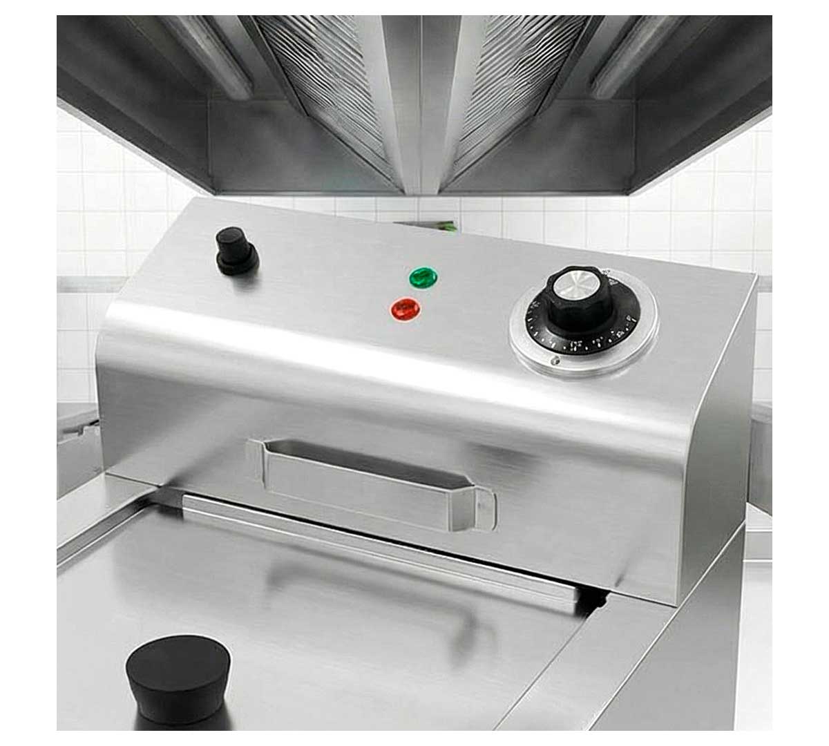 Esta freidora eléctrica, también conocida como sistema de freído, destaca por su construcción íntegra en acero inoxidable AISI 304, lo que garantiza una durabilidad sobresaliente y una limpieza sencilla gracias a sus líneas curvas y acabados pulidos. Su diseño está pensado para facilitar el trabajo diario, permitiendo una preparación rápida y segura de todo tipo de alimentos fritos.