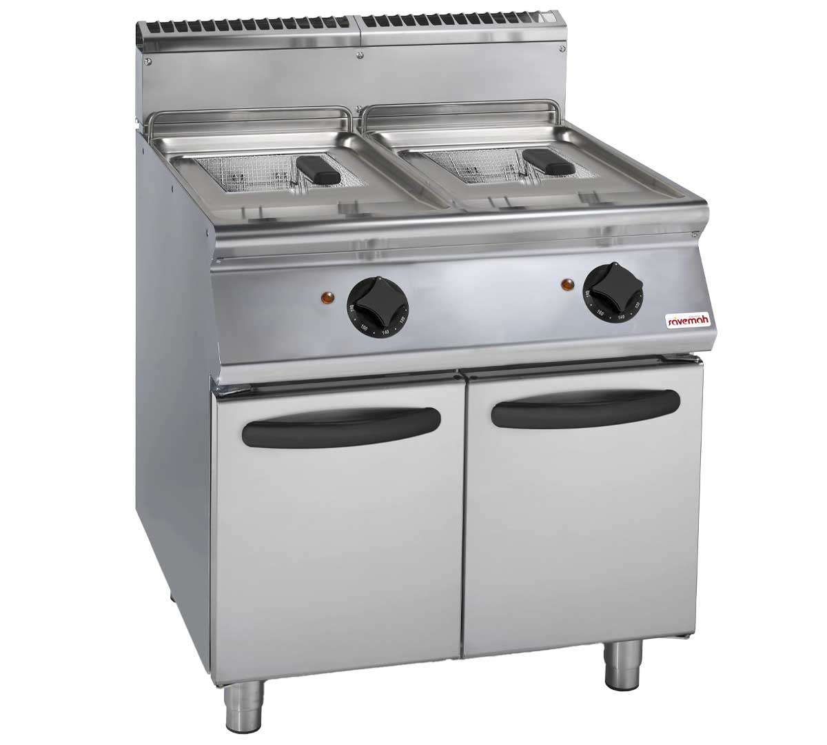 Estas freidoras a gas de 2 cubas con mueble abierto forman parte de la Serie 700 modular, conocida por su fondo unificado de 700 mm y su sólida construcción profesional.