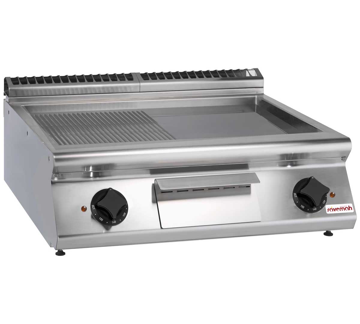 Placa mixta de gran superficie en acero, con zona lisa y ranurada. Encimera en acero inoxidable. Con sistema de recogida de grasas eficiente y regulación precisa de temperatura. Ofrece fácil limpieza y es apto para su uso intensivo en cocinas profesionales.