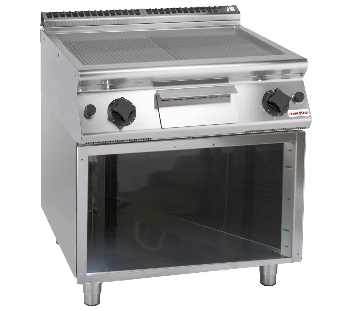Placa ranurada de acero con encimera en acero inoxidable AISI 304. Tiene canal y cajón recoge-grasas. Con inclinación para evacuación de grasas y regulación precisa mediante válvula de seguridad.
