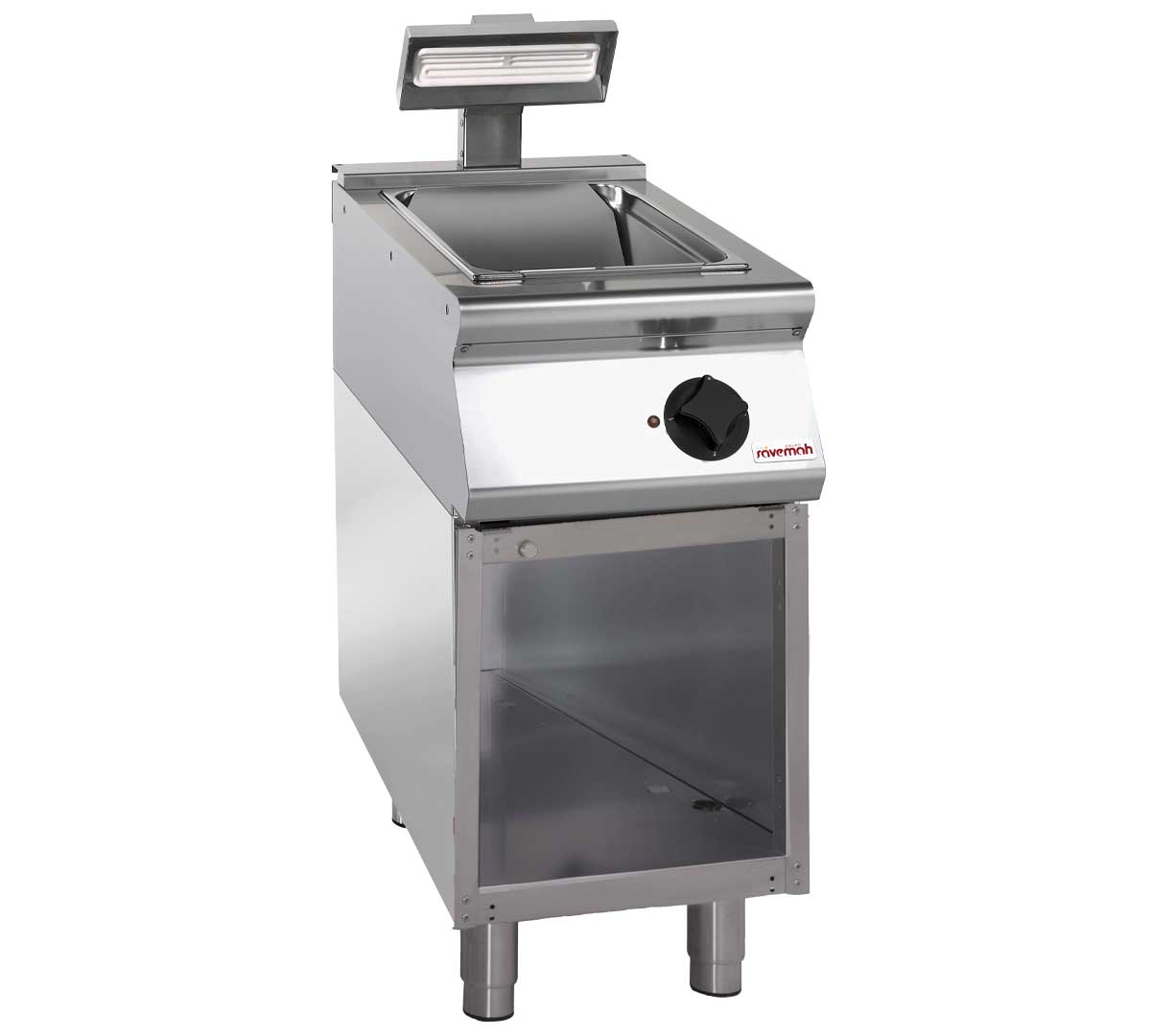 Mantenedor eléctrico con encimera y cuba GN 1/1 en acero inoxidable, calentamiento por resistencia cerámica de rayos infrarrojos y señalización de funcionamiento. Fabricación robusta y fácil limpieza.