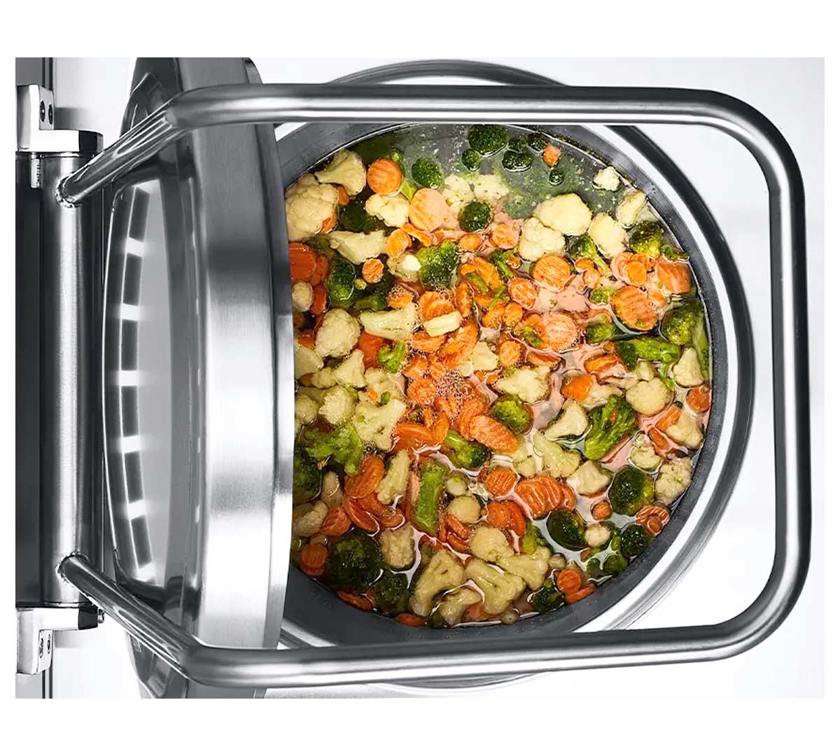 Esta marmita eléctrica de gran capacidad es perfecta para la cocción de sopas, caldos, cremas, salsas, pastas, verduras y todo tipo de preparaciones líquidas o semilíquidas que requieran un control suave y homogéneo del calor.