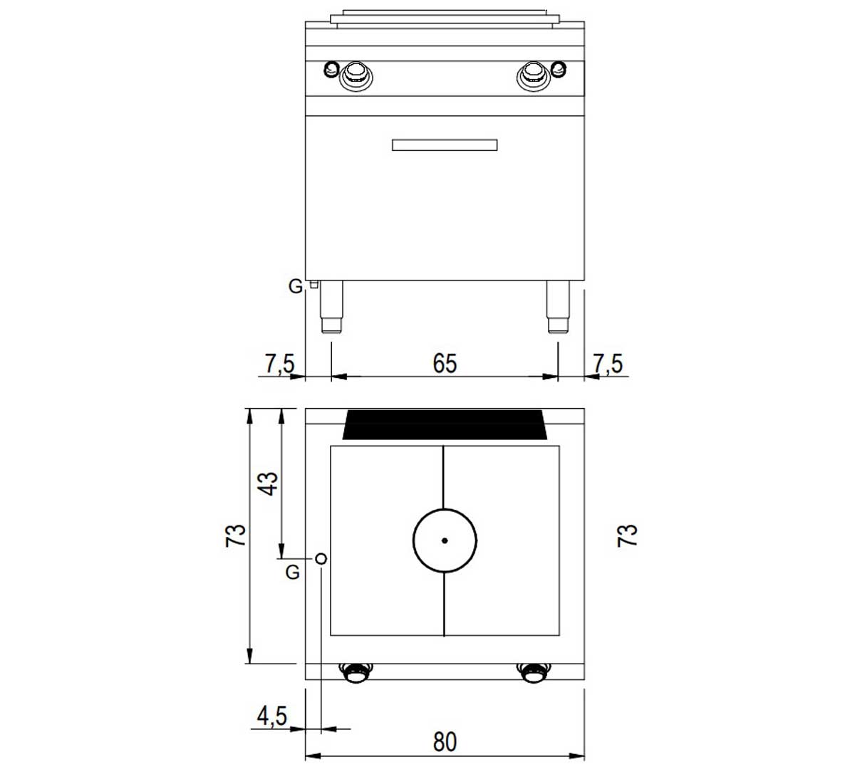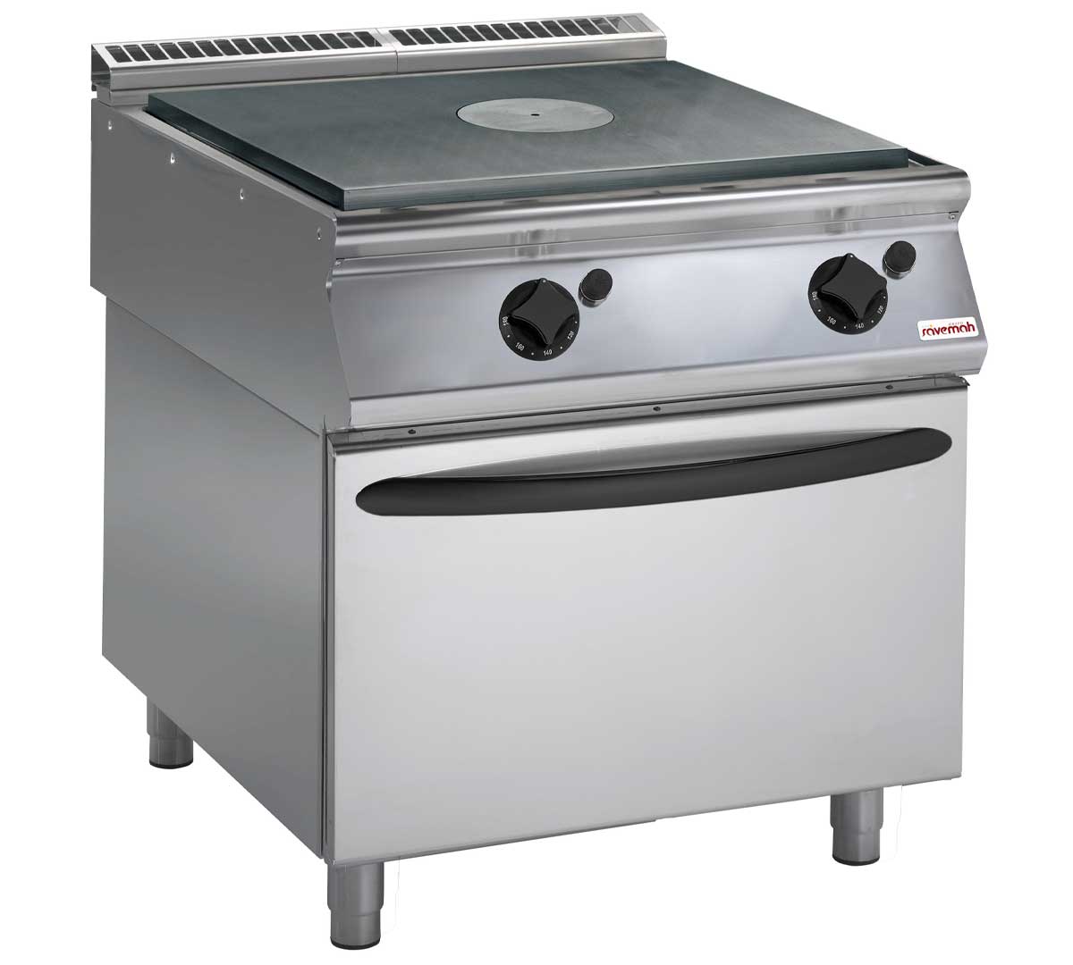 Cocina modular con placa radiante de gran espesor y horno a gas. Fabricada en acero inoxidable AISI 304. Ofrece alta potencia, robustez y control preciso de temperatura para una máxima eficiencia.