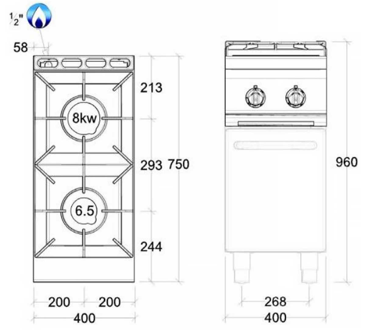Gama de cocina diseñada para una máxima combinación de trabajo con seguridad y funcionalidad. Fabricada en acero inoxidable, con parrilla en hierro fundido y encimera de 2 mm de espesor. Tiene dos fogones de alta potencia y un mueble soporte en módulo de 40 cm de ancho y 75 cm de fondo.