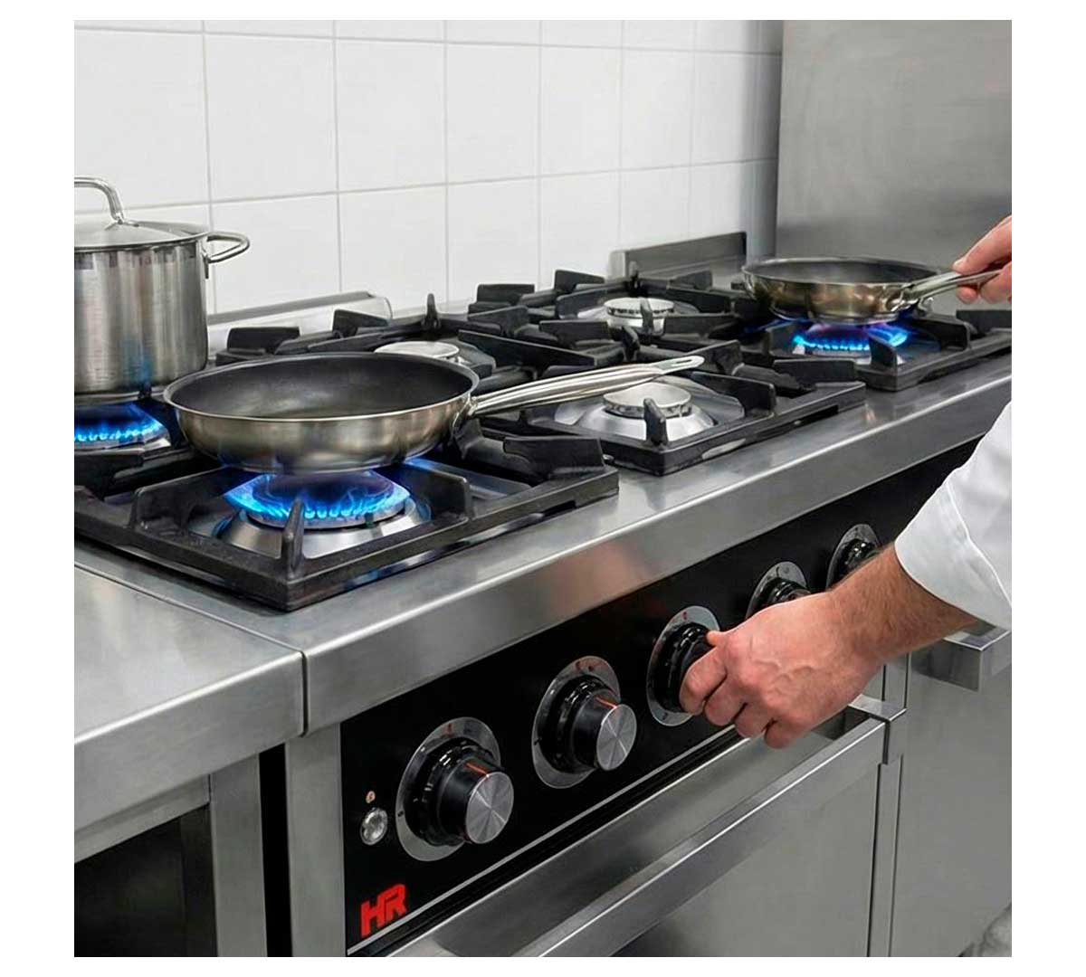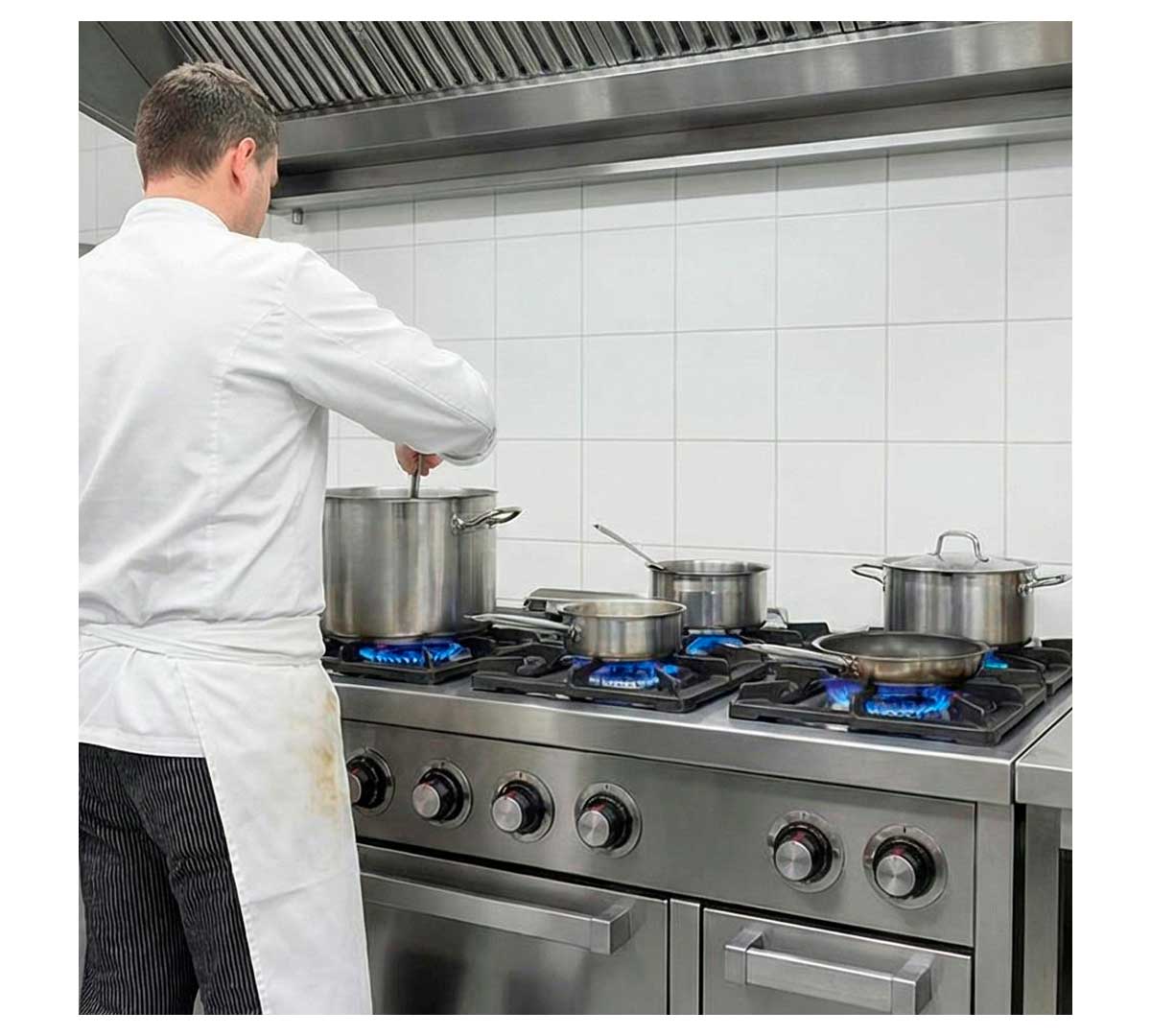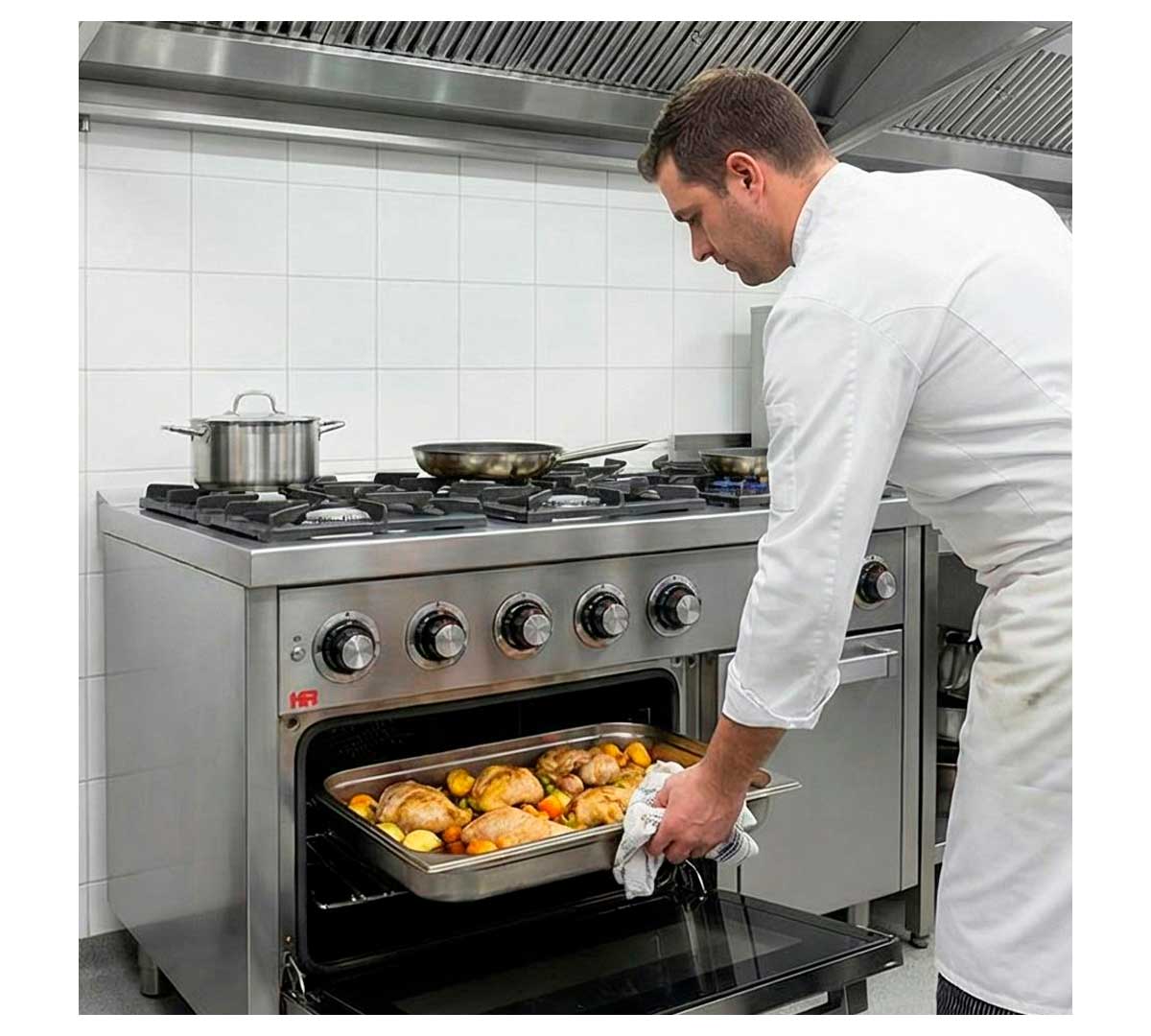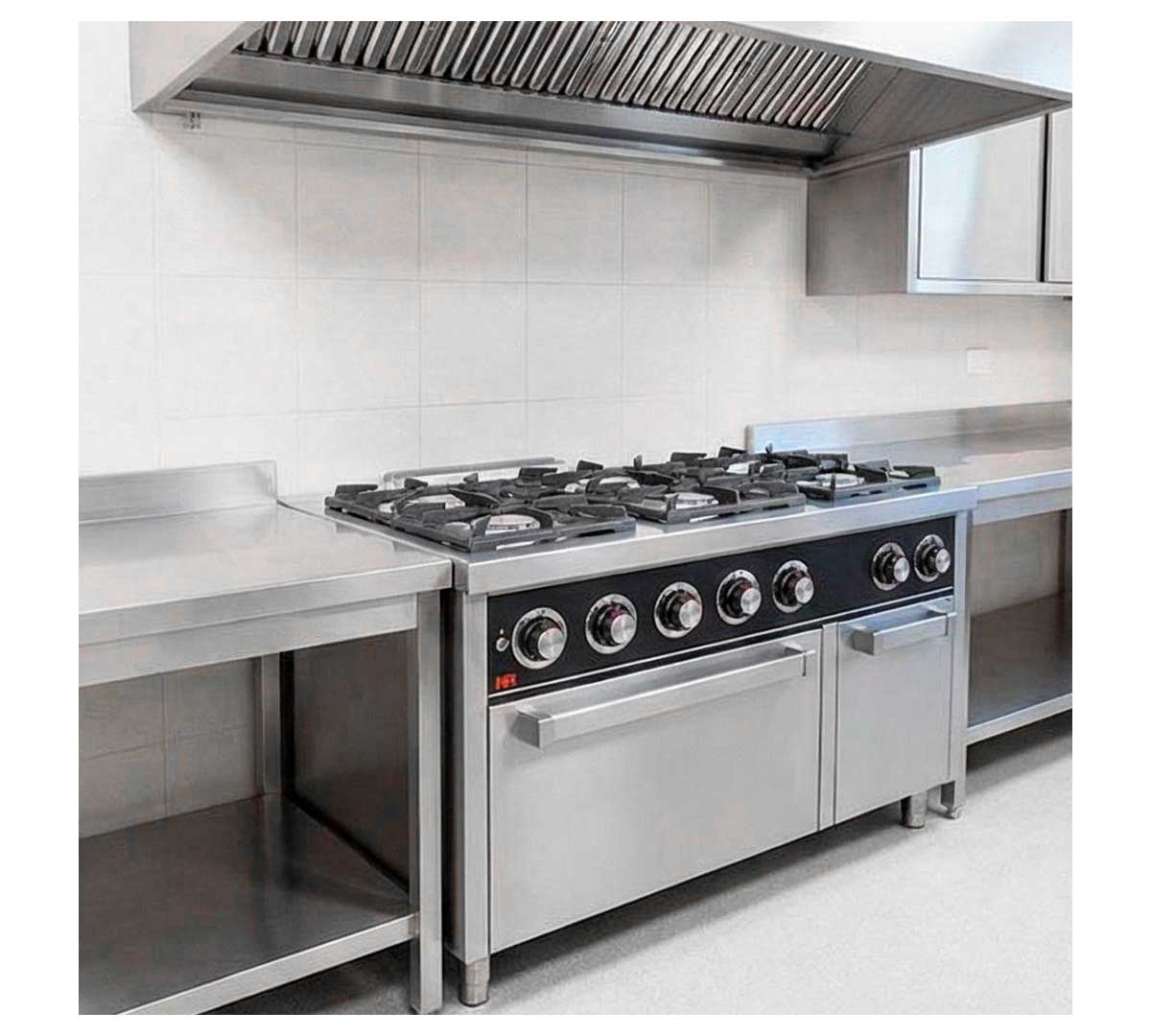 La Cocina Serie 750 con Horno a Gas de Fainca HR es de alto rendimiento. Tiene 6 fogones e incluye horno Gastronorm 2/1.